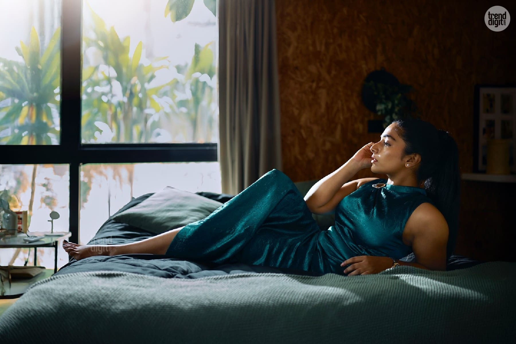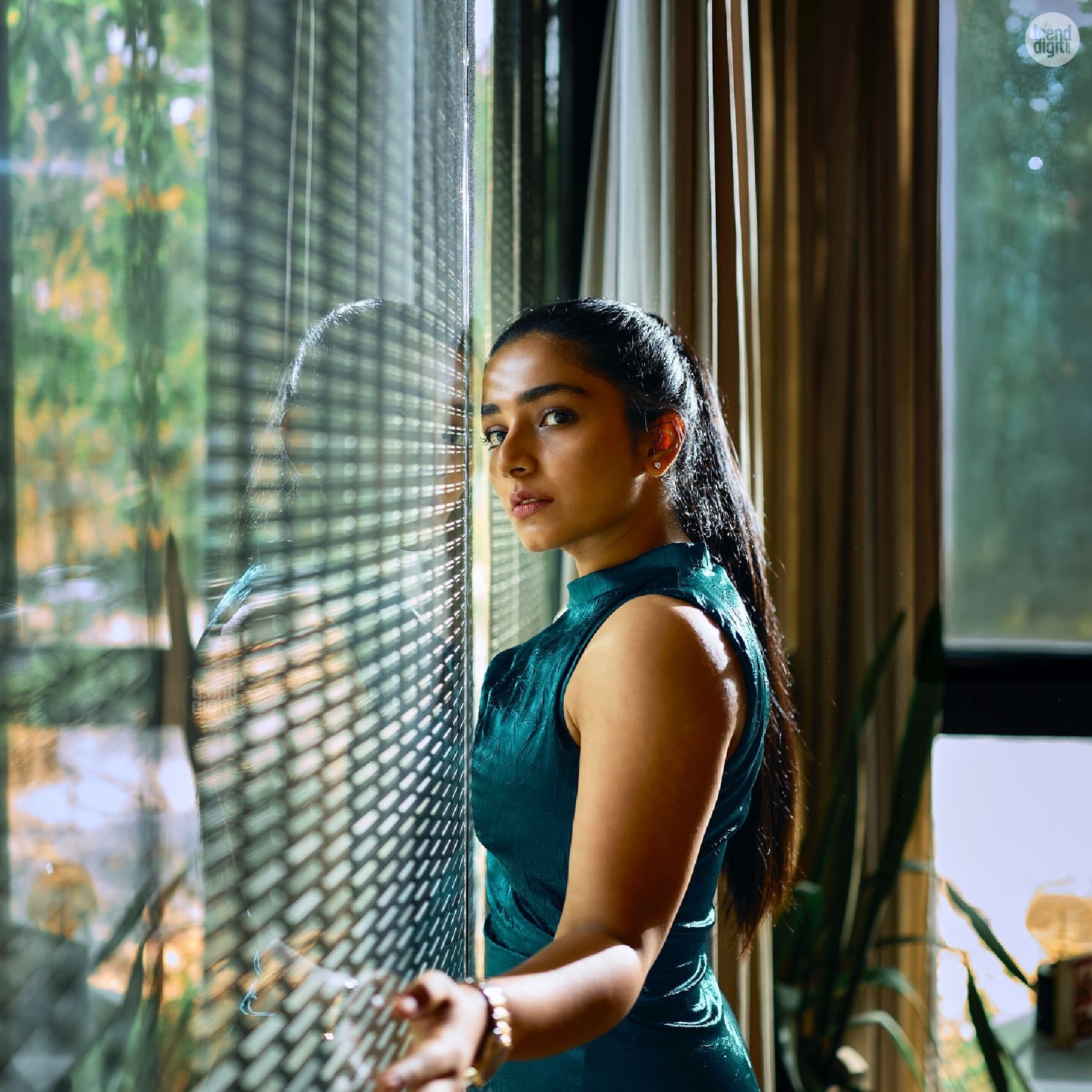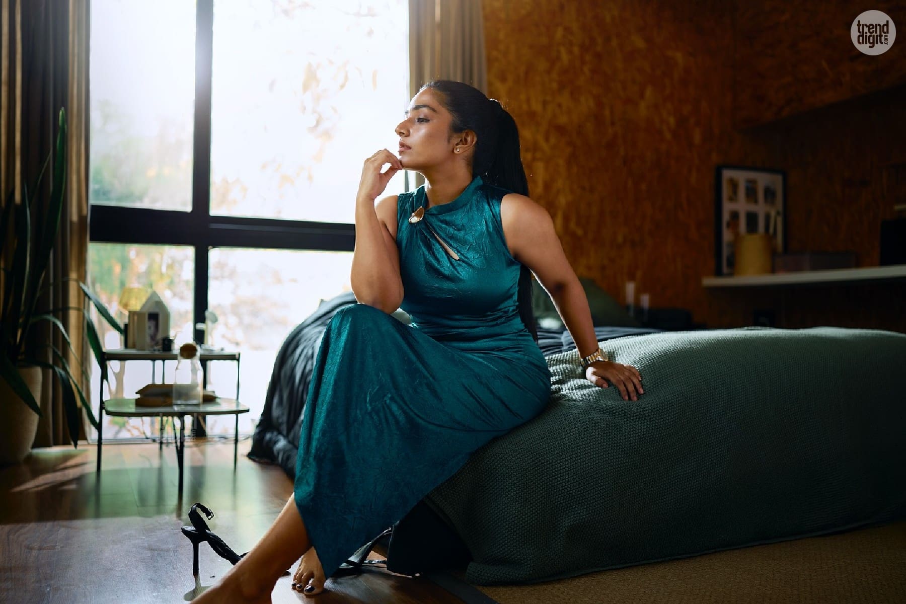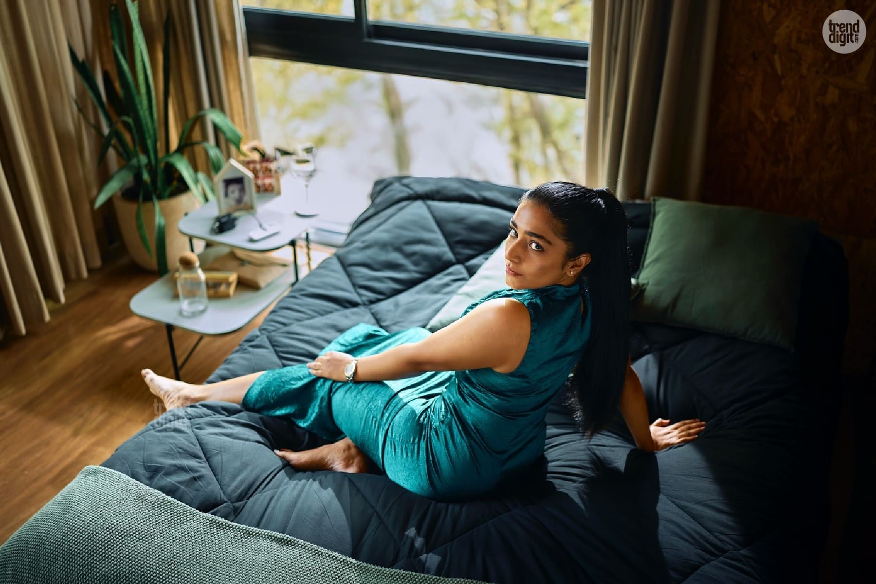 Rajisha Vijayan embraces understated sophistication in this indoor editorial shoot. Set against a warm, modern bedroom backdrop with wooden flooring, muted décor, and large windows allowing natural light to stream in, the atmosphere feels intimate and cinematic.