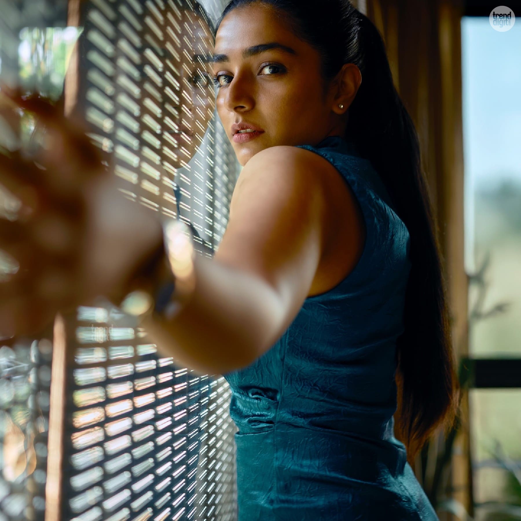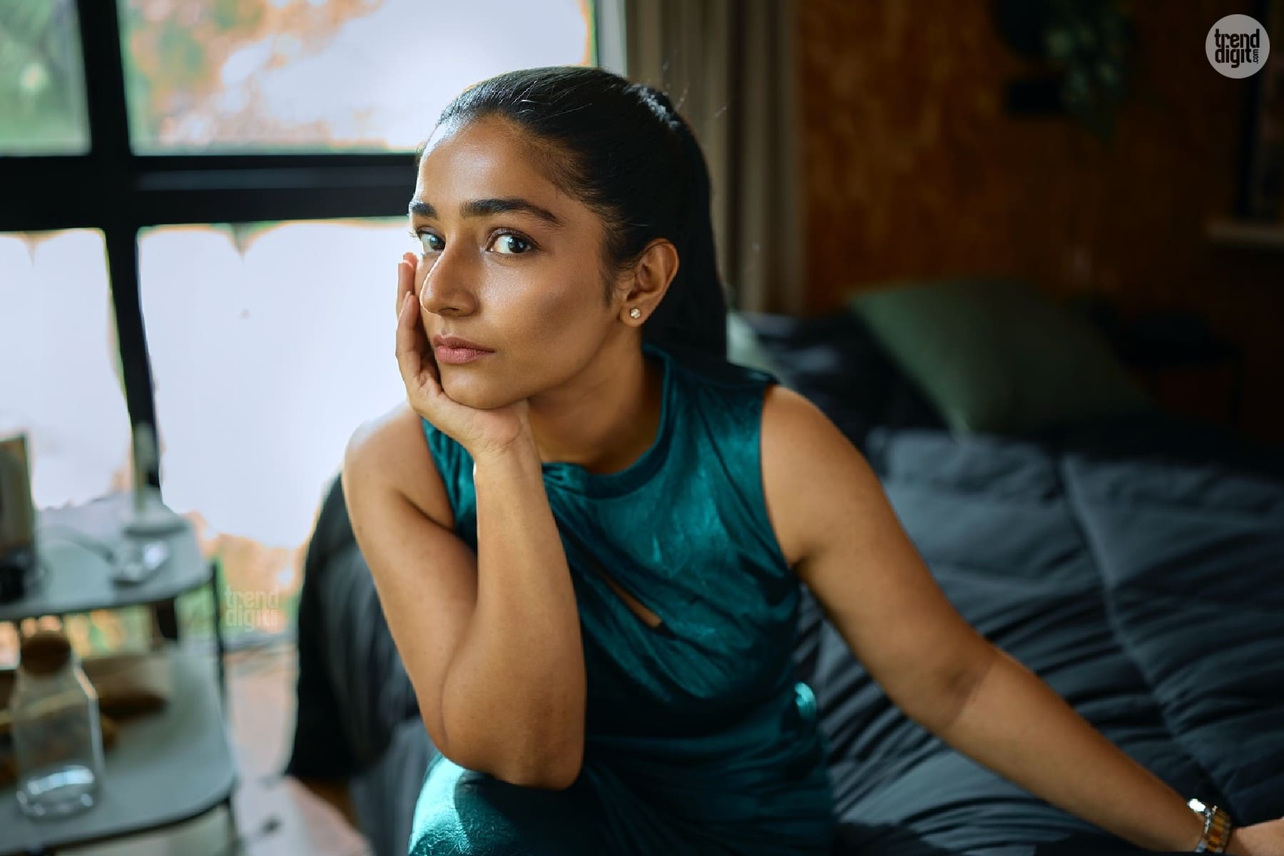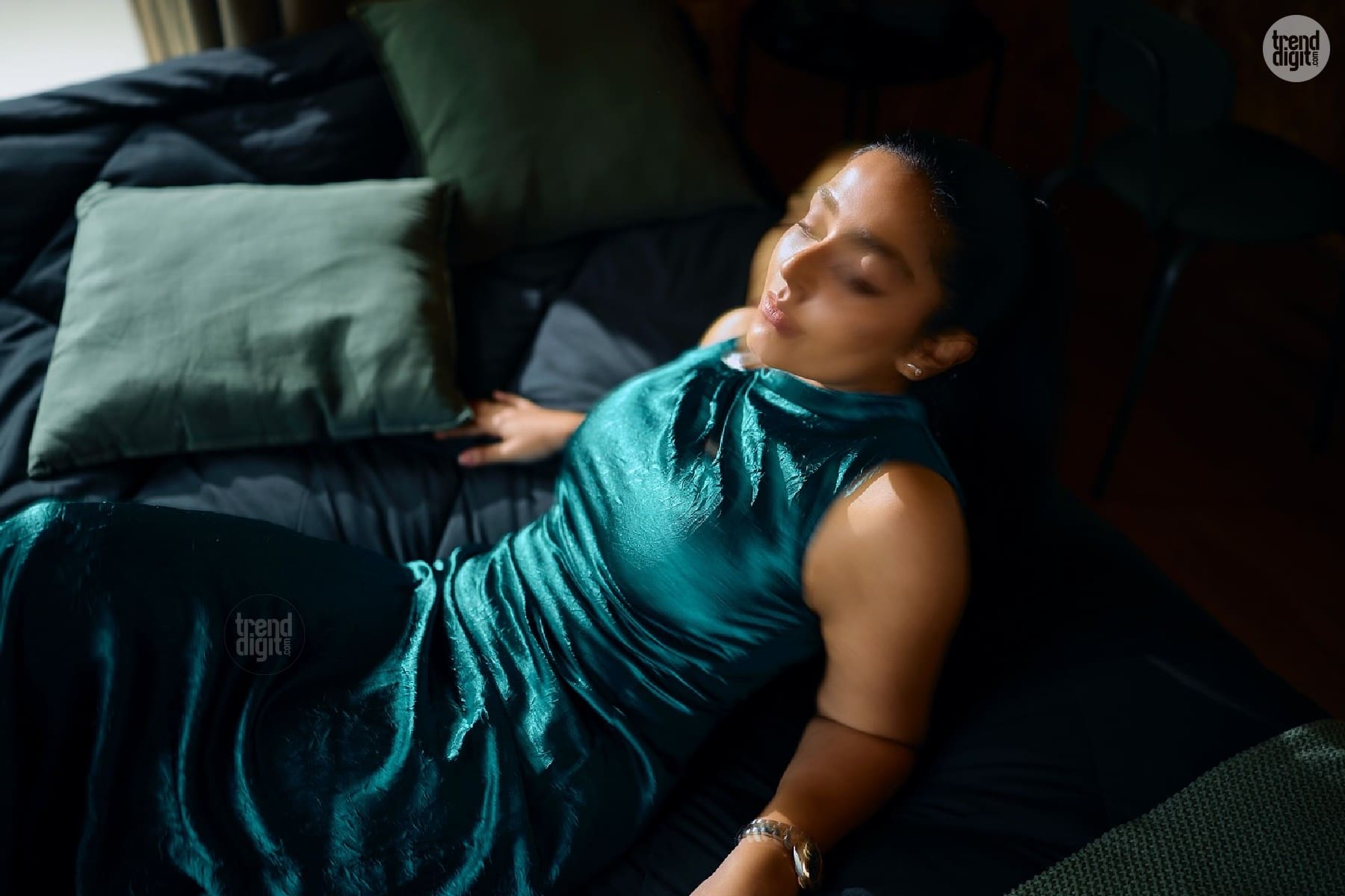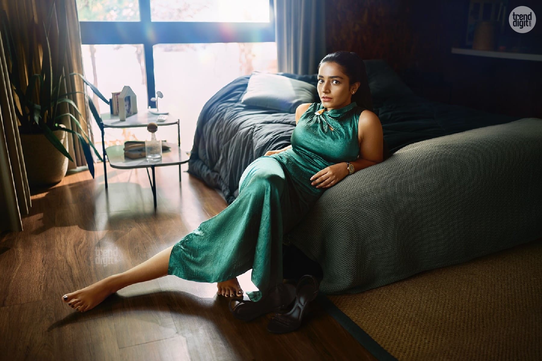 Rajisha Vijayan embraces understated sophistication in this indoor editorial shoot. Set against a warm, modern bedroom backdrop with wooden flooring, muted décor, and large windows allowing natural light to stream in, the atmosphere feels intimate and cinematic.