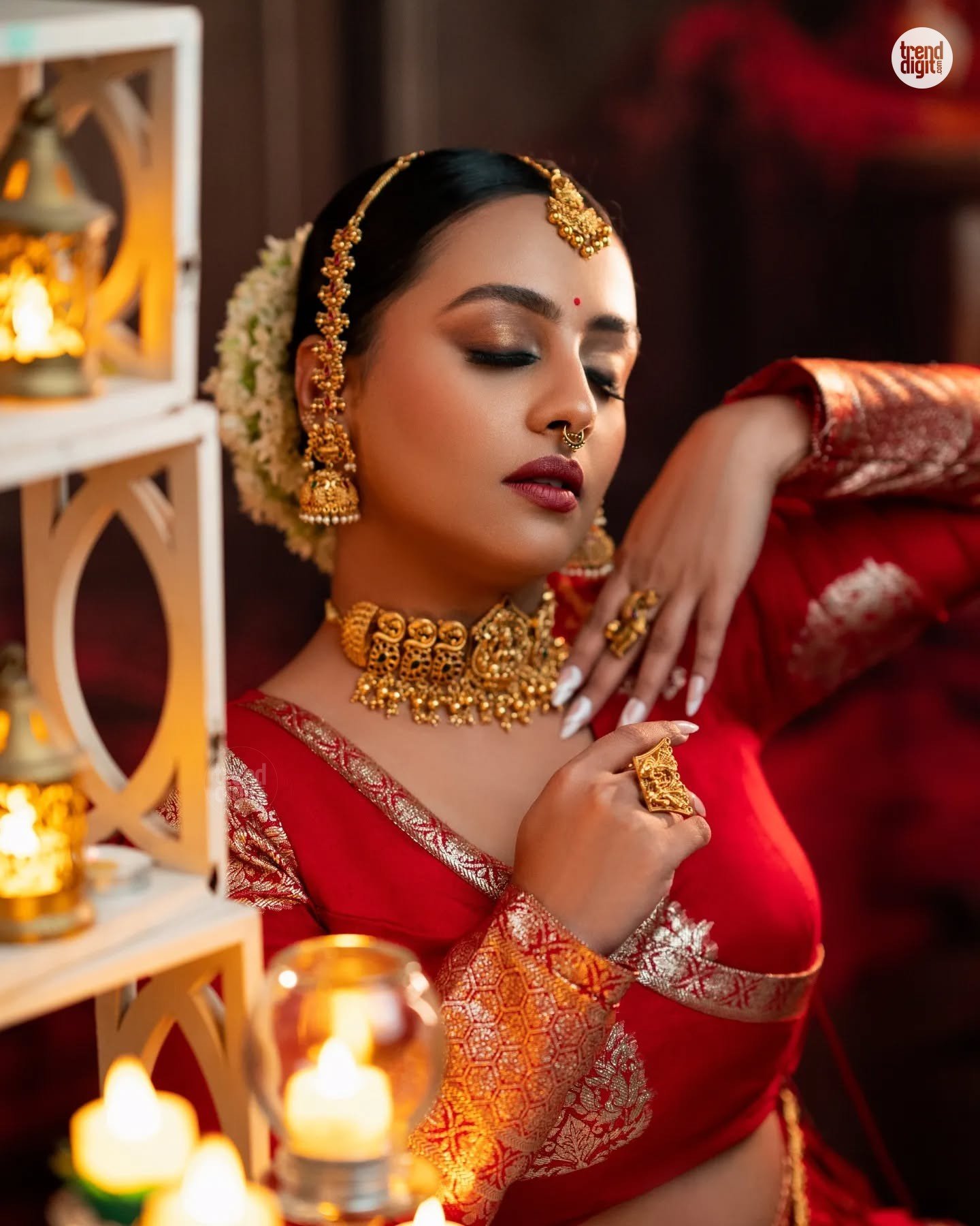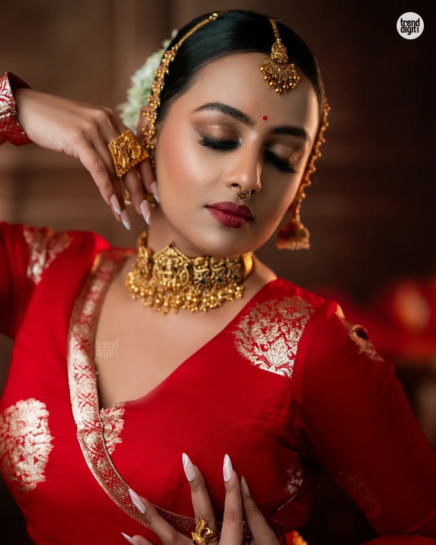 This look resonates for its traditional grandeur and intricate detailing. The coordinated gold accents elevate the red palette, creating a cohesive festive portrait aesthetic.