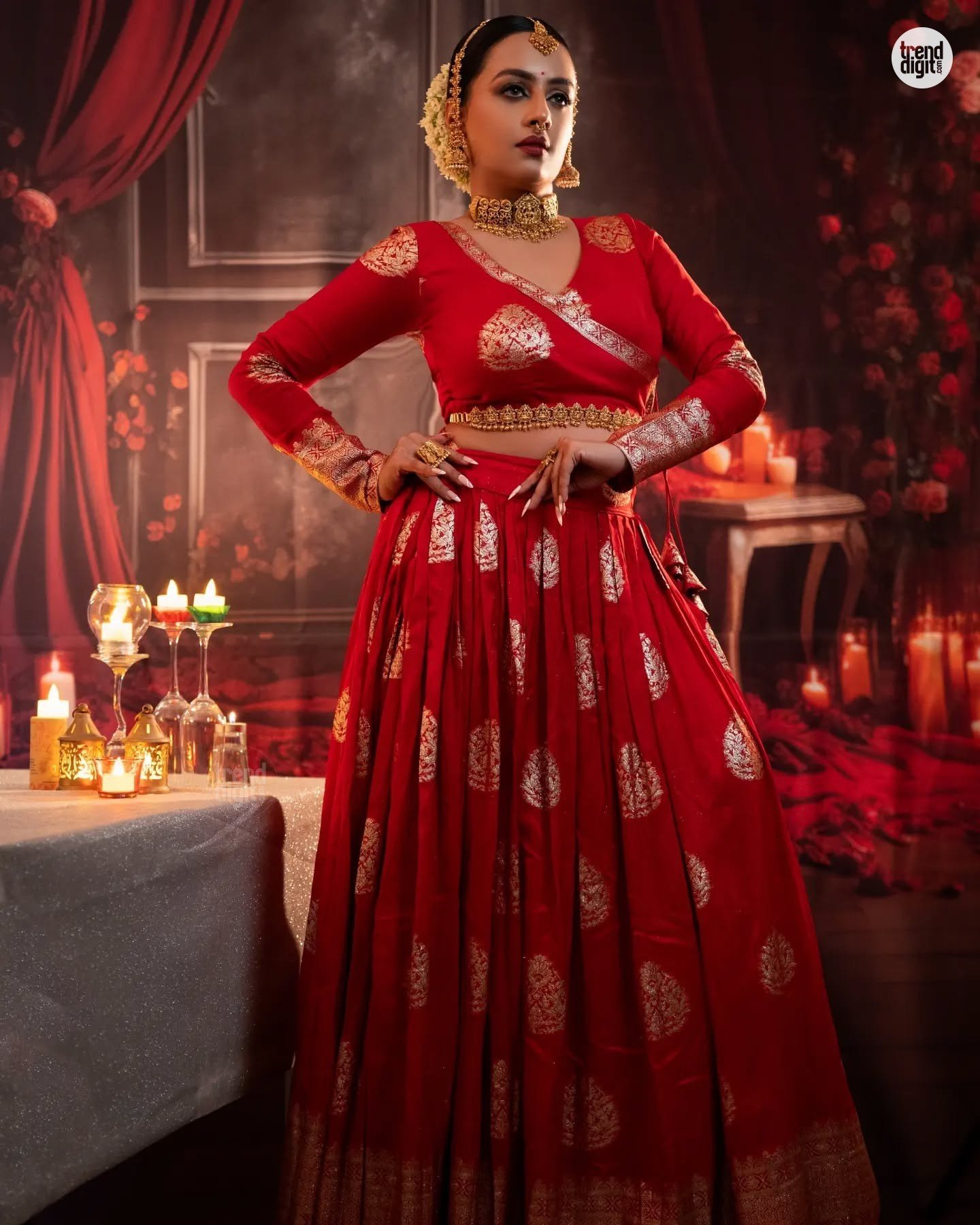 Ranjani is an Indian digital creator based in India. This photoshoot featuring the Ranjani Red Lehenga Set is captured indoors in a styled studio environment with dramatic warm lighting and candle accents. The backdrop enhances the regal composition.