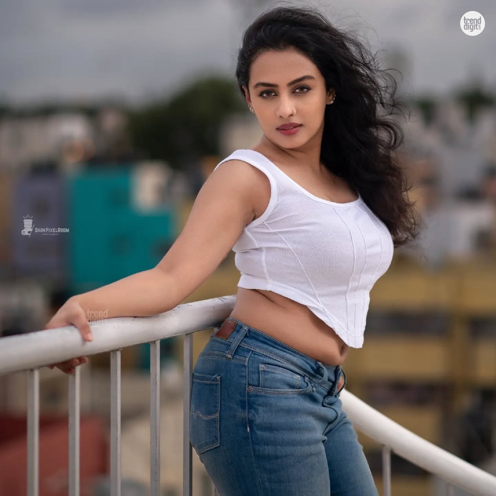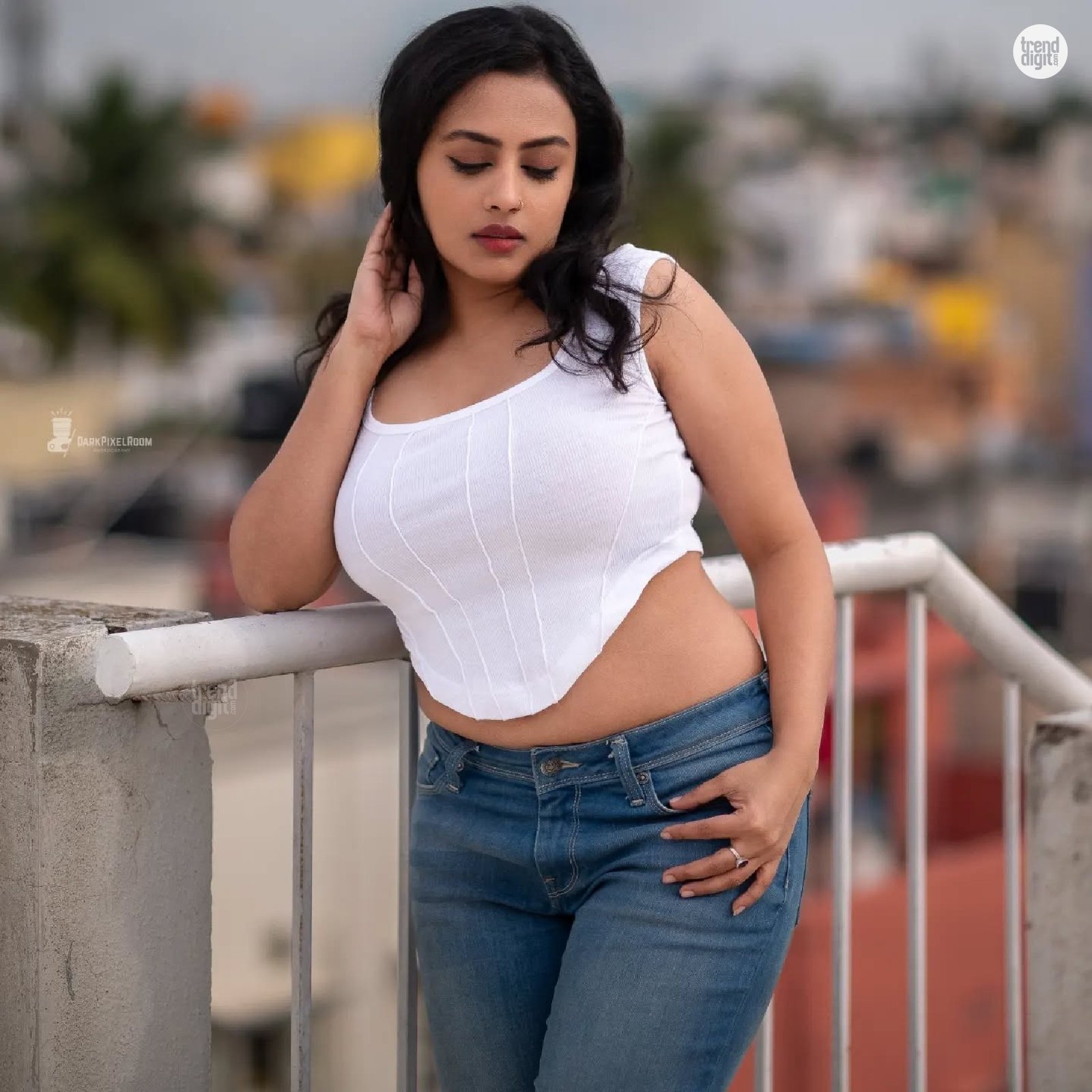 Ranjani is an Indian Digital Creator based in India. This photoshoot featuring the Ranjani White Ribbed Crop Top is captured on a rooftop setting using natural daylight with a soft urban skyline backdrop. The outdoor environment adds depth while maintaining a clean visual frame.