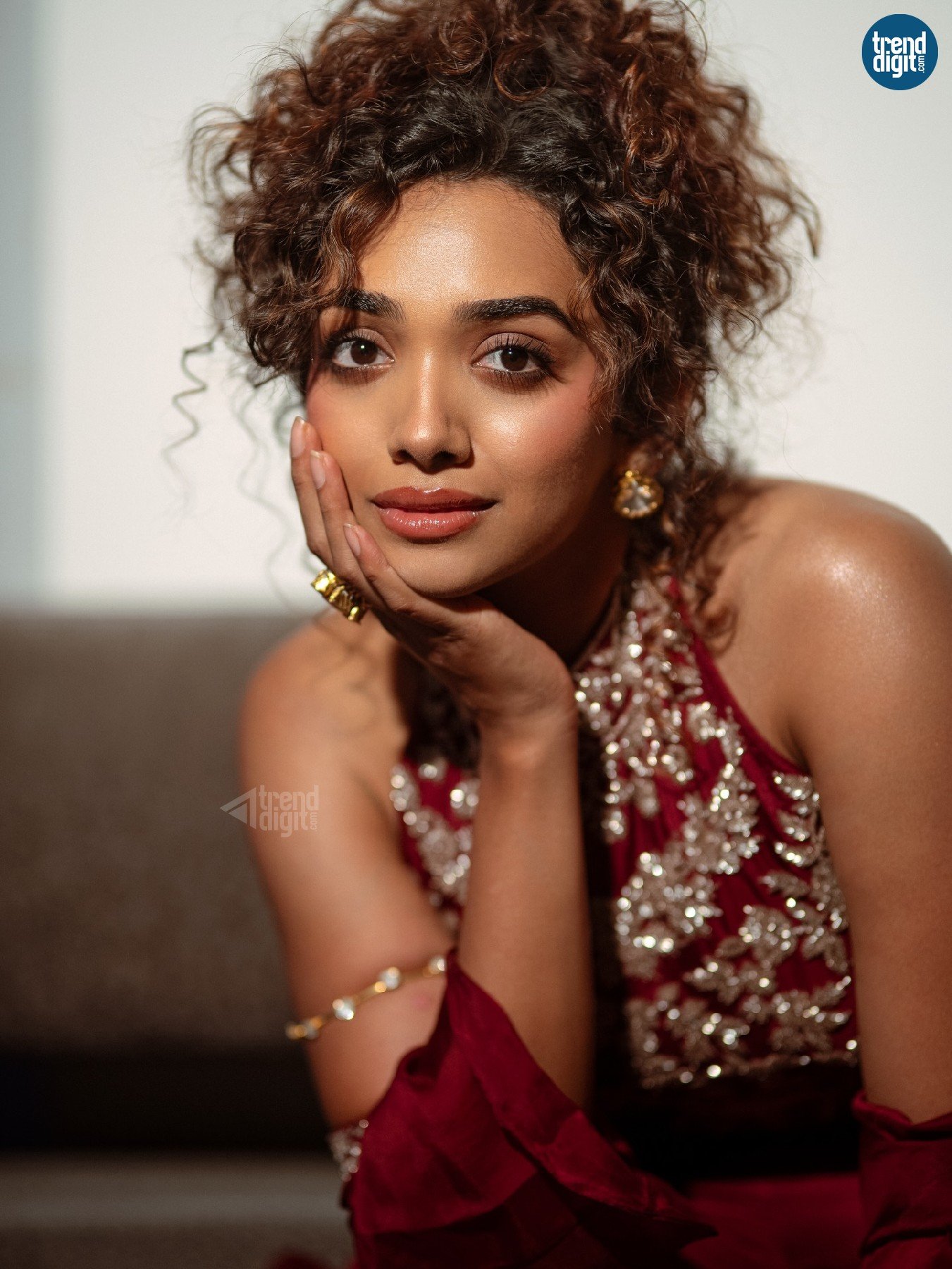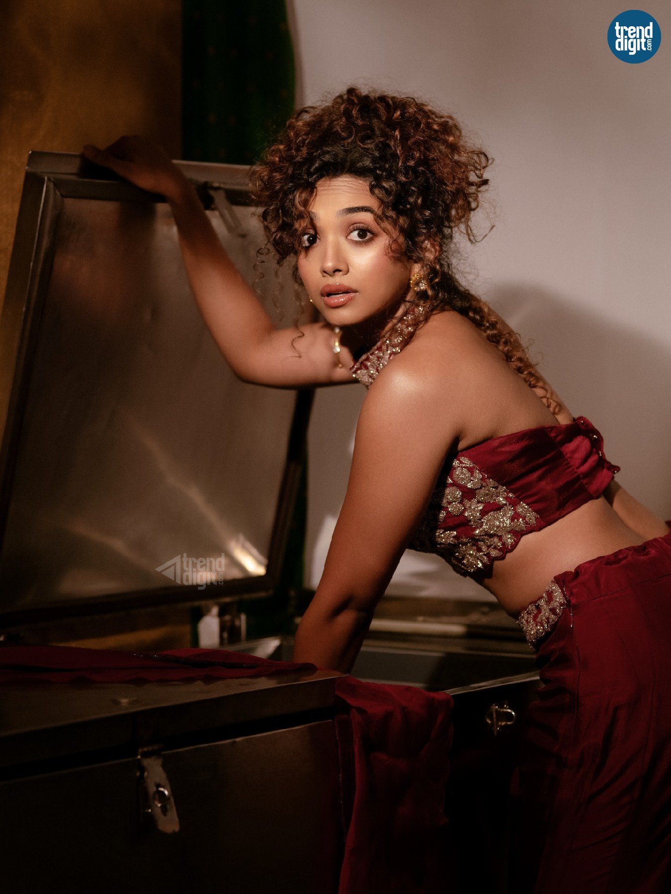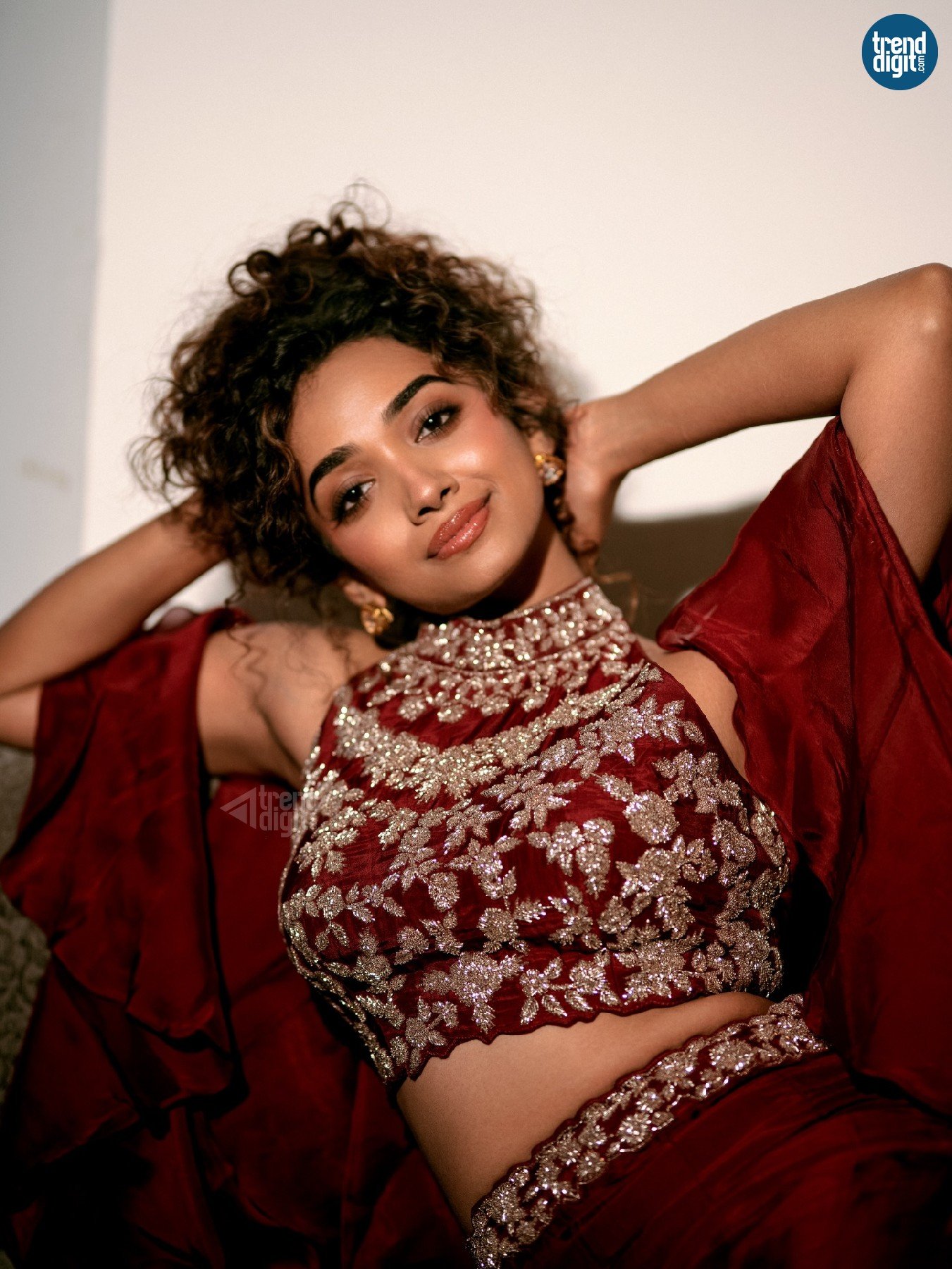 Saanve Megghana, an Indian actor, is featured in this indoor editorial shoot wearing a maroon embroidered lehenga set. The environment is styled with contrasting elements, creating a composed yet expressive visual tone.
