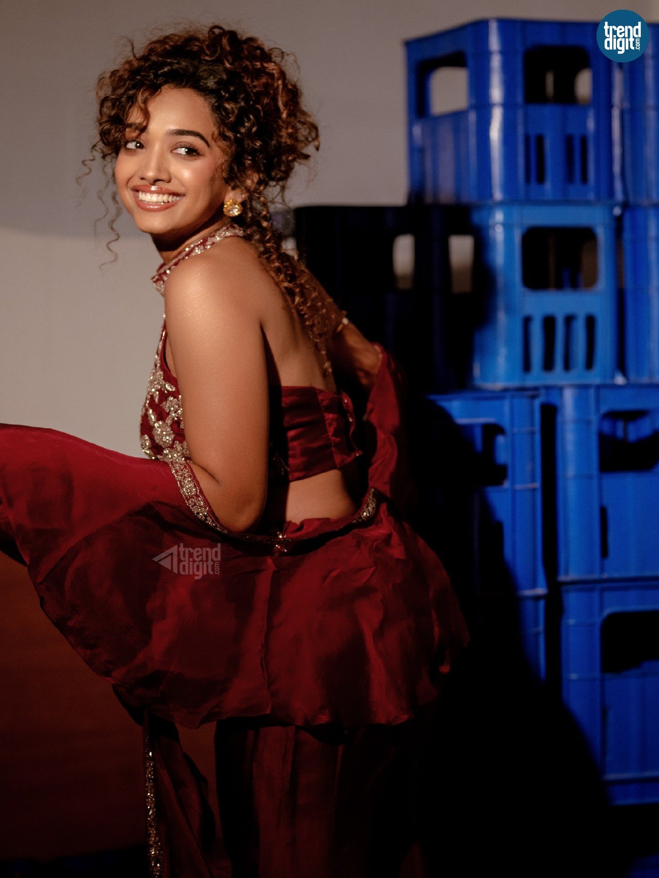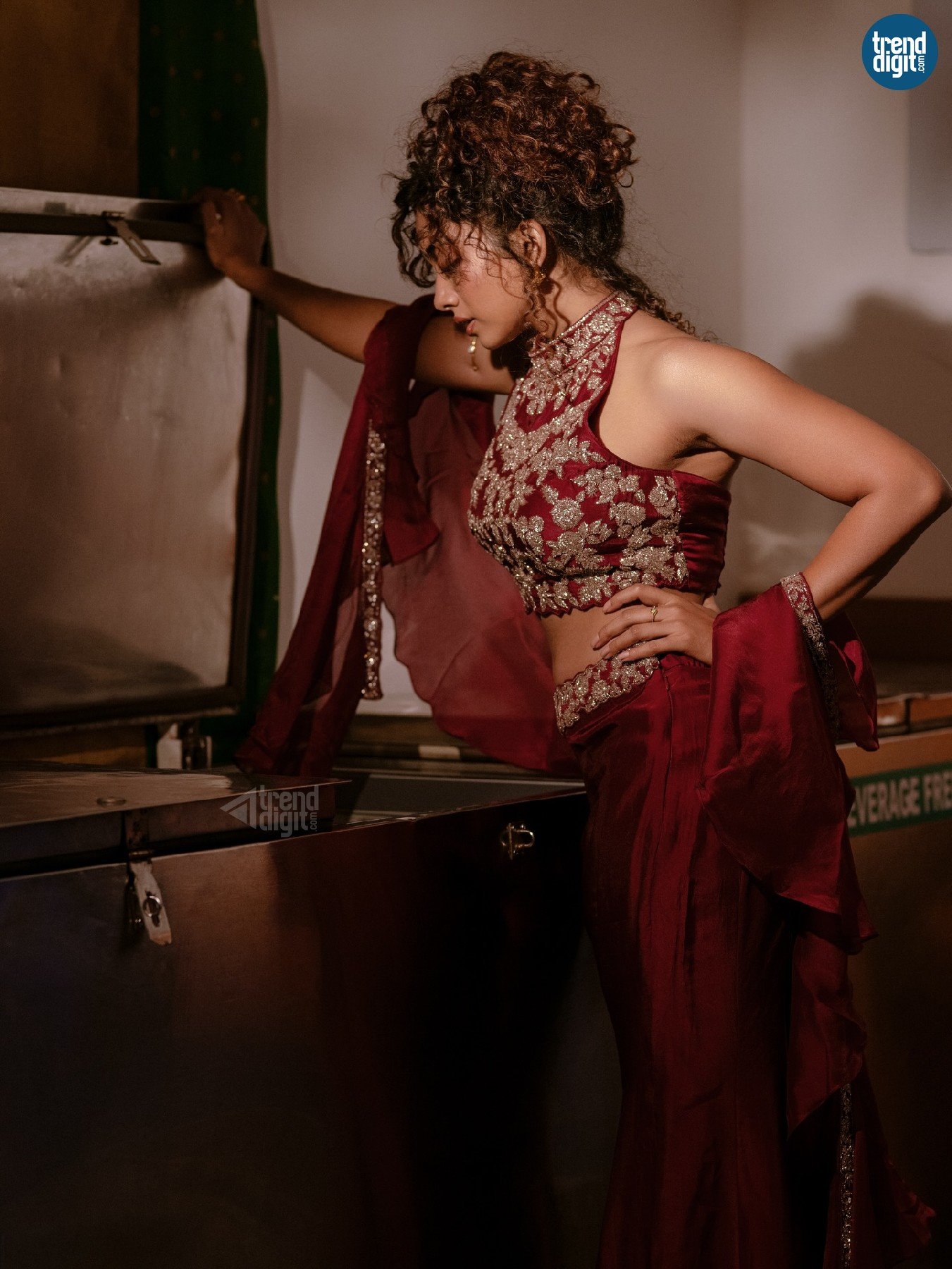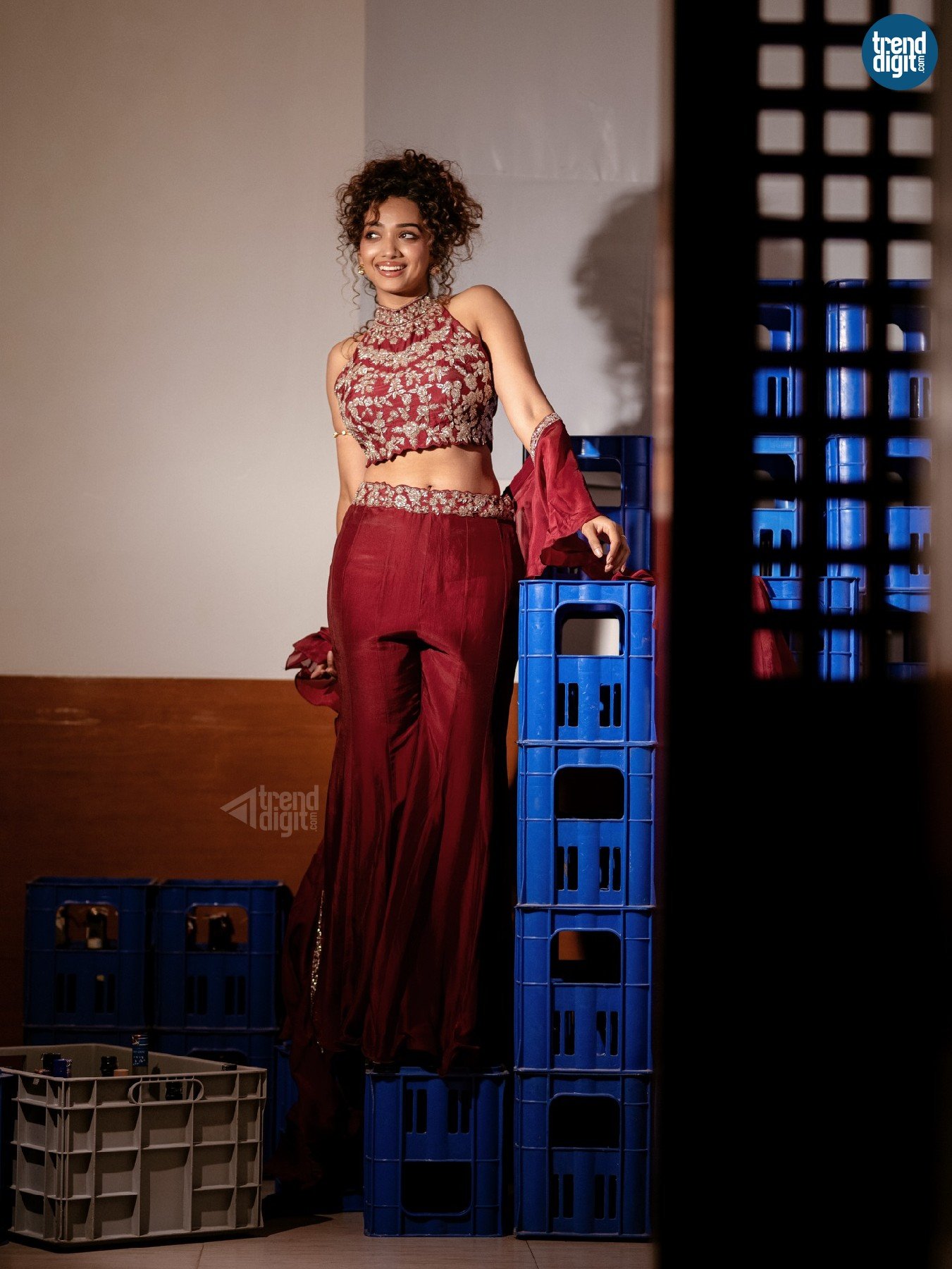 Saanve Megghana, an Indian actor, is featured in this indoor editorial shoot wearing a maroon embroidered lehenga set. The environment is styled with contrasting elements, creating a composed yet expressive visual tone.