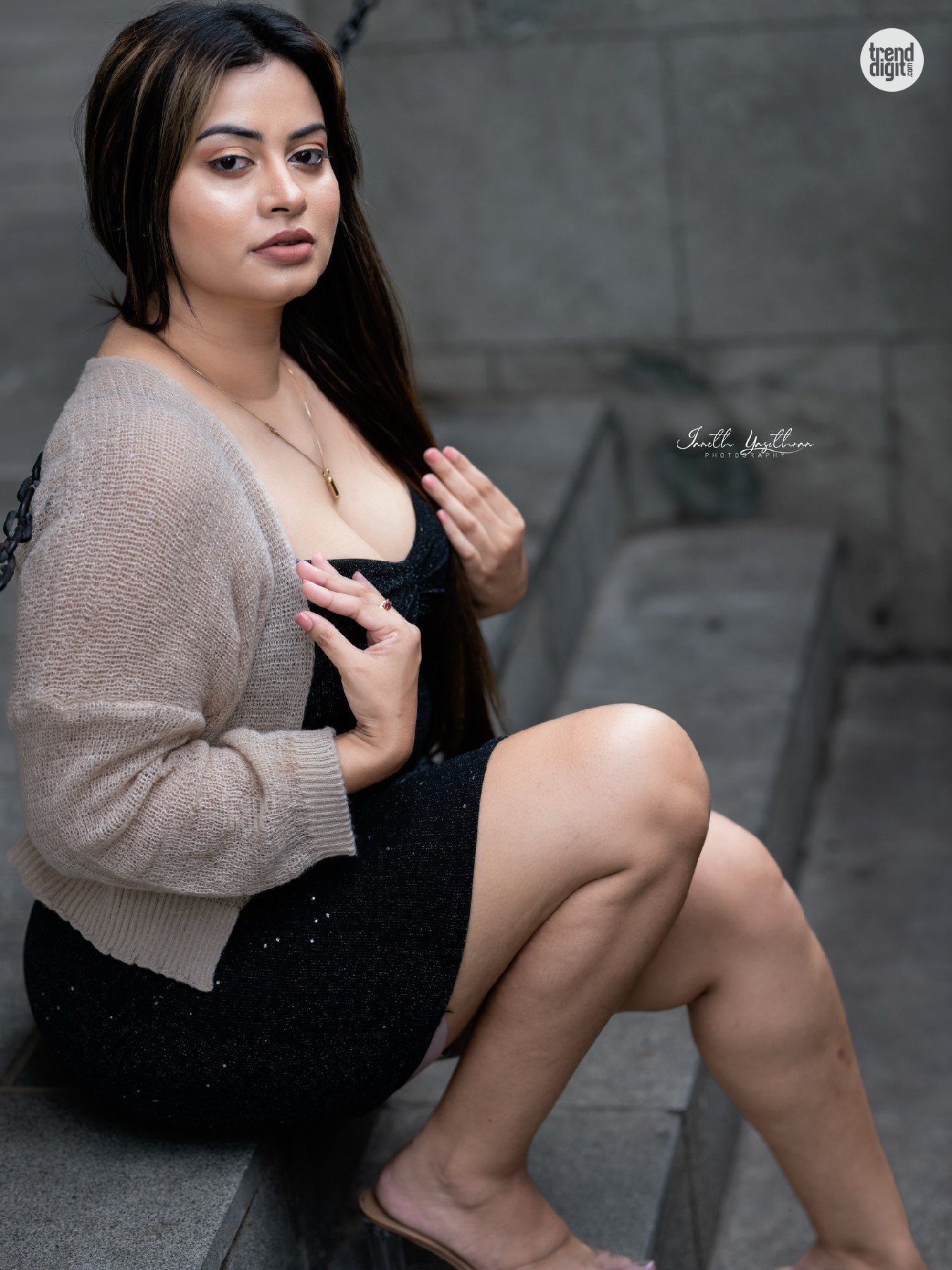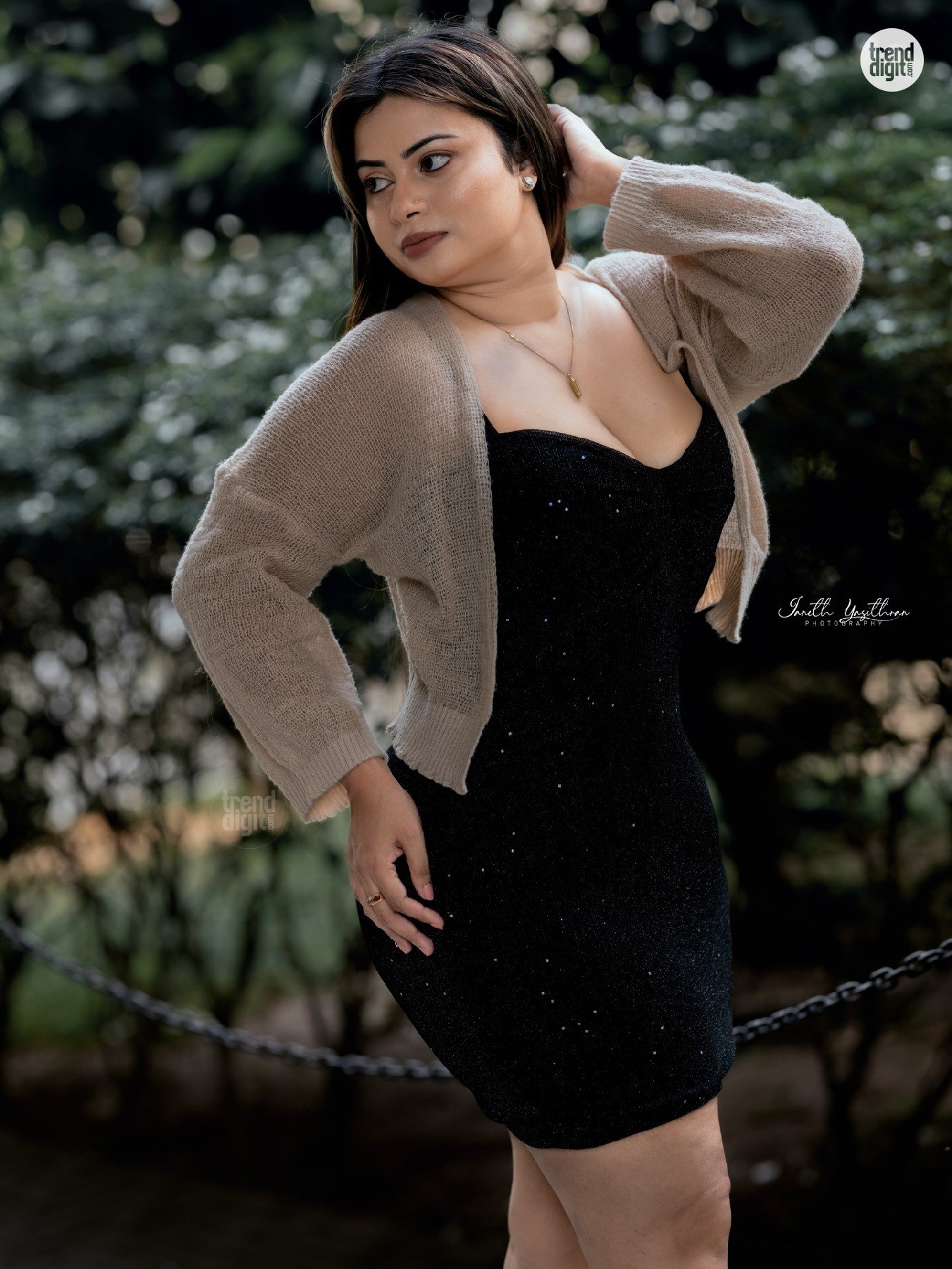 The outfit’s appeal comes from its effortless styling and balanced layering. The black mini dress paired with a neutral cardigan creates a versatile look that fits casual evening outings, social gatherings, or relaxed fashion portraits.