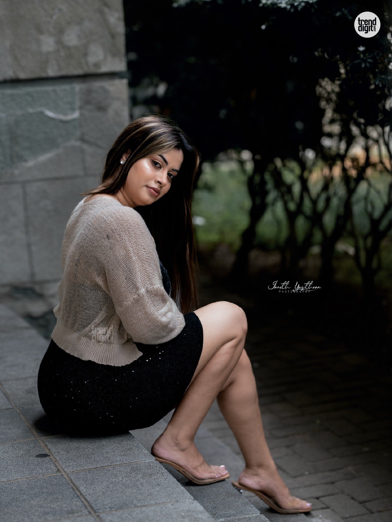 Sarah Sangz is a Sri Lankan model and beauty pageant titleholder associated with Colombo, Sri Lanka. This photoshoot featuring the Sarah Sangz Black Mini Dress is captured in an outdoor urban corridor setting using soft natural daylight and architectural lines in the background. The setting gives the shoot a clean modern lifestyle aesthetic.