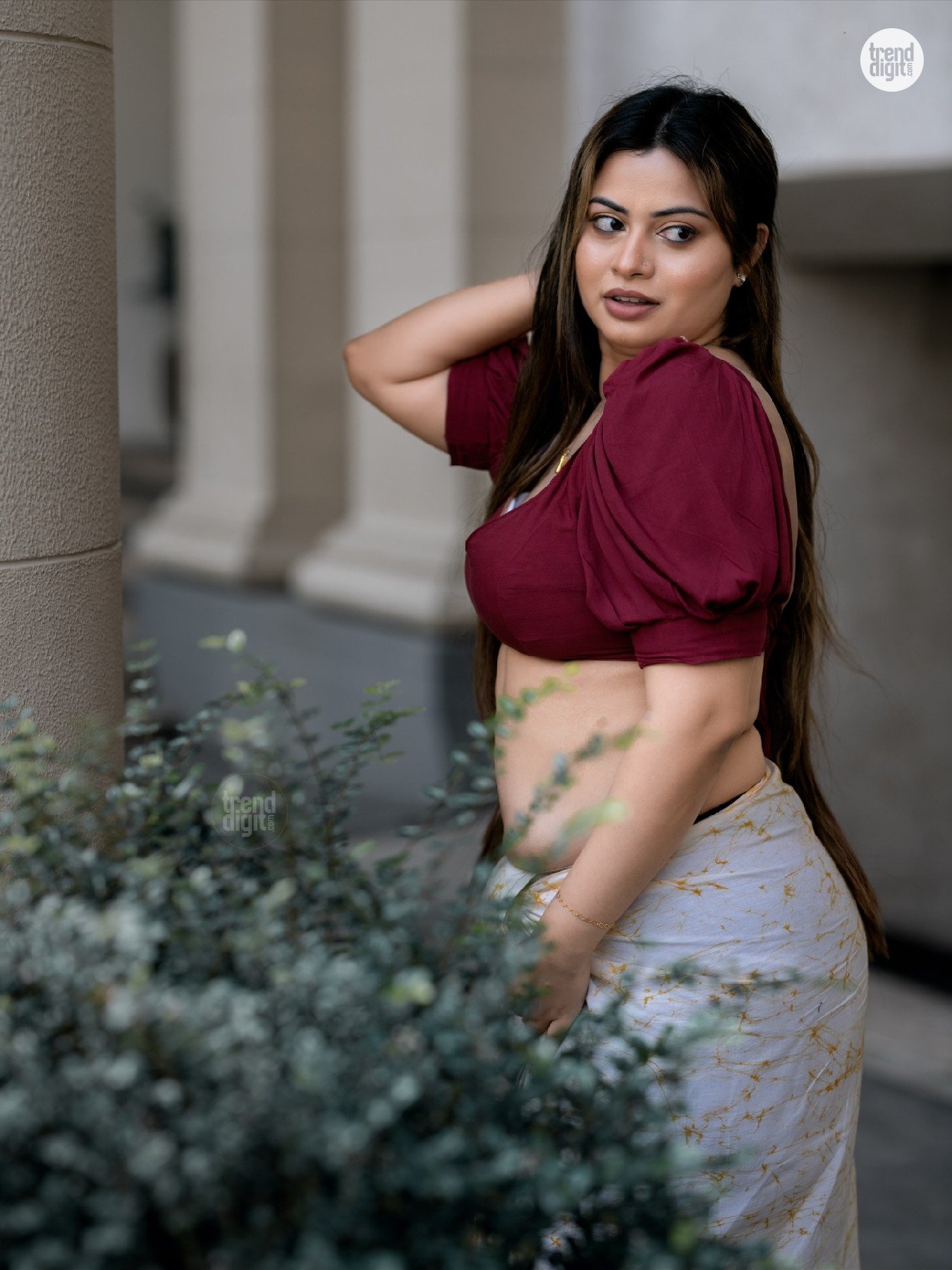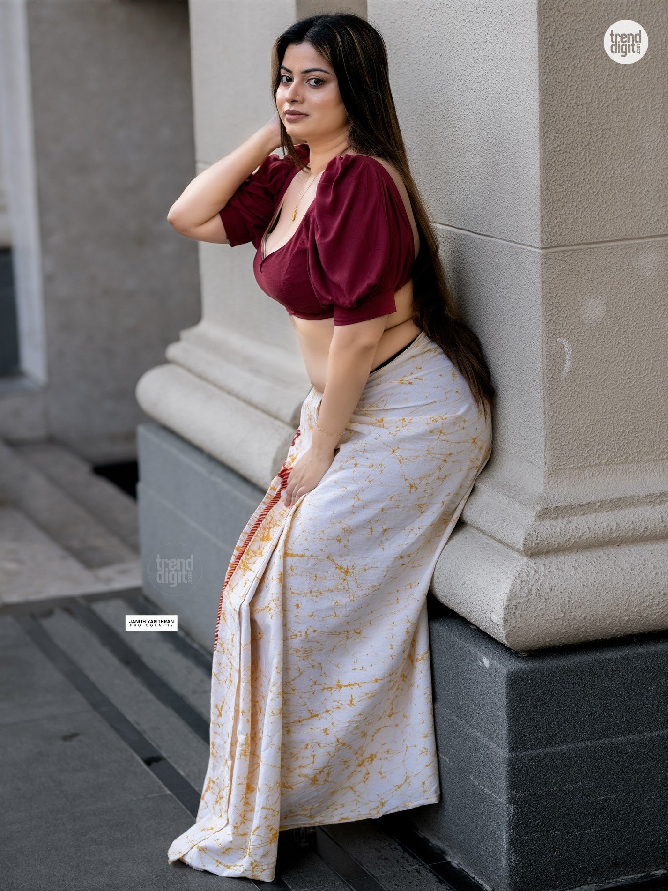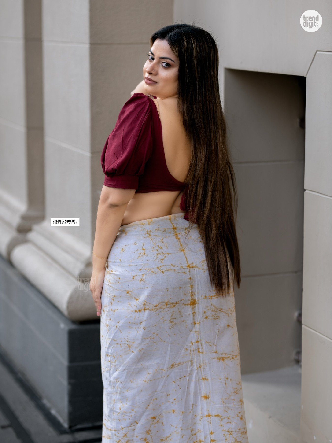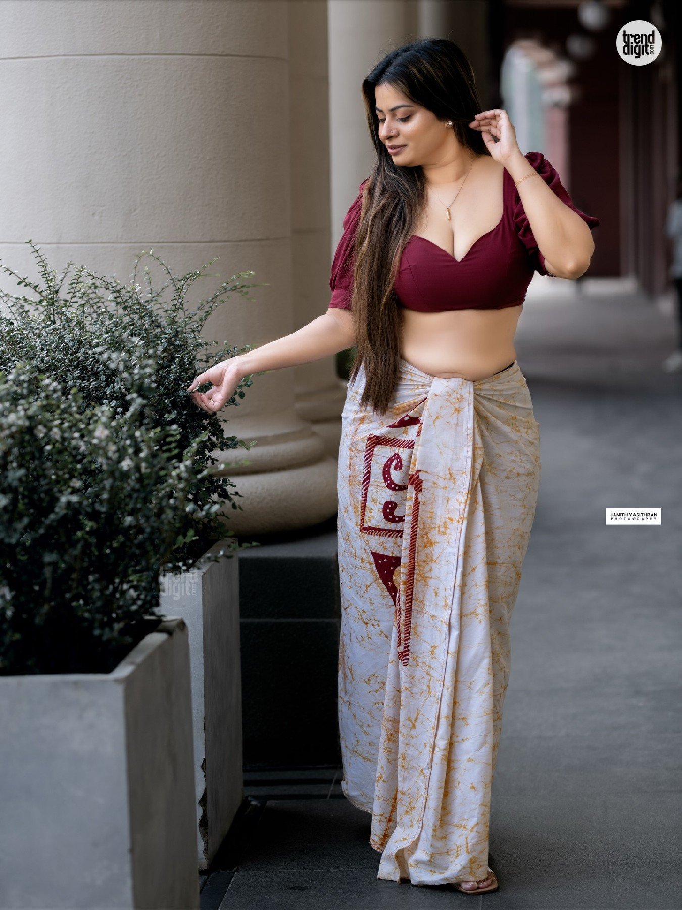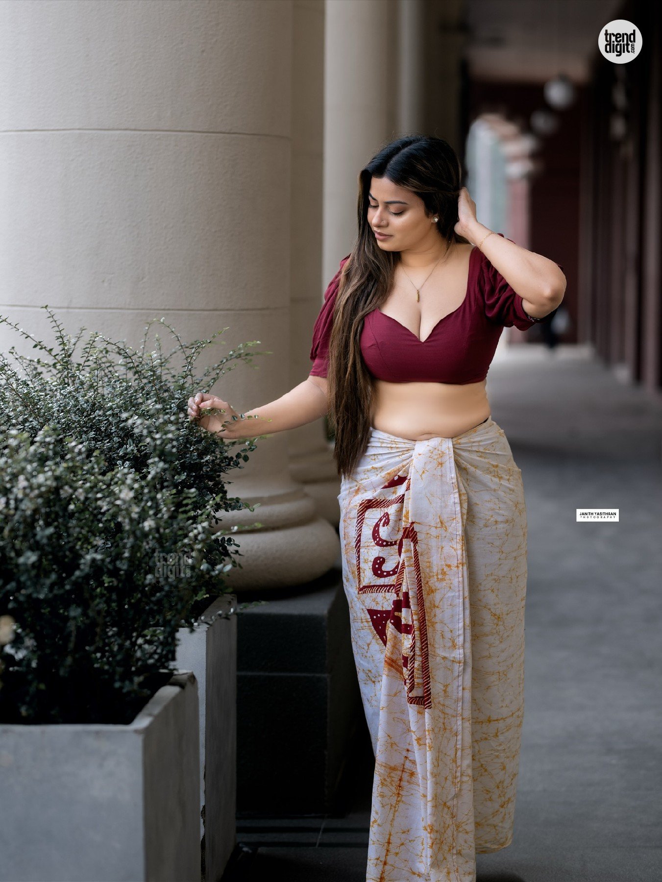 Sarah Sangz is a Sri Lankan model and beauty pageant titleholder associated with Colombo, Sri Lanka. This photoshoot presenting the Sarah Sangz Maroon Crop Top Saree is captured in an outdoor architectural corridor with neutral tones and soft daylight. The setting highlights a modern interpretation of traditional styling.