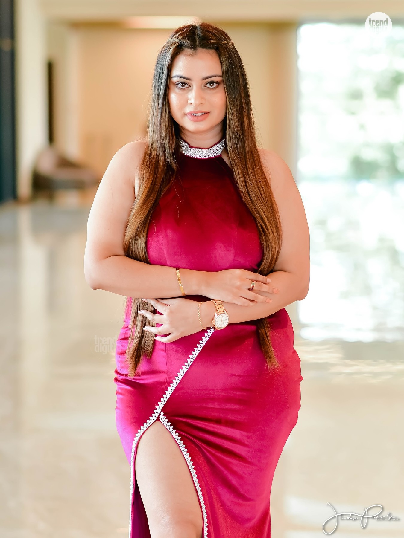 Sarah Sangz is a Sri Lankan model and beauty pageant titleholder associated with Colombo, Sri Lanka. This photoshoot featuring the Sarah Sangz Red Satin Evening Gown is captured in an indoor modern lobby setting using bright ambient lighting and reflective floors. The environment enhances the formal fashion presentation.