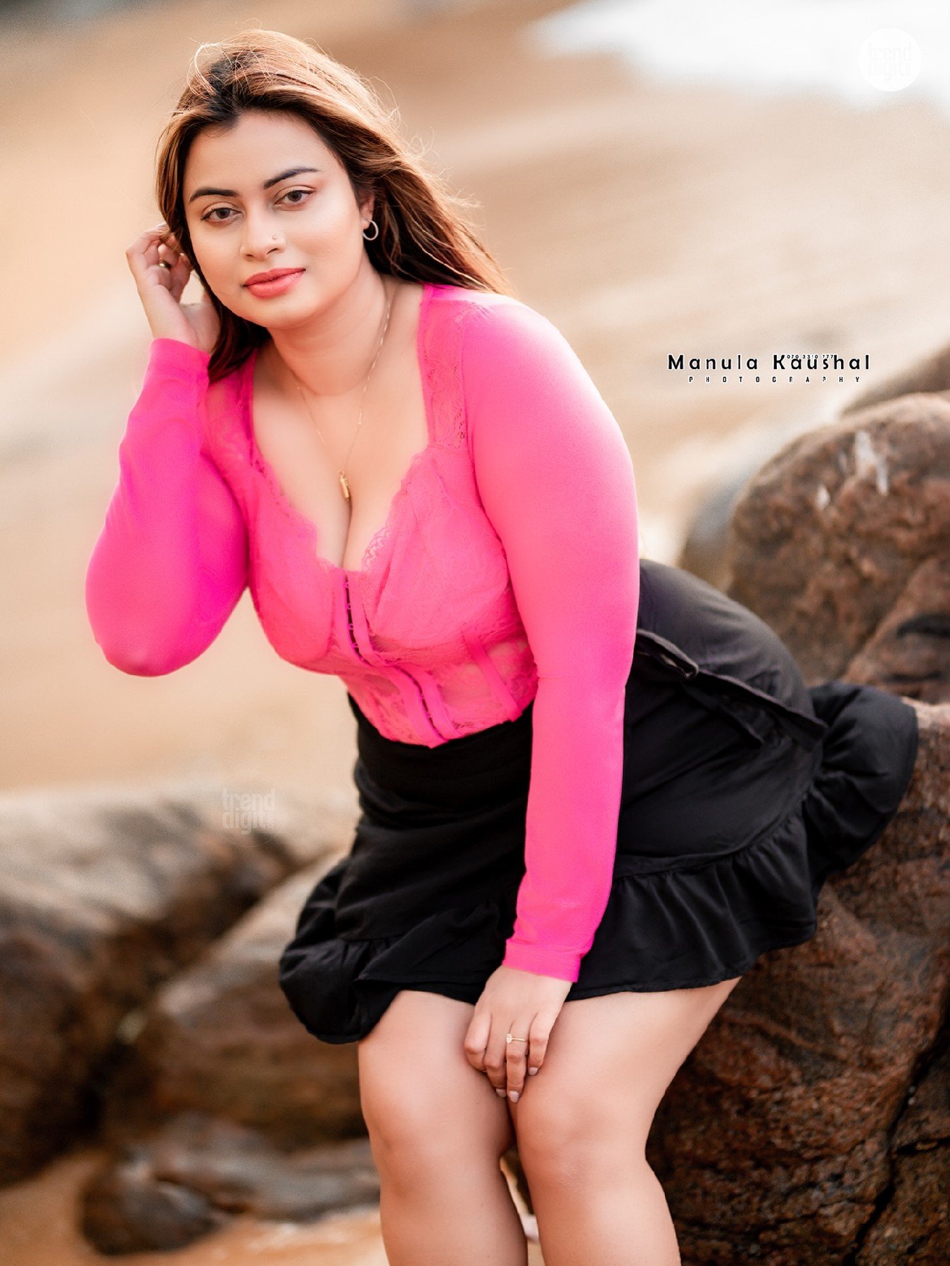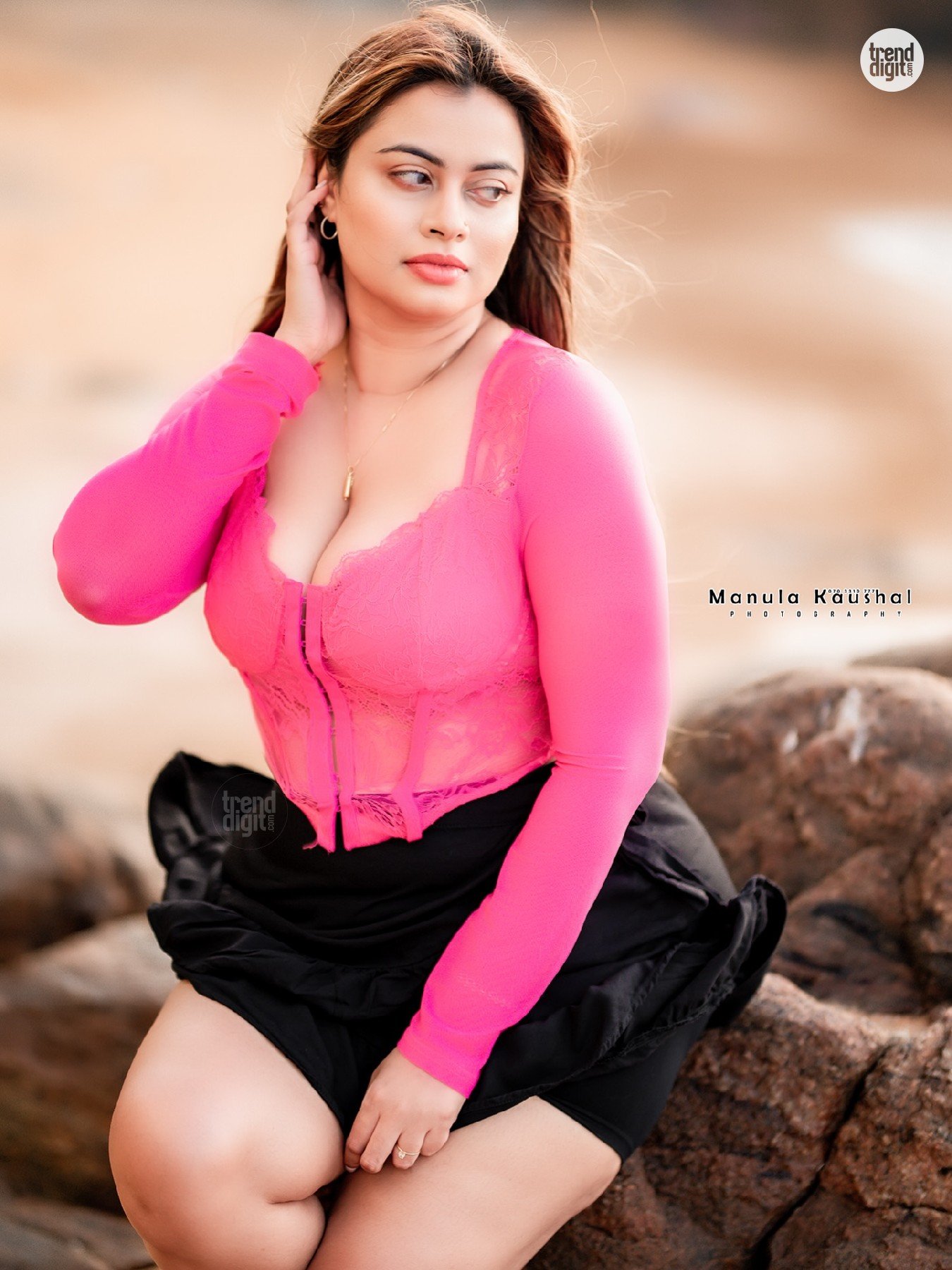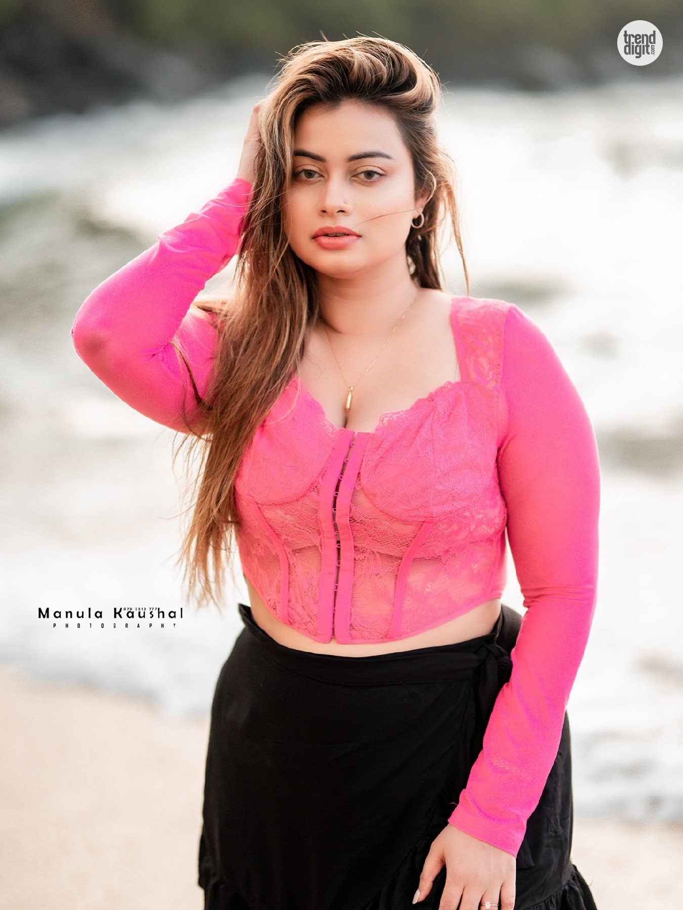 Sarah Sangz is a Sri Lankan model and beauty pageant titleholder based in Colombo, Sri Lanka. This photoshoot featuring the Sarah Sangz Pink Lace Corset Top is captured outdoors on a beach setting using natural daylight and a soft sandy backdrop. The coastal environment provides a relaxed atmosphere that highlights modern fashion styling.