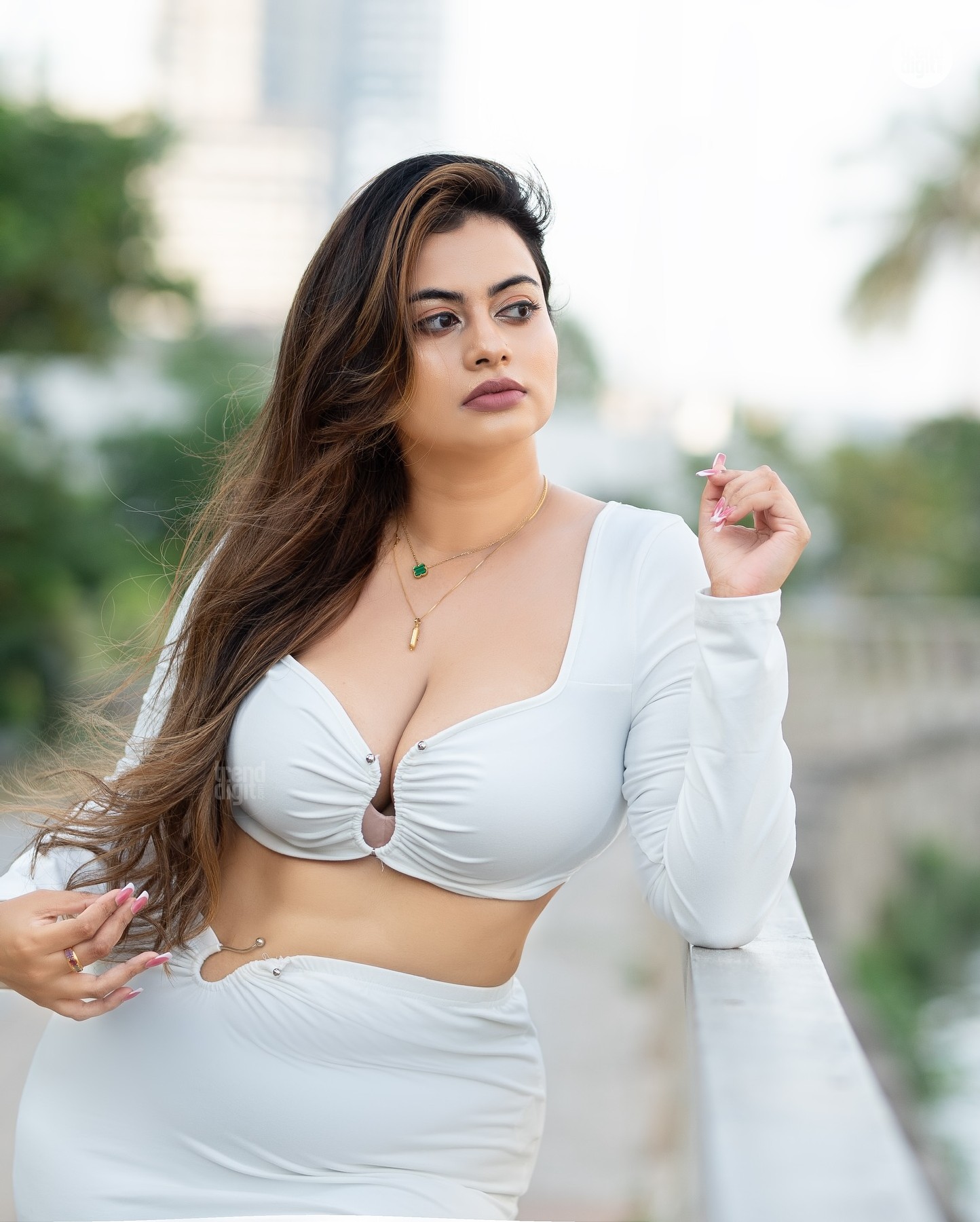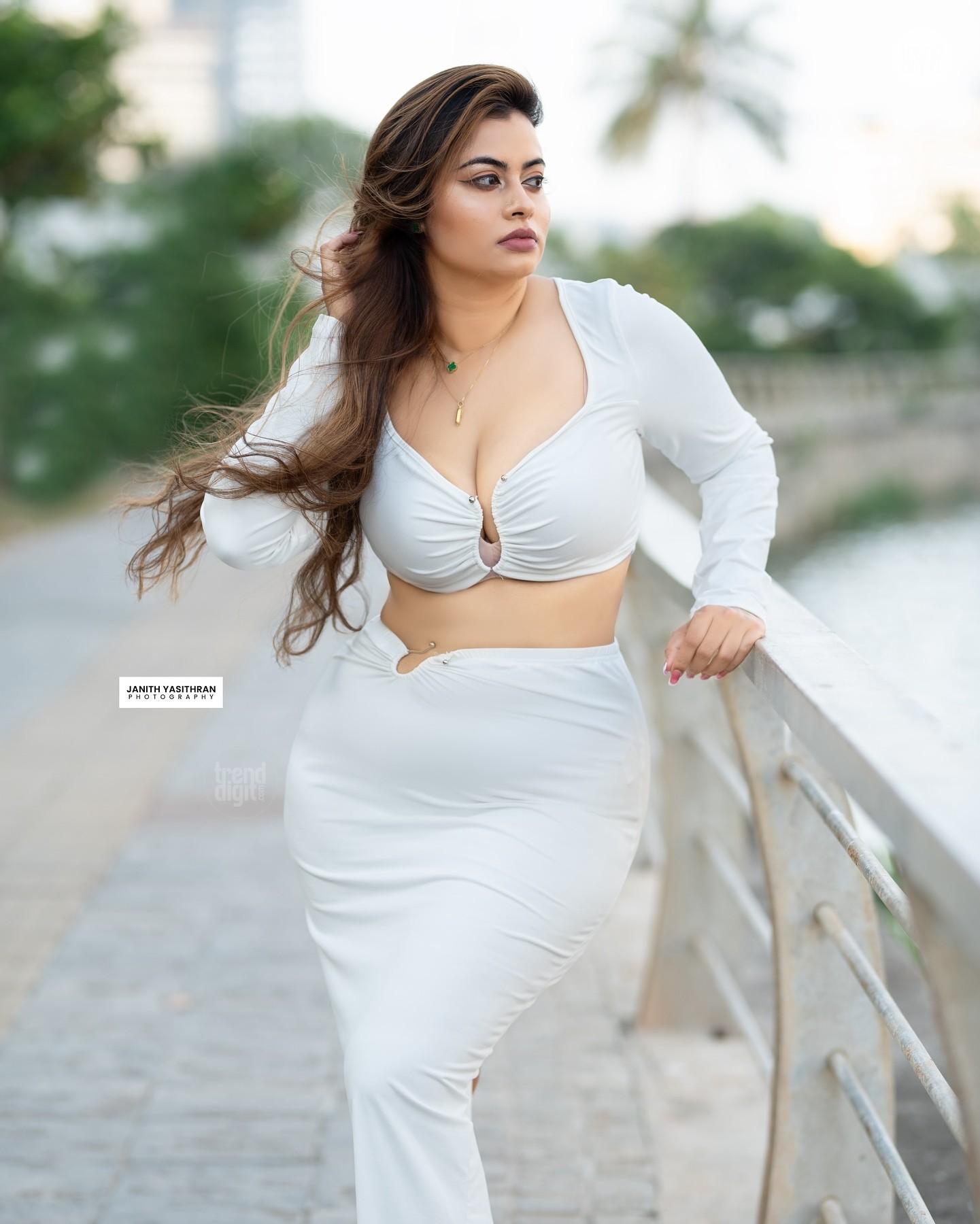 Sarah Sangz is a Sri Lankan model and beauty pageant titleholder based in Colombo, Sri Lanka. This photoshoot featuring the Sarah Sangz White Cutout Dress is captured outdoors along a city walkway using soft natural daylight and blurred greenery backdrops. The setting emphasizes modern fashion styling and clean portrait composition.