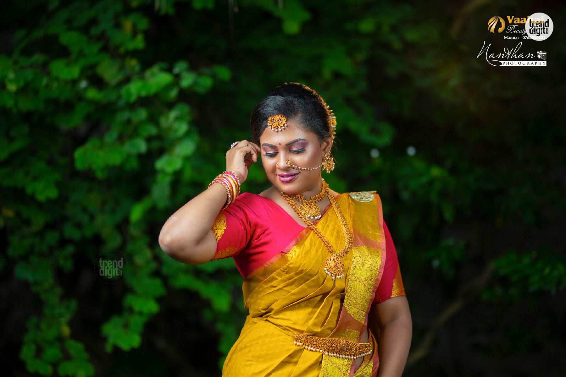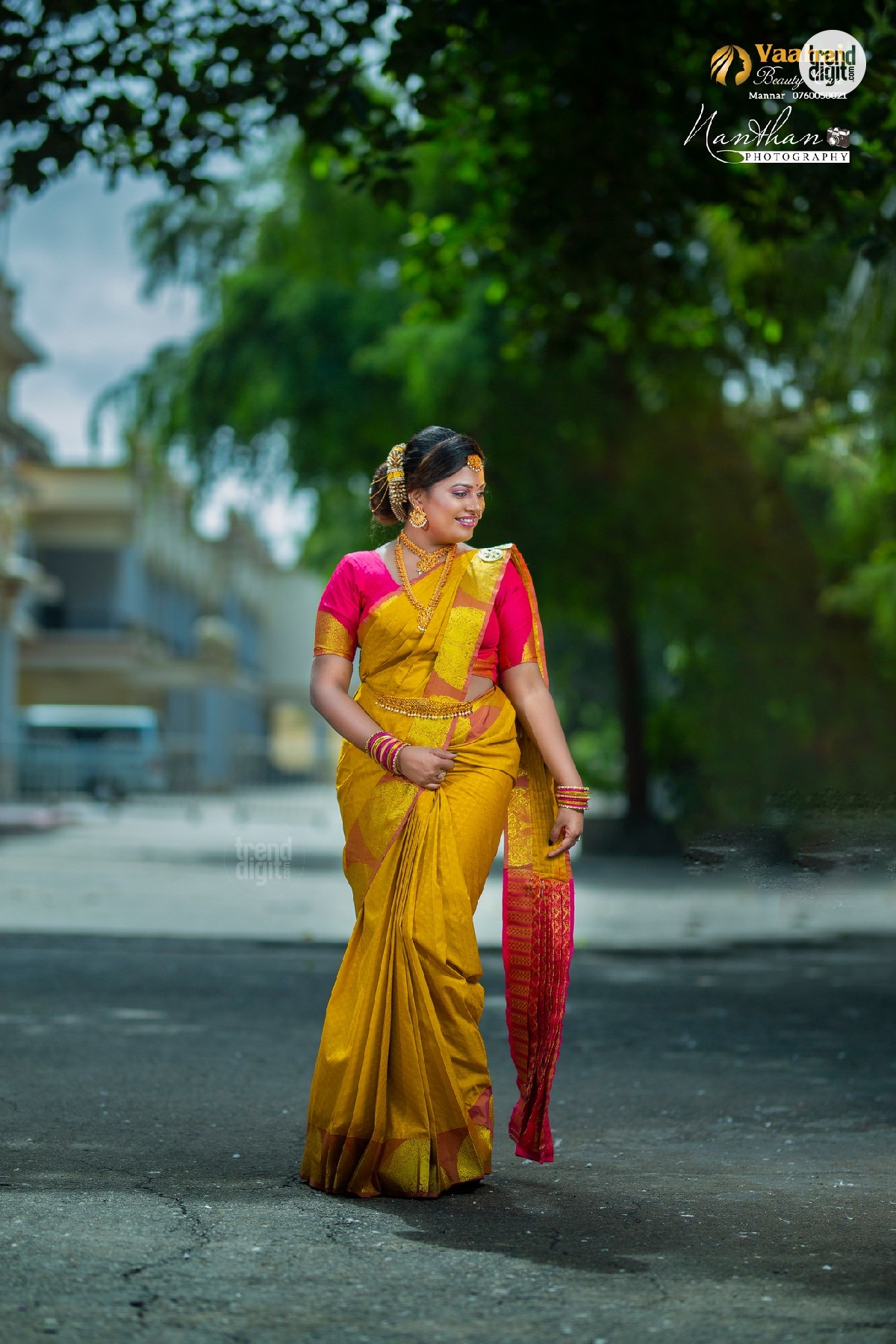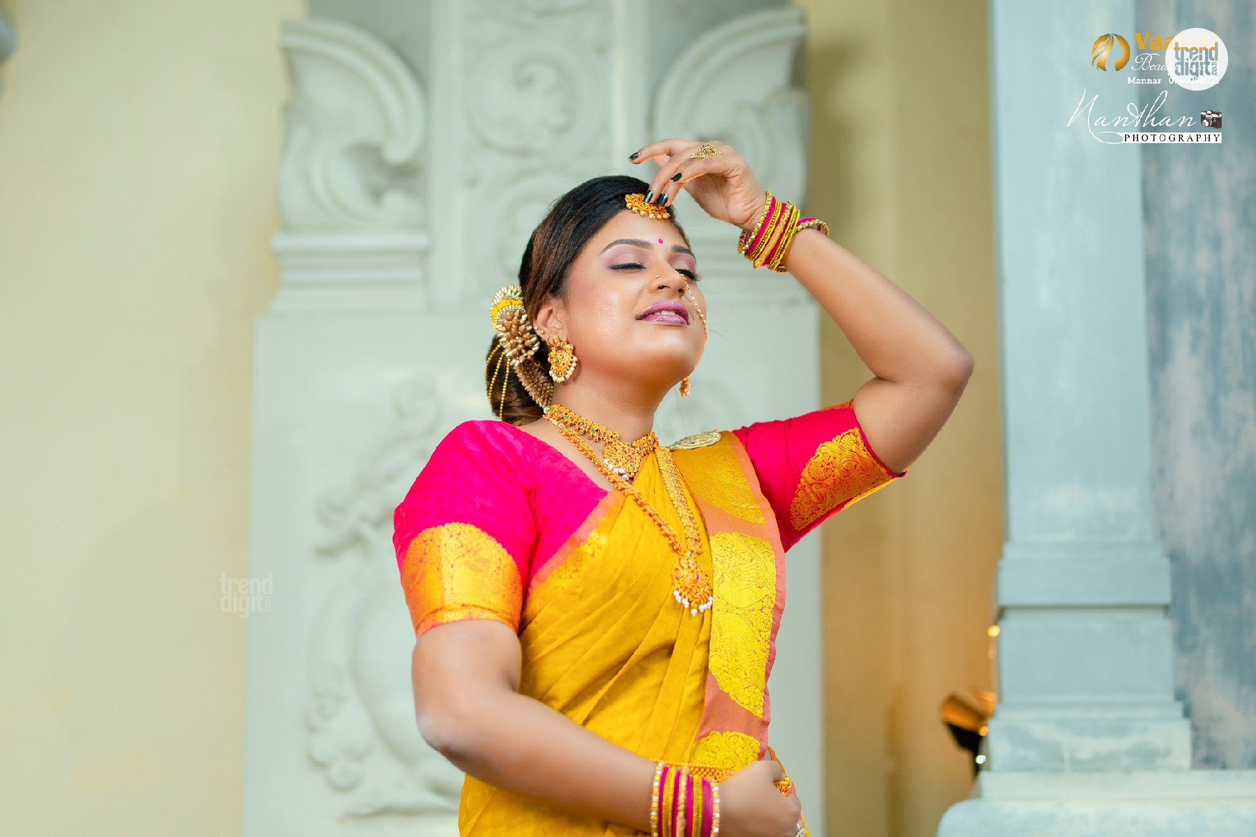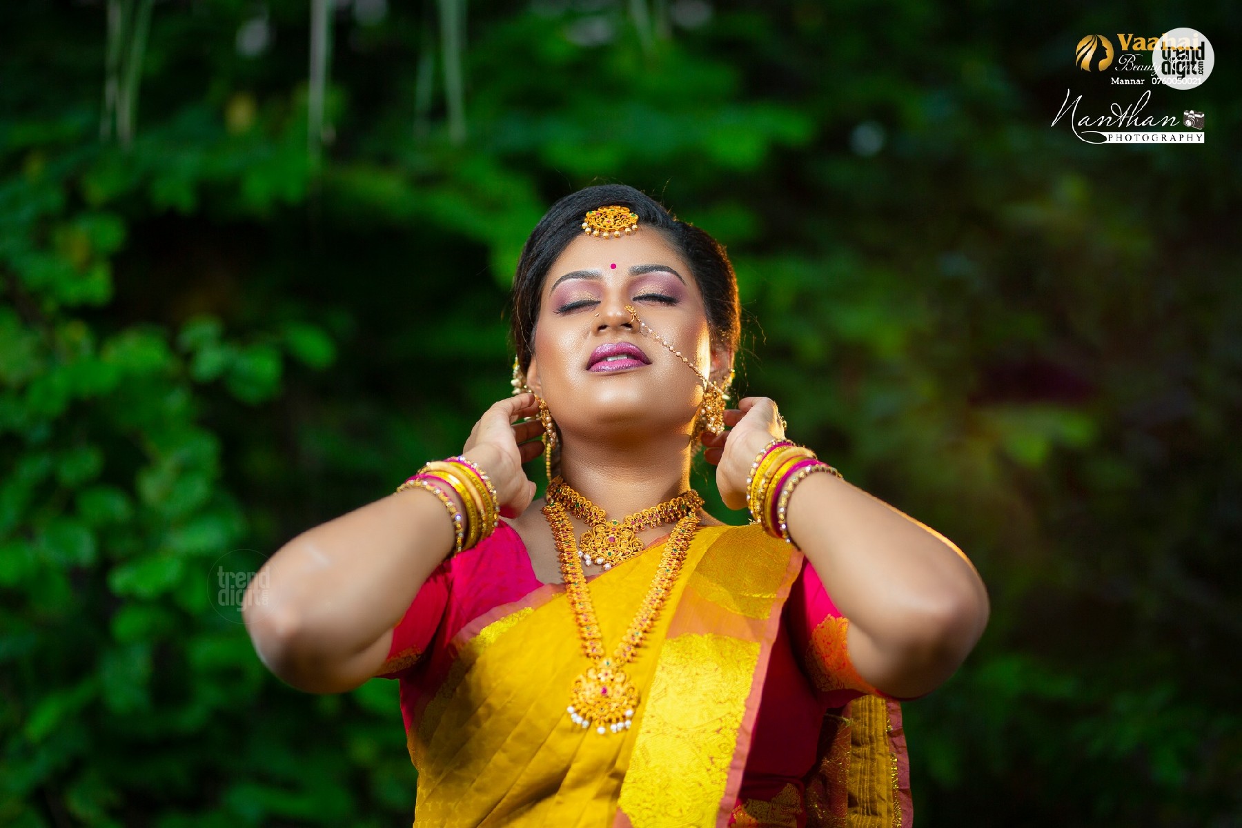 Captured by Nanthan Photography, the images use natural greenery and soft background blur to highlight the subject and her traditional attire. The photography focuses on expressive poses, vibrant colors, and rich textile details that bring attention to the saree and jewellery styling.