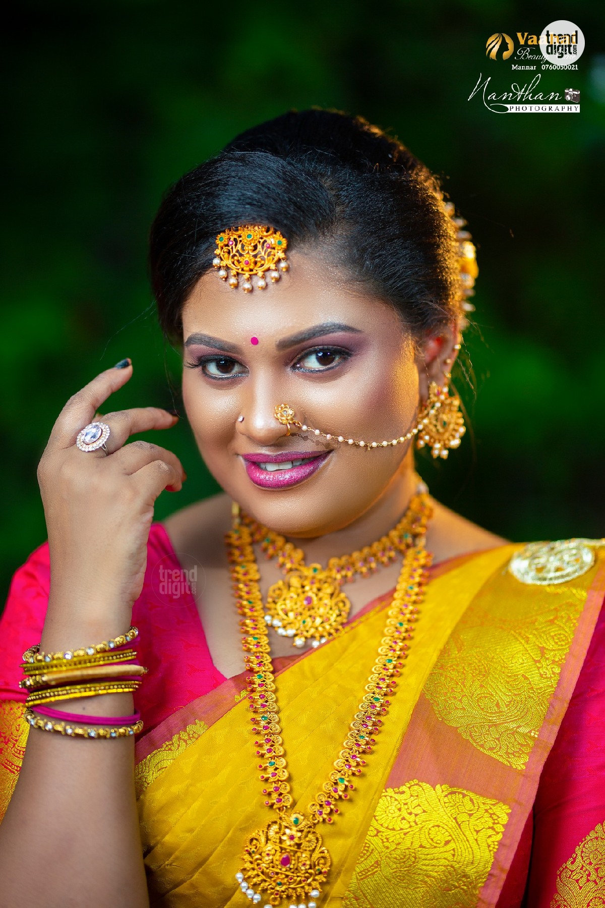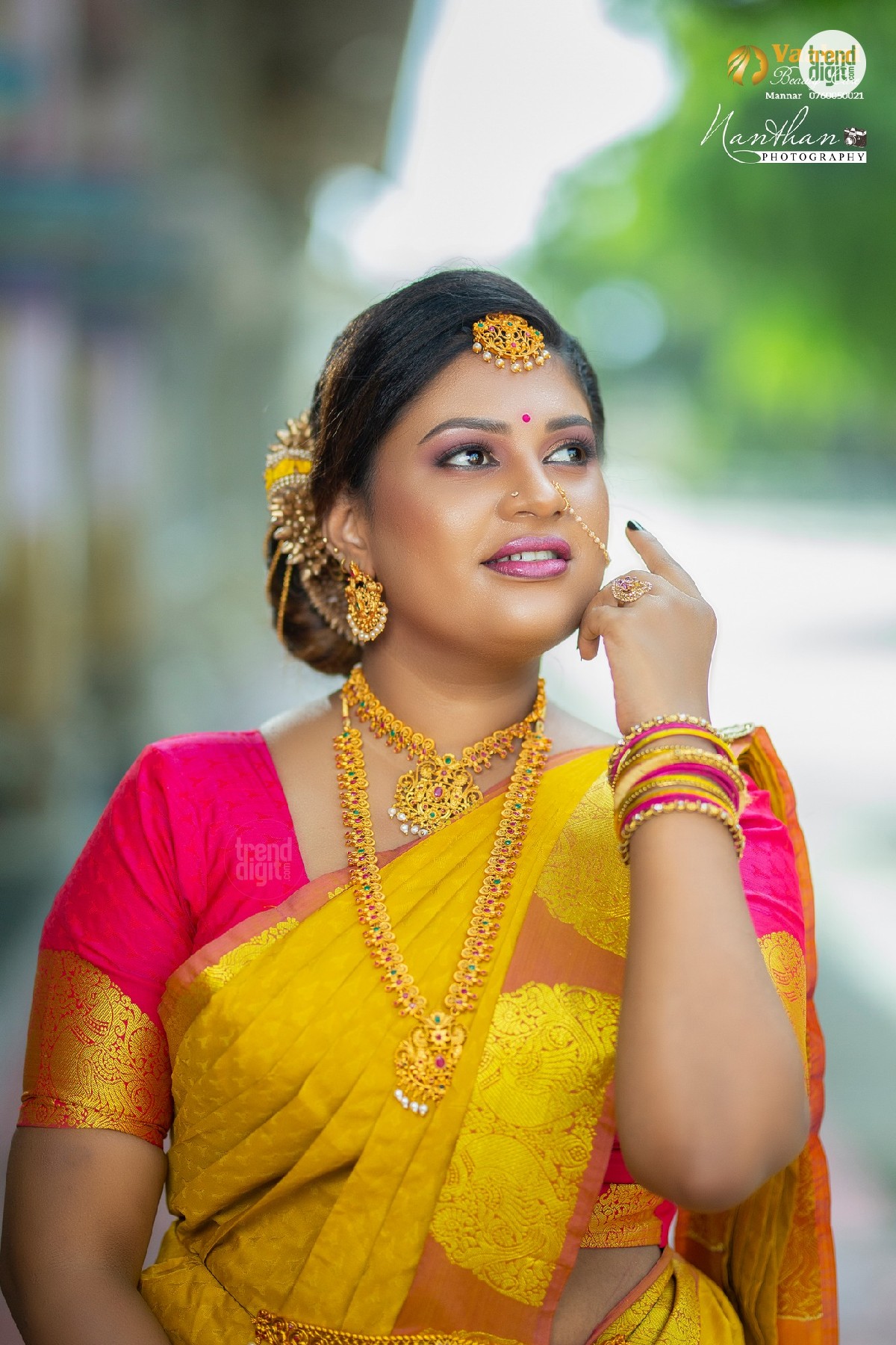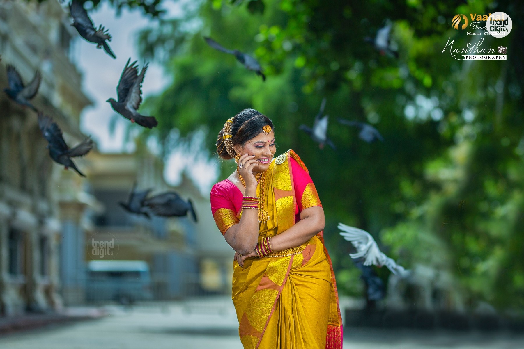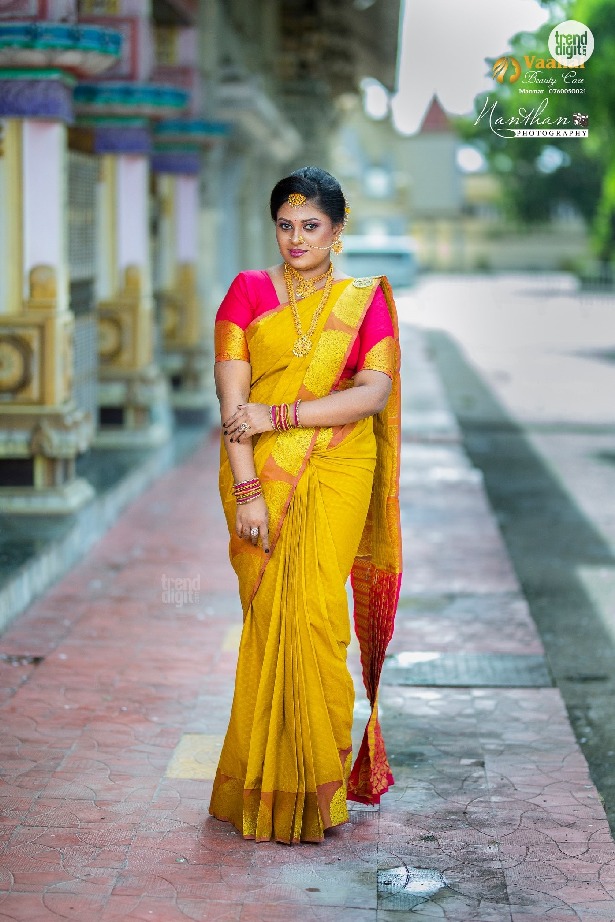 Captured by Nanthan Photography, the images use natural greenery and soft background blur to highlight the subject and her traditional attire. The photography focuses on expressive poses, vibrant colors, and rich textile details that bring attention to the saree and jewellery styling.