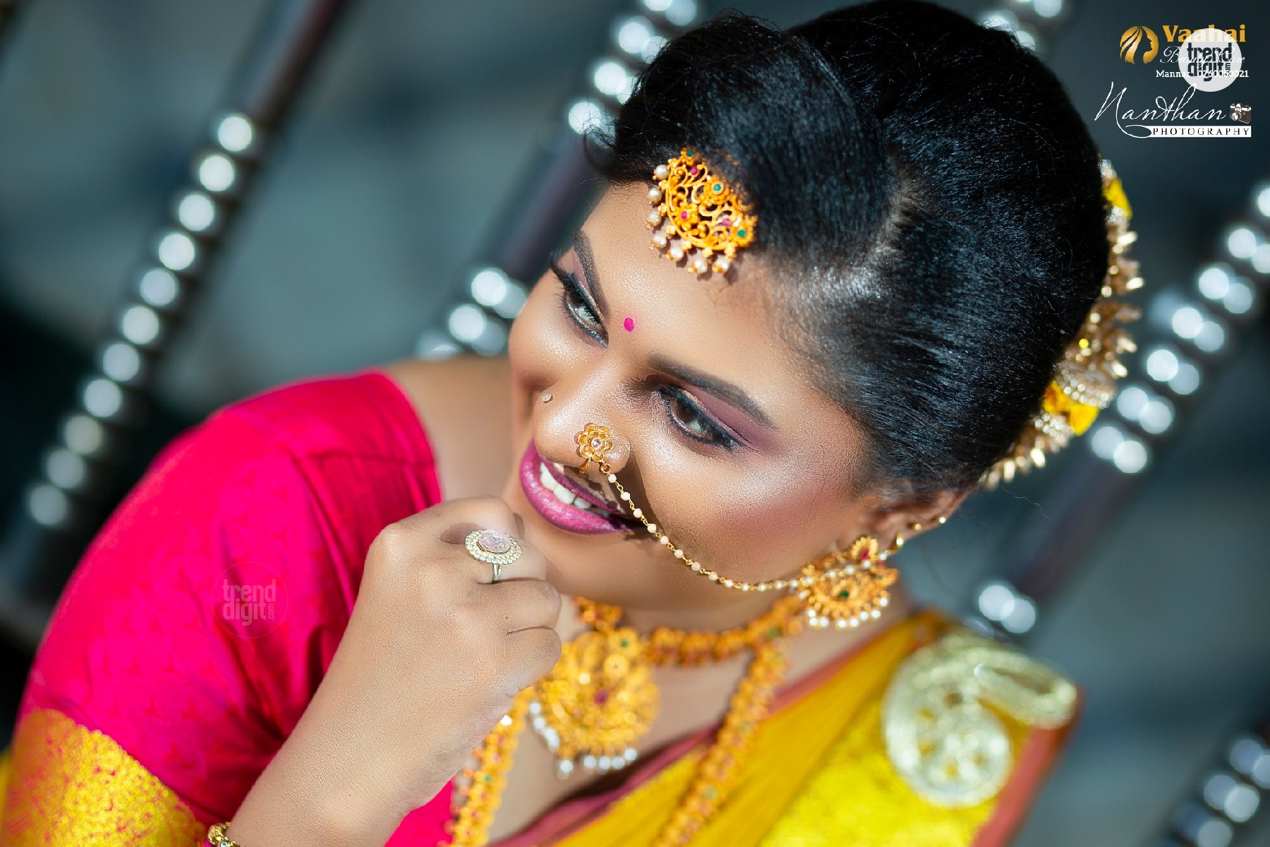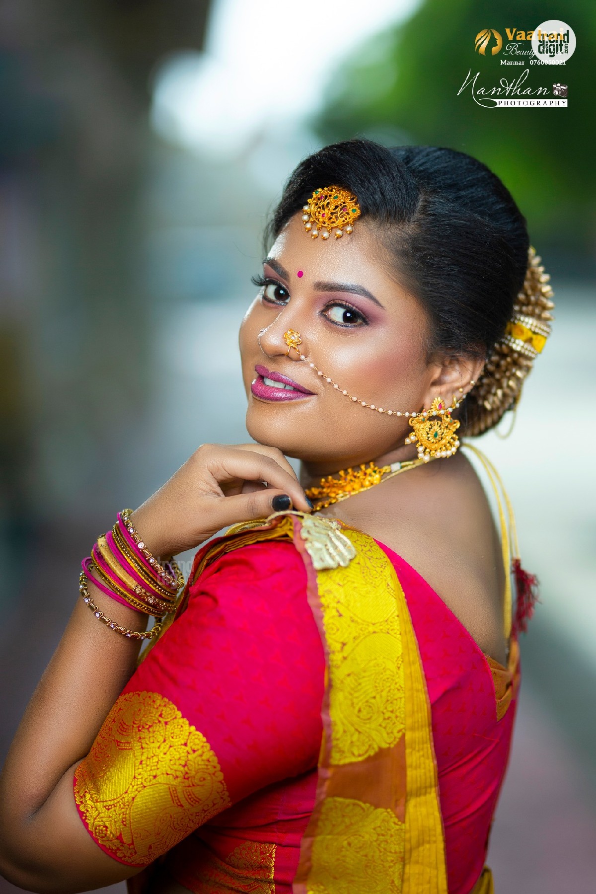 Makeup by Vaahai Beauty Care presents a classic bridal-inspired look with defined eyes, soft contouring, and bold lip color. The styling is completed with traditional gold jewellery including layered necklaces, earrings, bangles, a nose ring chain, and a decorative headpiece that enhances the cultural theme of the shoot.