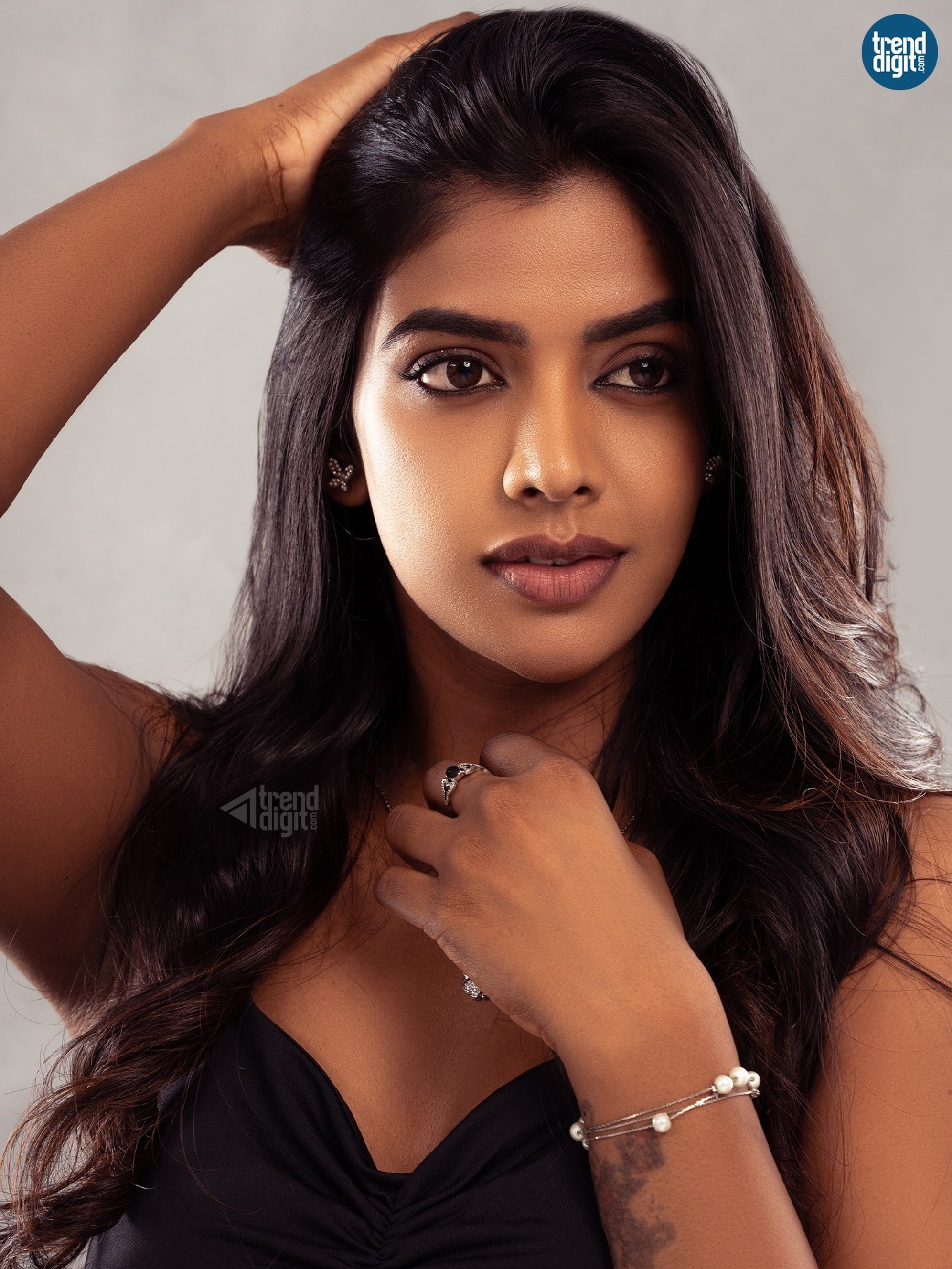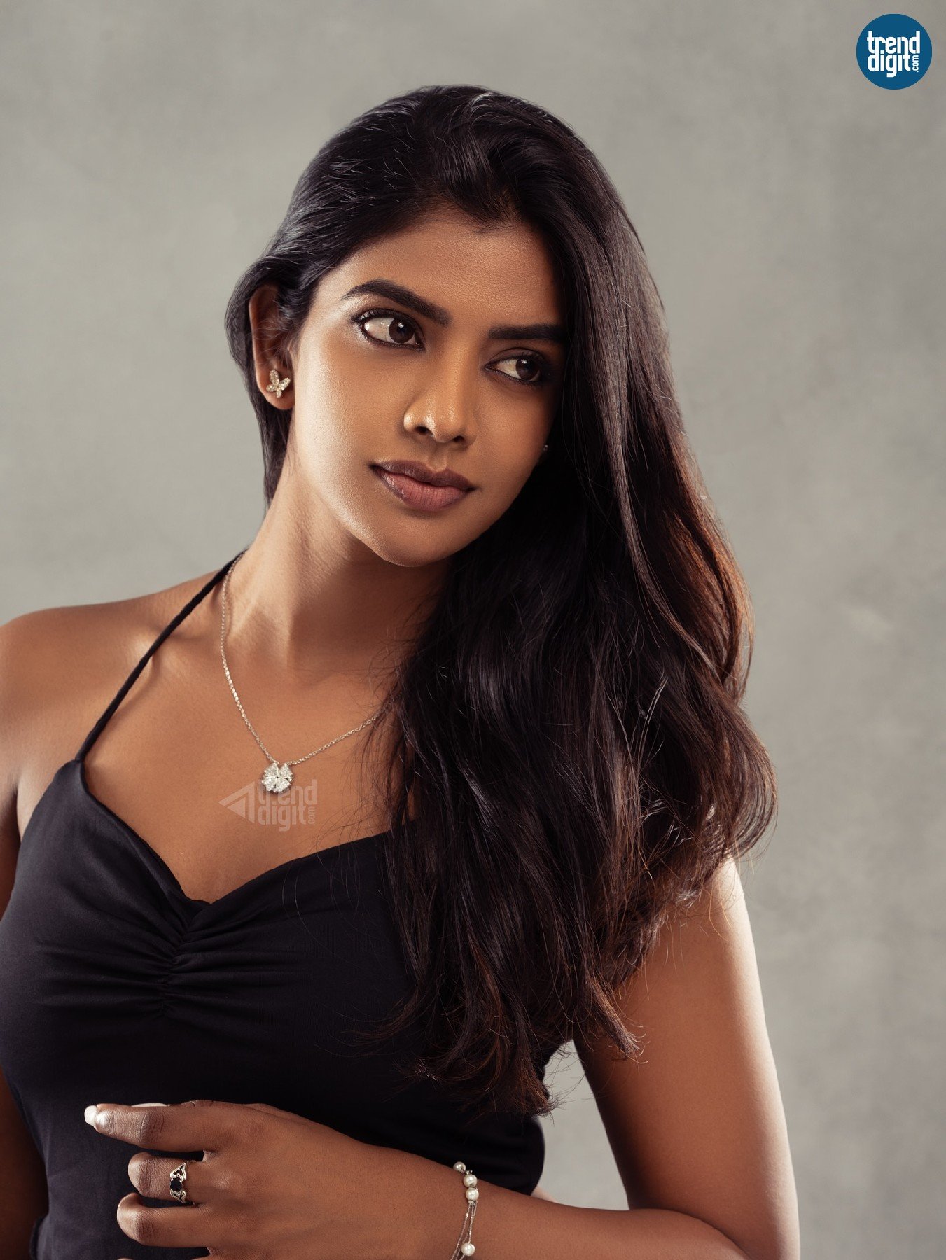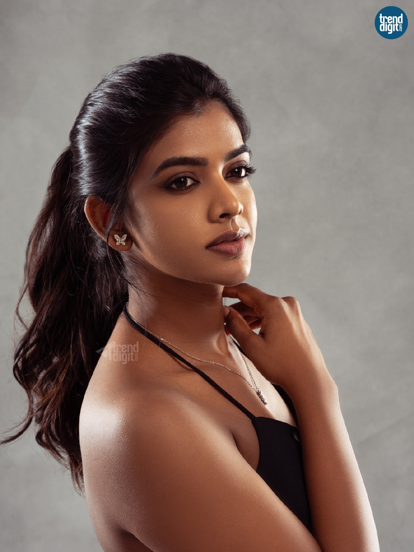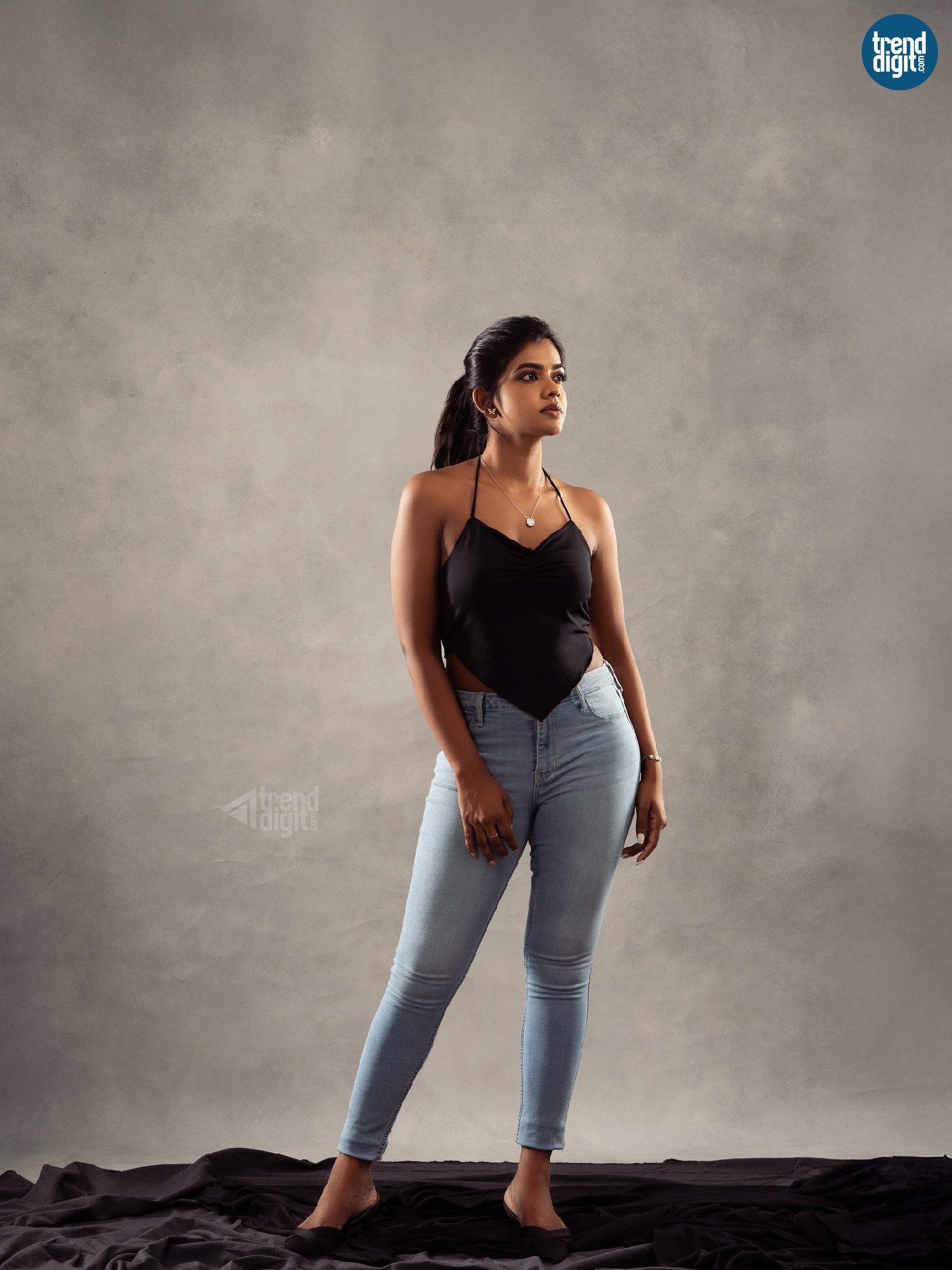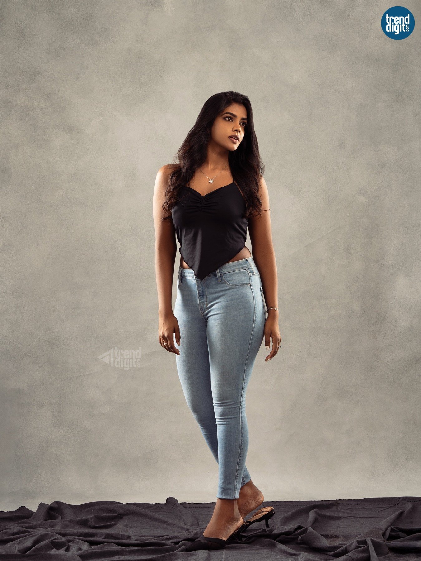 Seshvitha Kanimozhi, an Indian actress and dancer from the Tamil film industry, features in a studio shoot that focuses on casual contemporary styling. The neutral backdrop and soft lighting keep the attention on fit and posture.