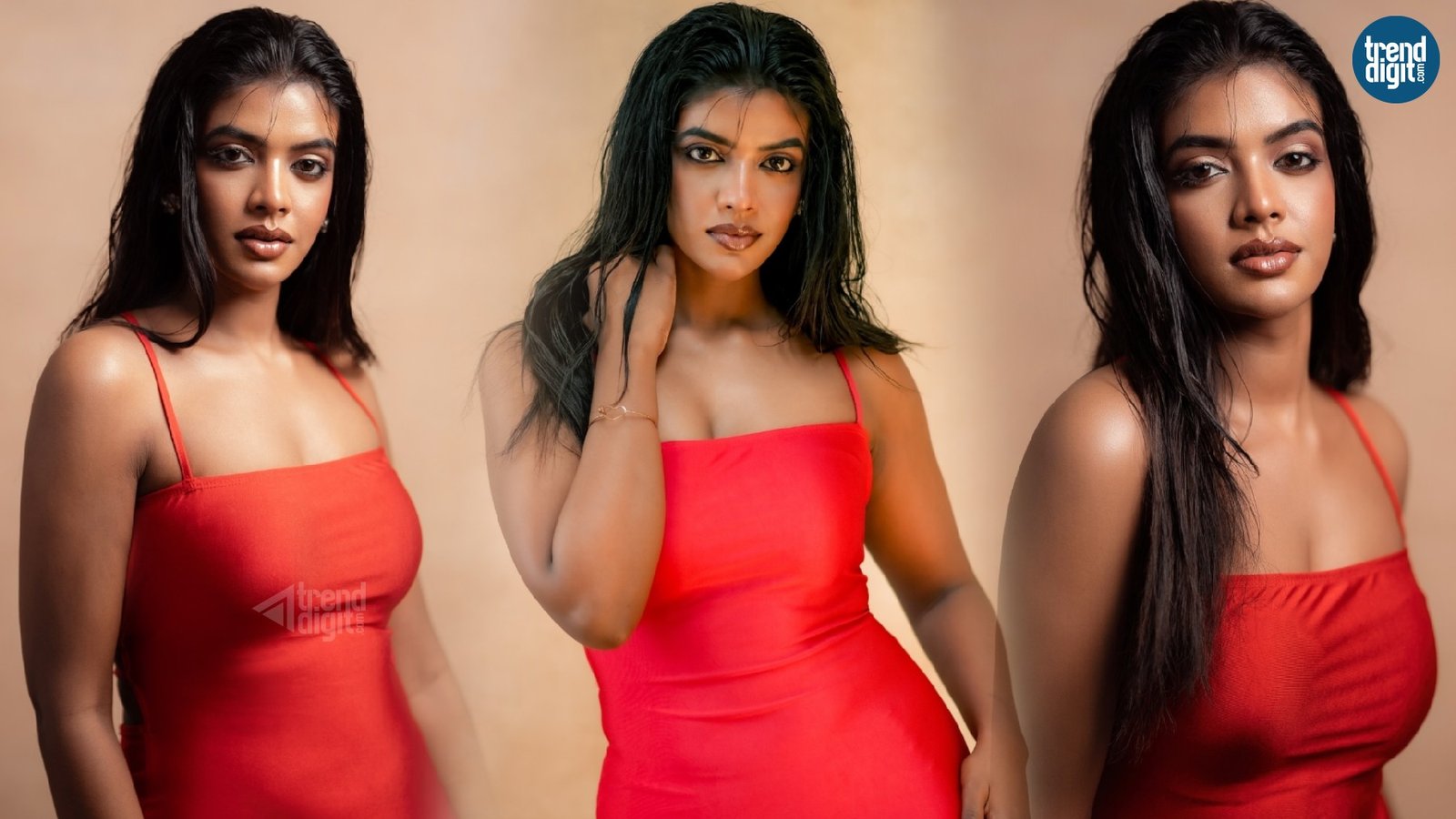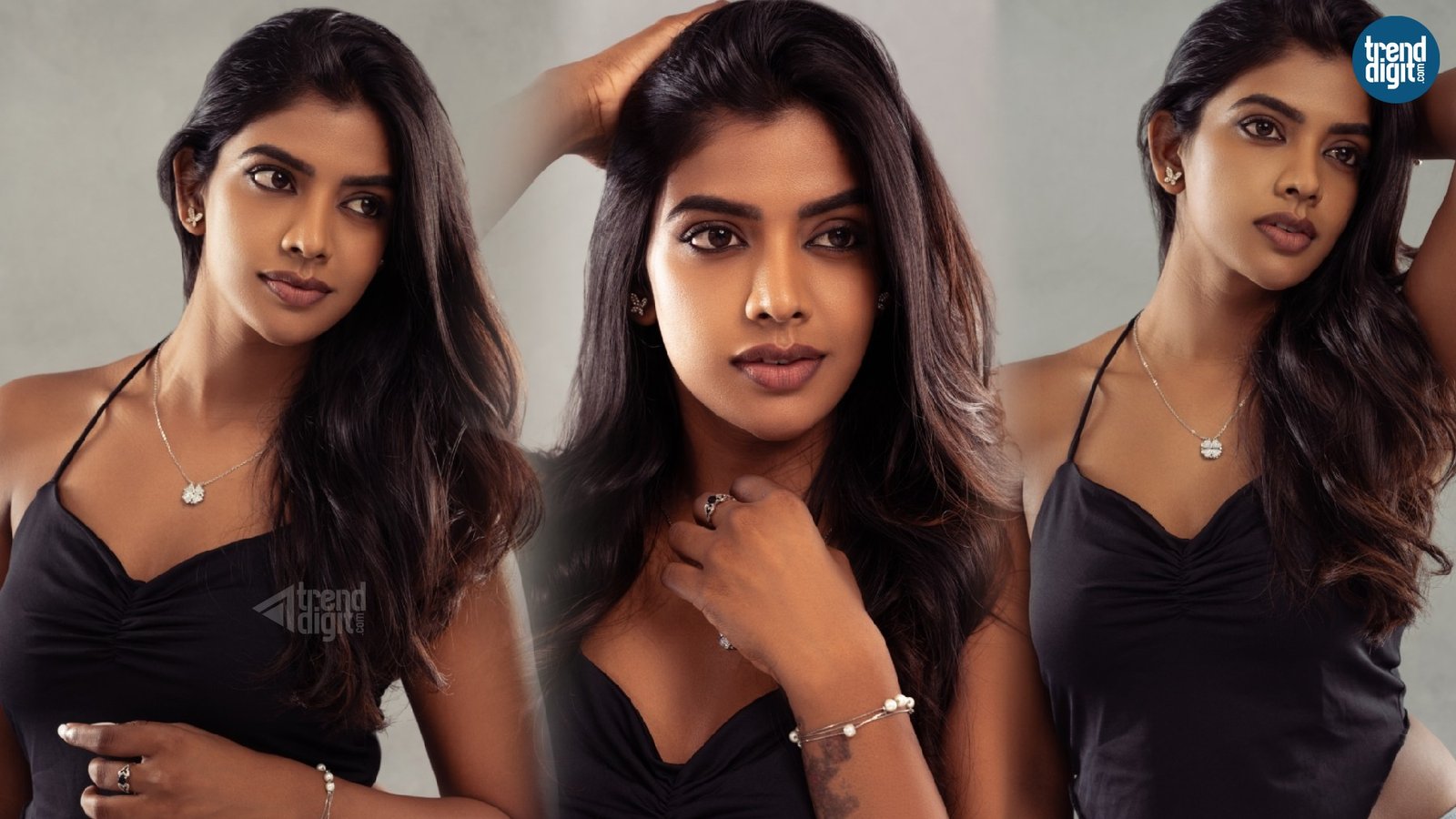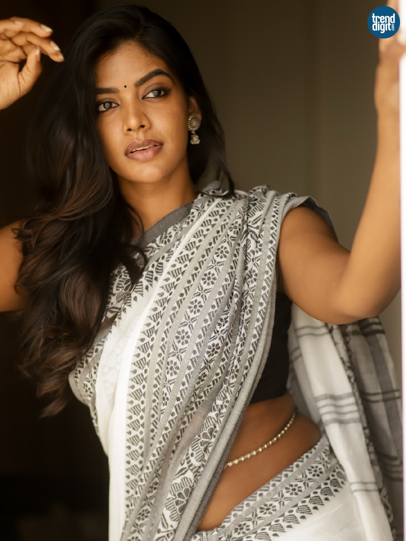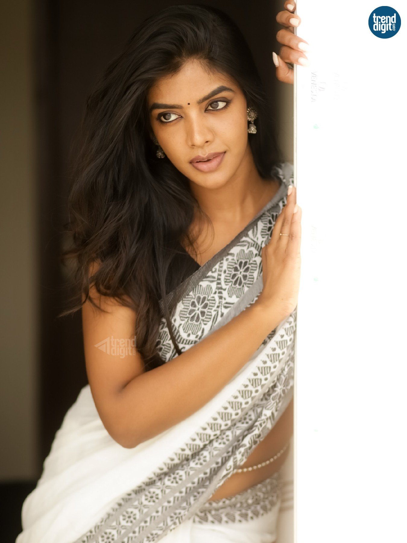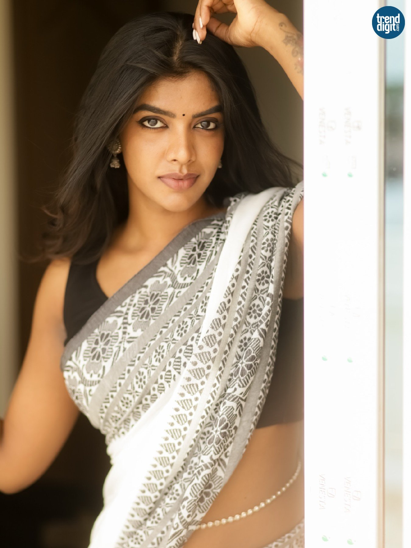 Seshvitha Kanimozhi, an Indian film actress and dancer working predominantly in the Tamil movie industry, is seen in a serene photoshoot that reflects understated traditional styling. Shot in a softly lit indoor setting, the frames focus on natural expressions and quiet composition, allowing the look to unfold without distraction.