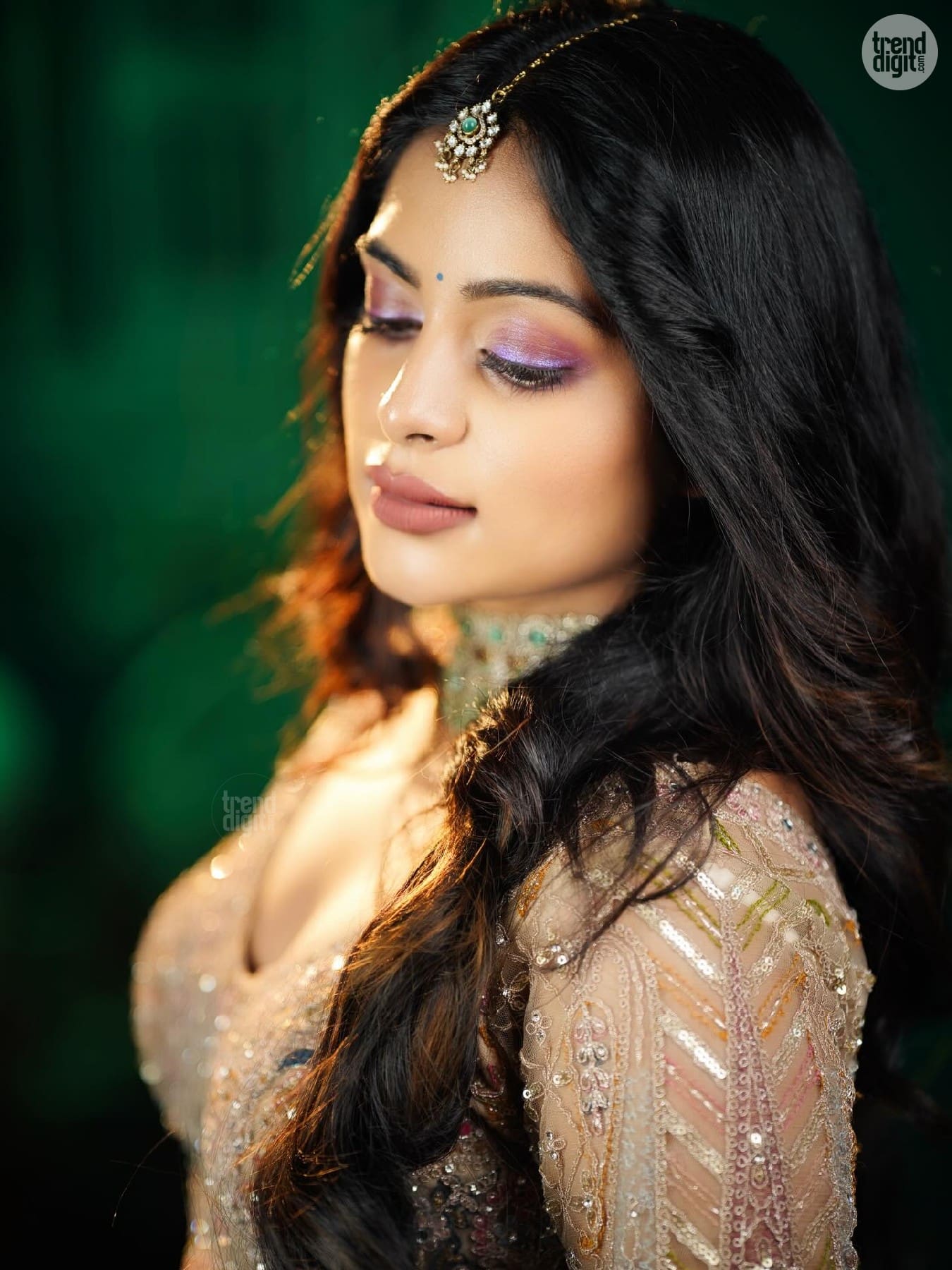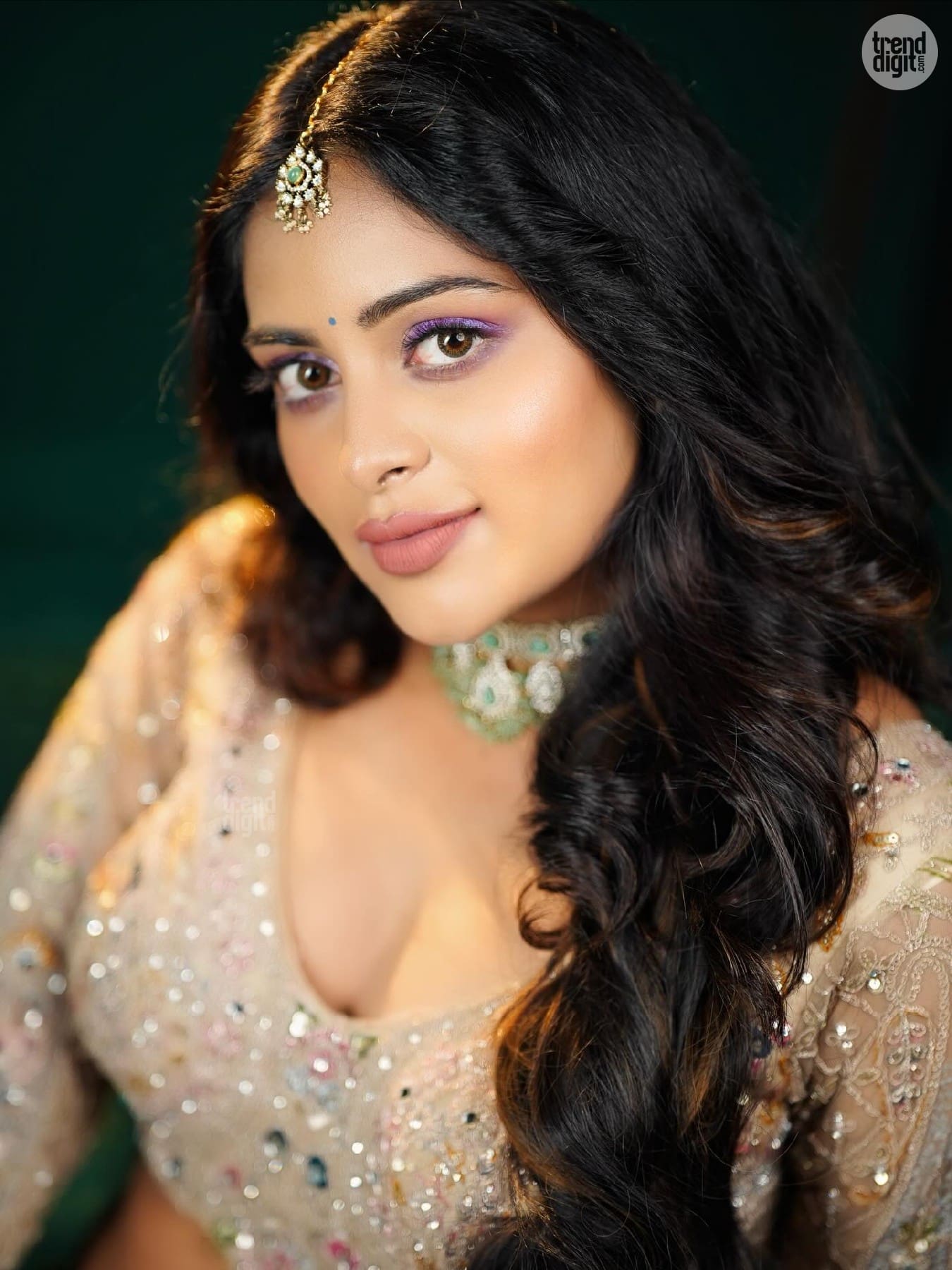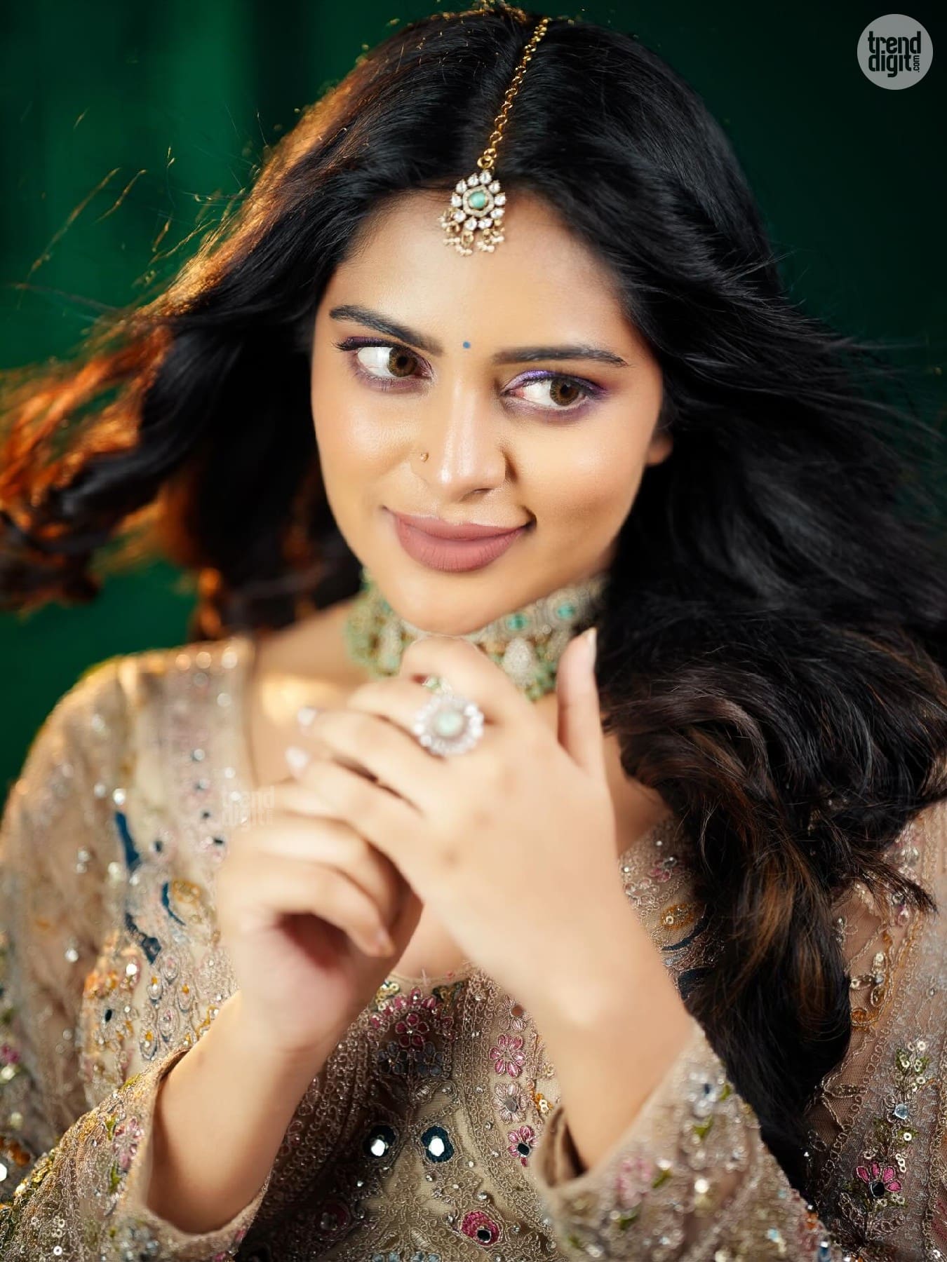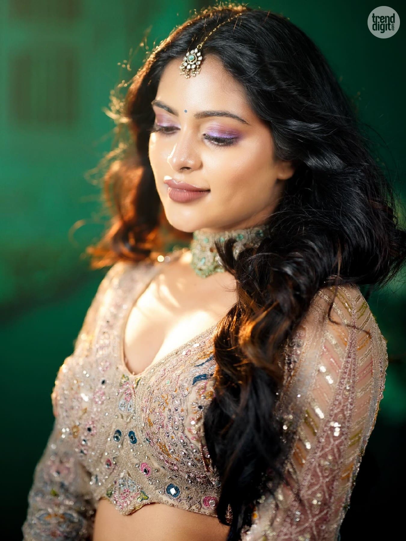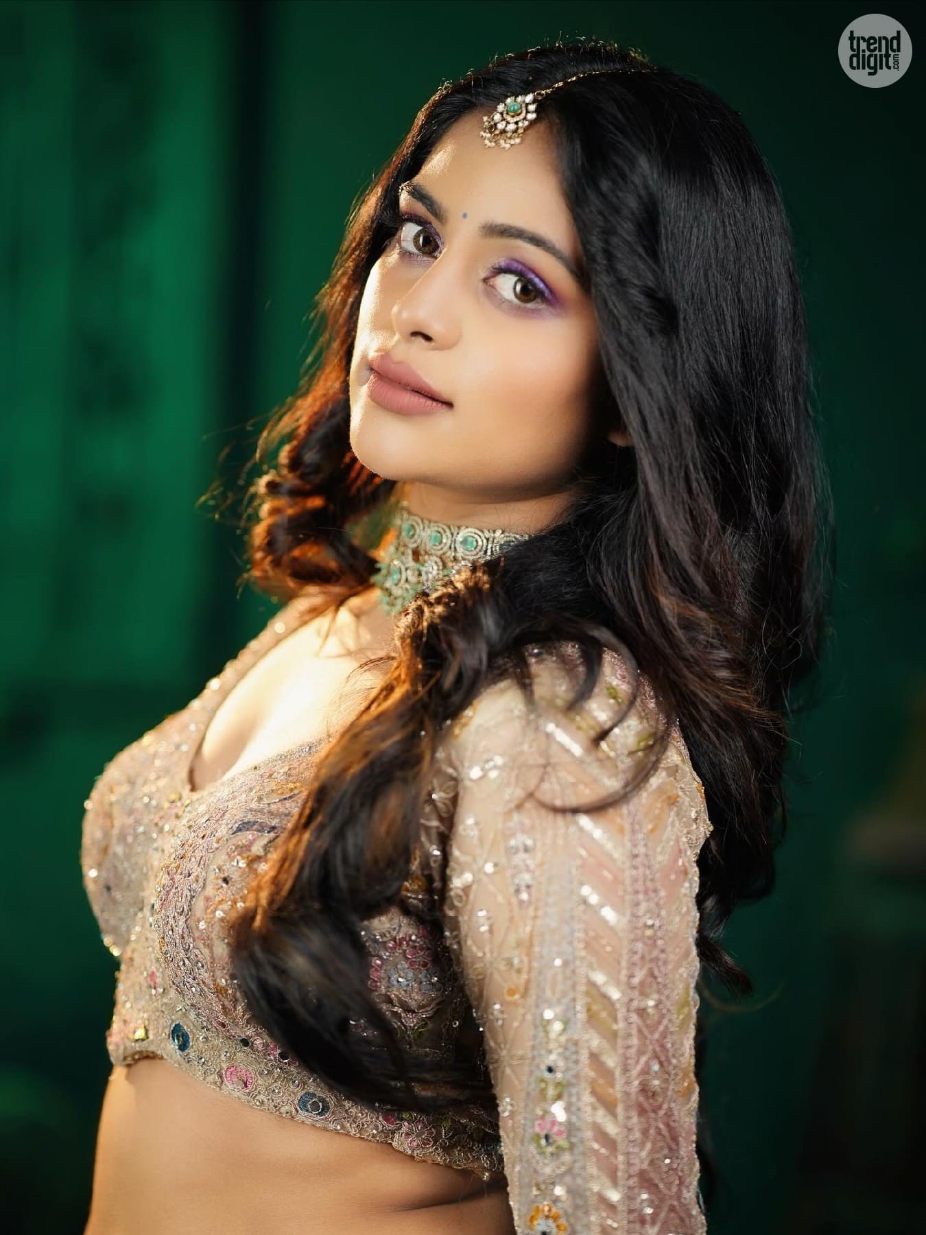 Shiyara Sharmi is a Sri Lankan-Indian actress known for her elegant on-screen and fashion appearances. This photoshoot is captured indoors using a dark green backdrop and focused studio lighting. The setting enhances the richness of the embroidery and jewellery details.