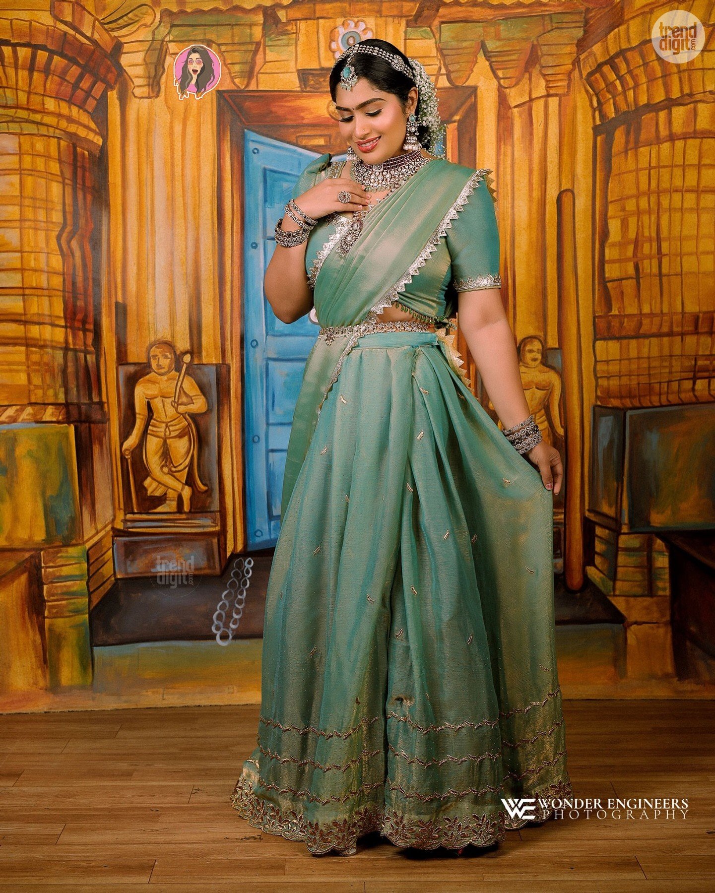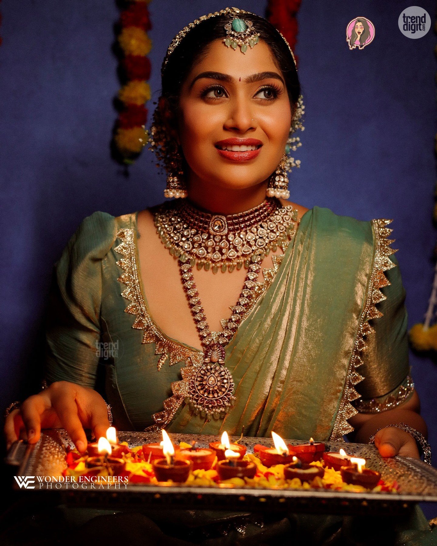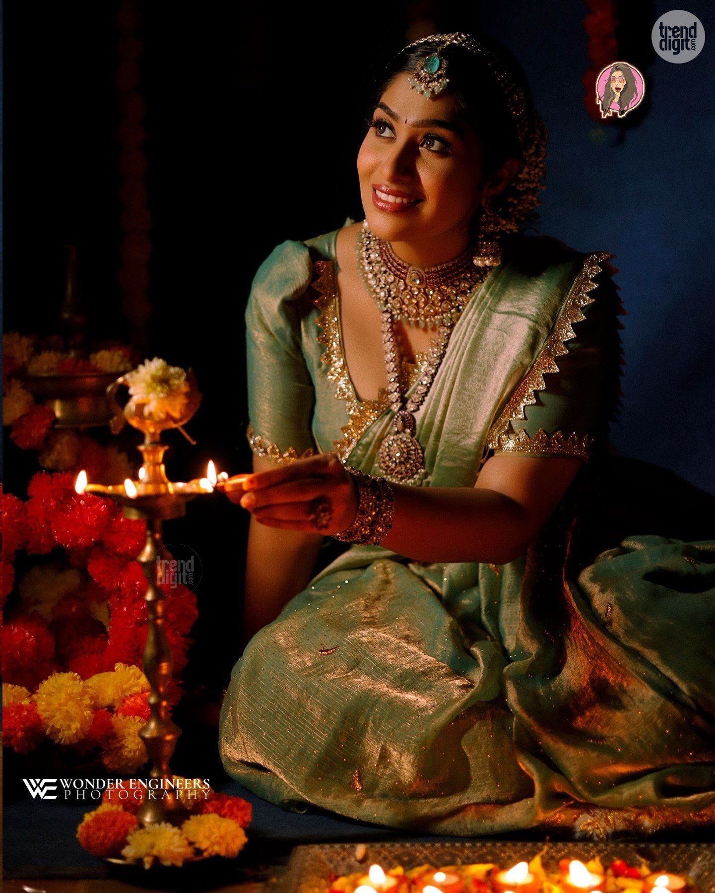 The green silk saree features a soft sheen with gold-toned woven borders and a structured blouse finished with scalloped detailing. The drape is neat and classic, emphasizing traditional silhouette lines. She complements the saree with layered temple jewellery, including a choker, long haram, ornate earrings, and a statement maang tikka.