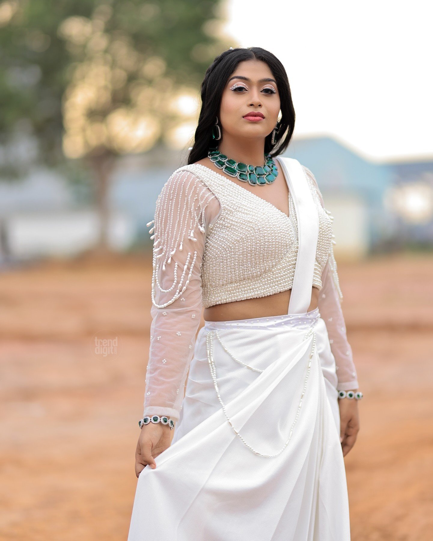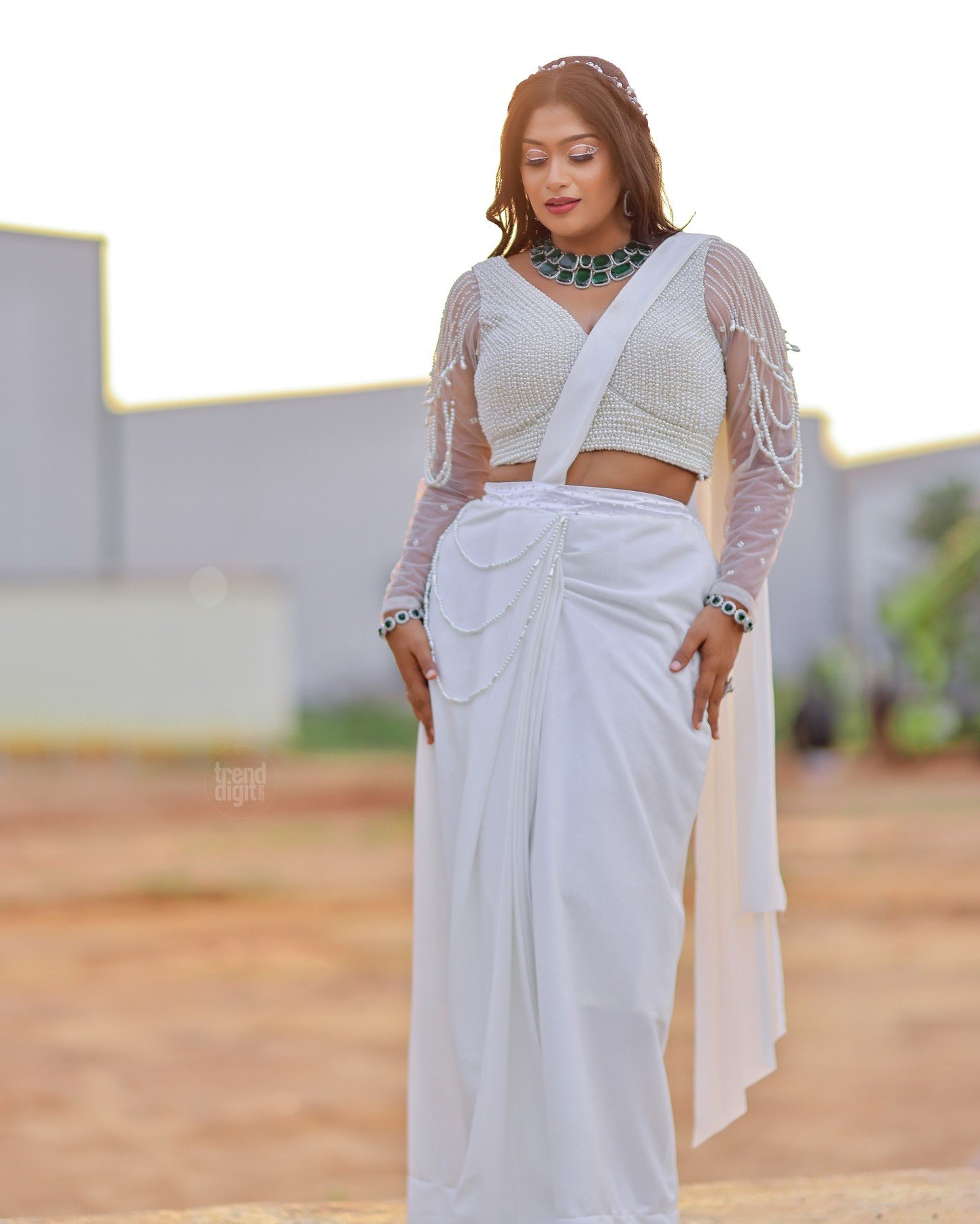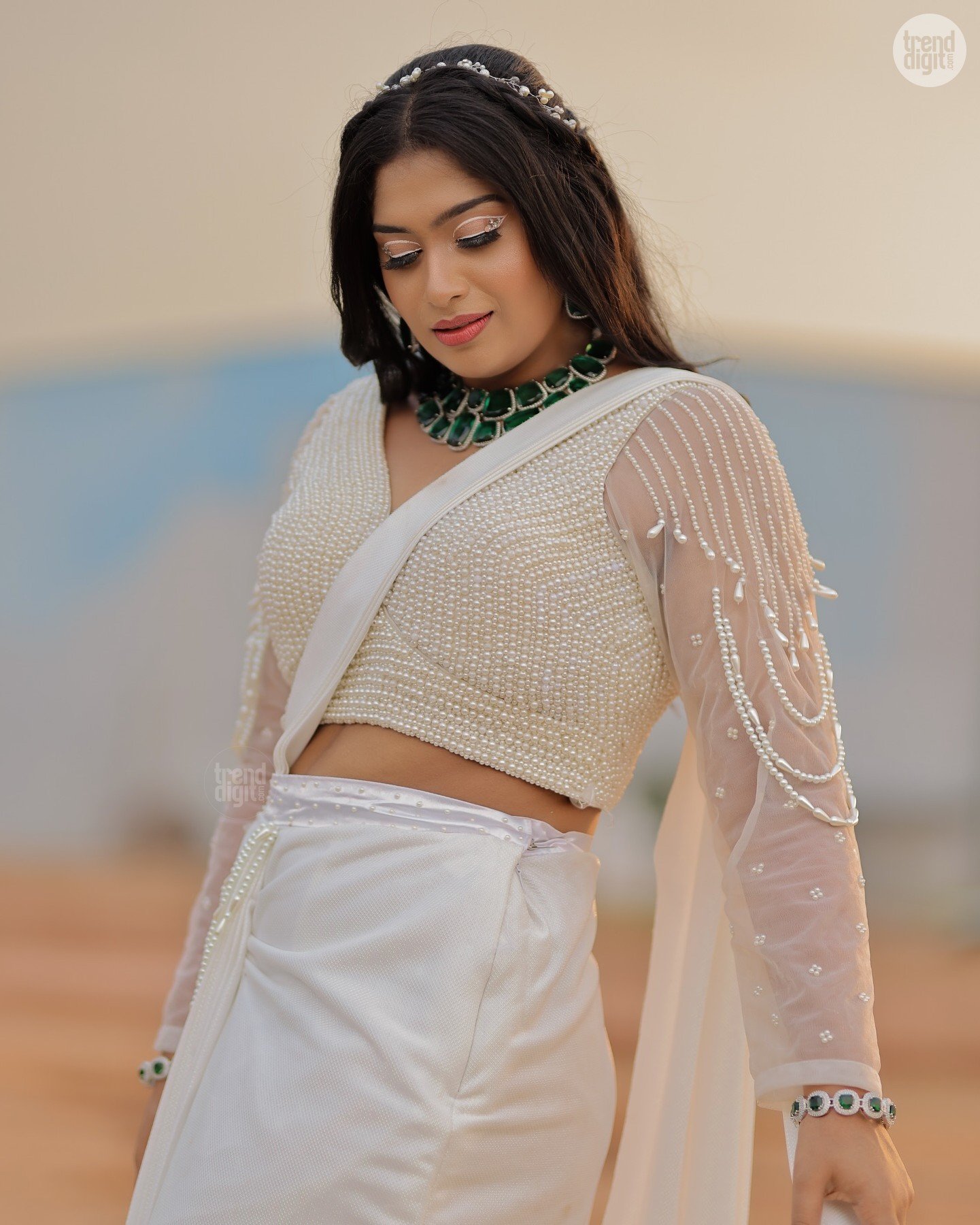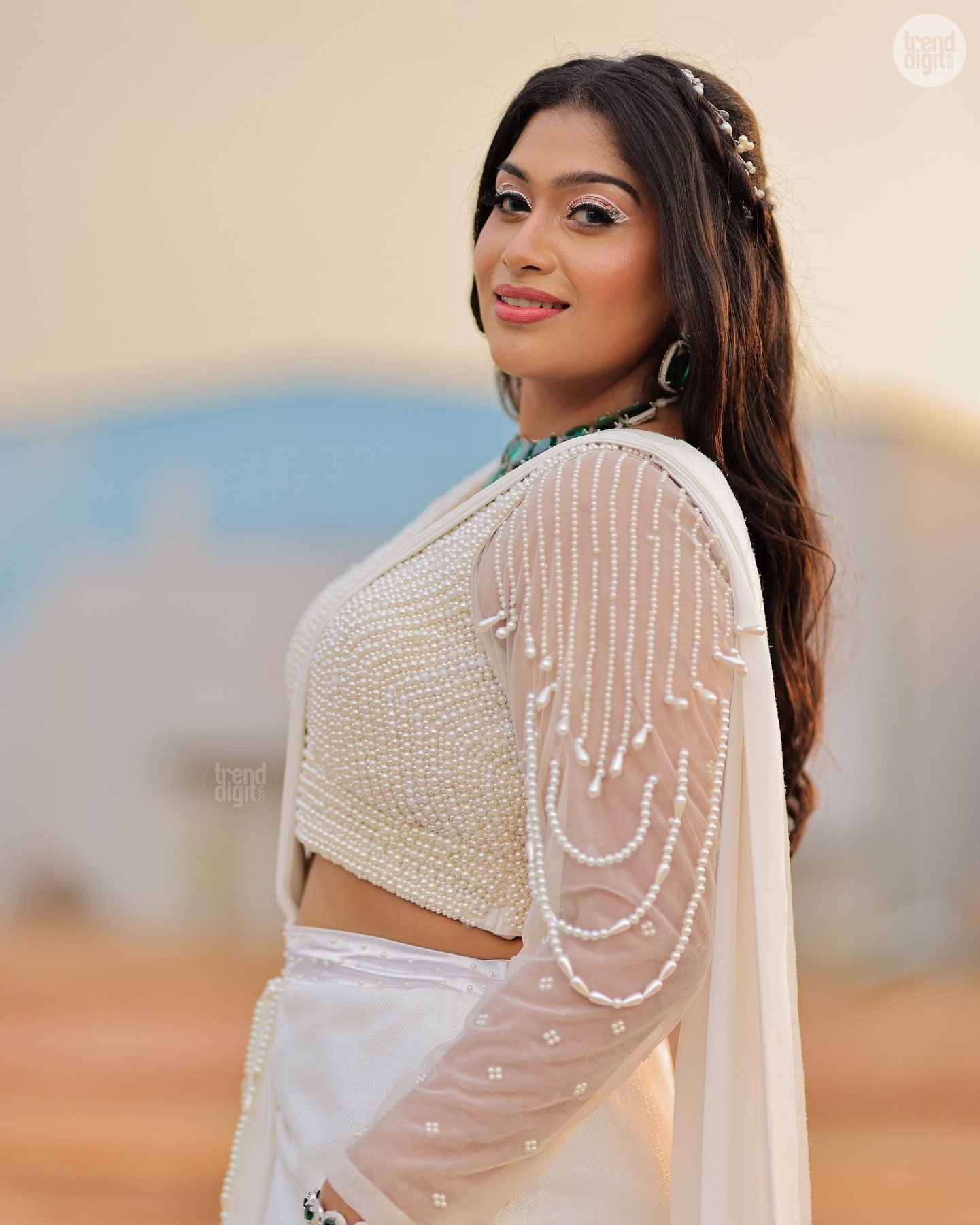 Shobanaa is a Tamil television actress based in India. This photoshoot captures Shobanaa Uthaman in a white pearl saree ensemble, styled outdoors in natural daylight against a soft, neutral backdrop. The setting enhances the calm elegance of the look while keeping the focus on detailing and texture.