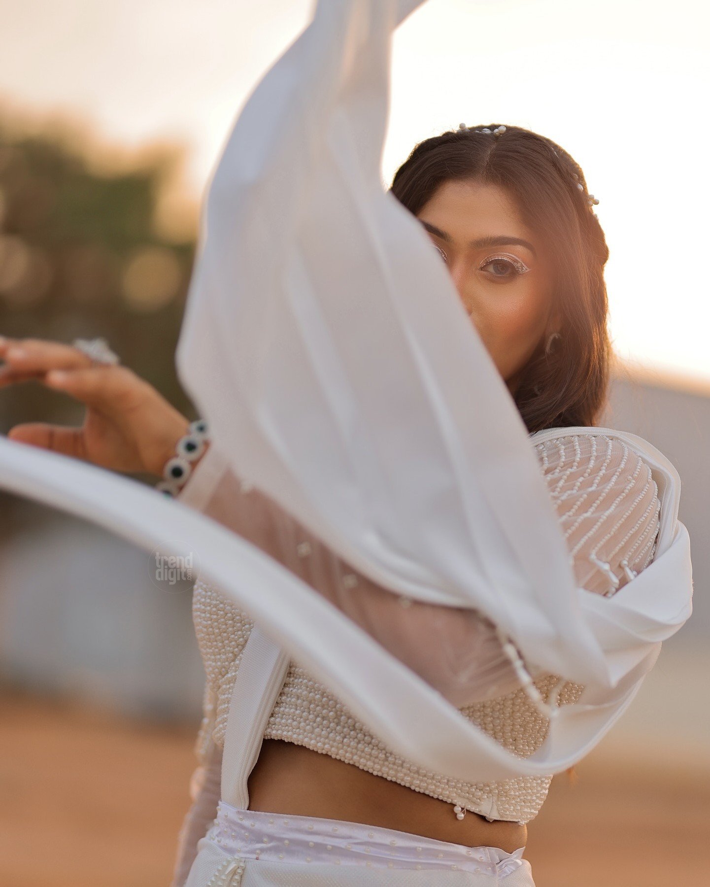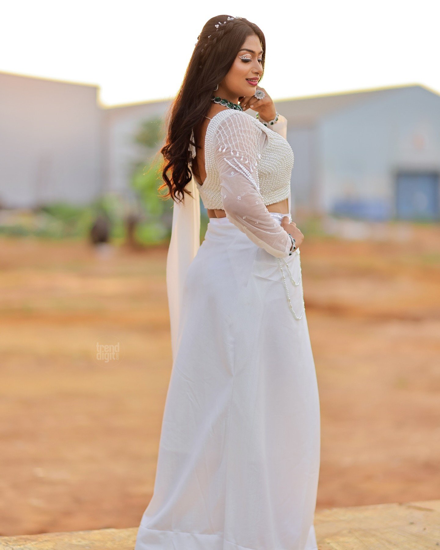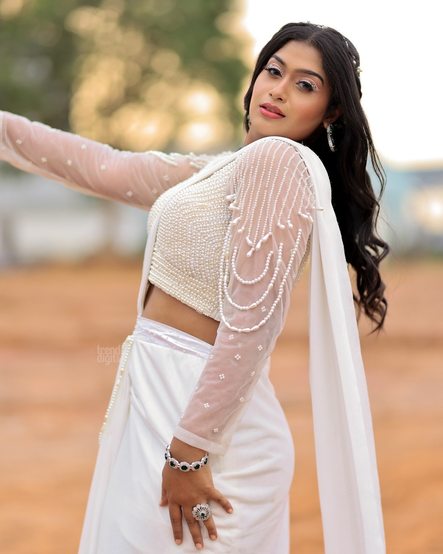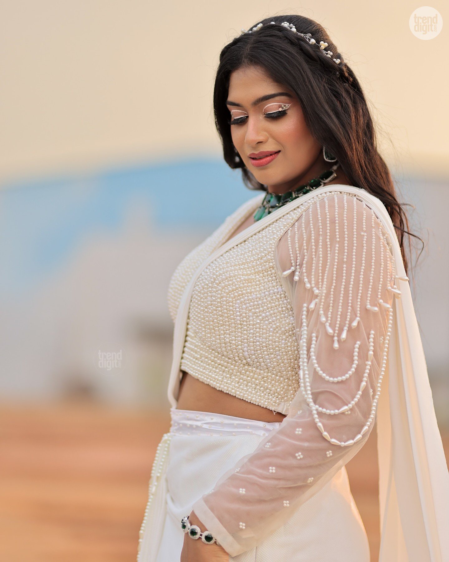 Shobanaa is a Tamil television actress based in India. This photoshoot captures Shobanaa Uthaman in a white pearl saree ensemble, styled outdoors in natural daylight against a soft, neutral backdrop. The setting enhances the calm elegance of the look while keeping the focus on detailing and texture.