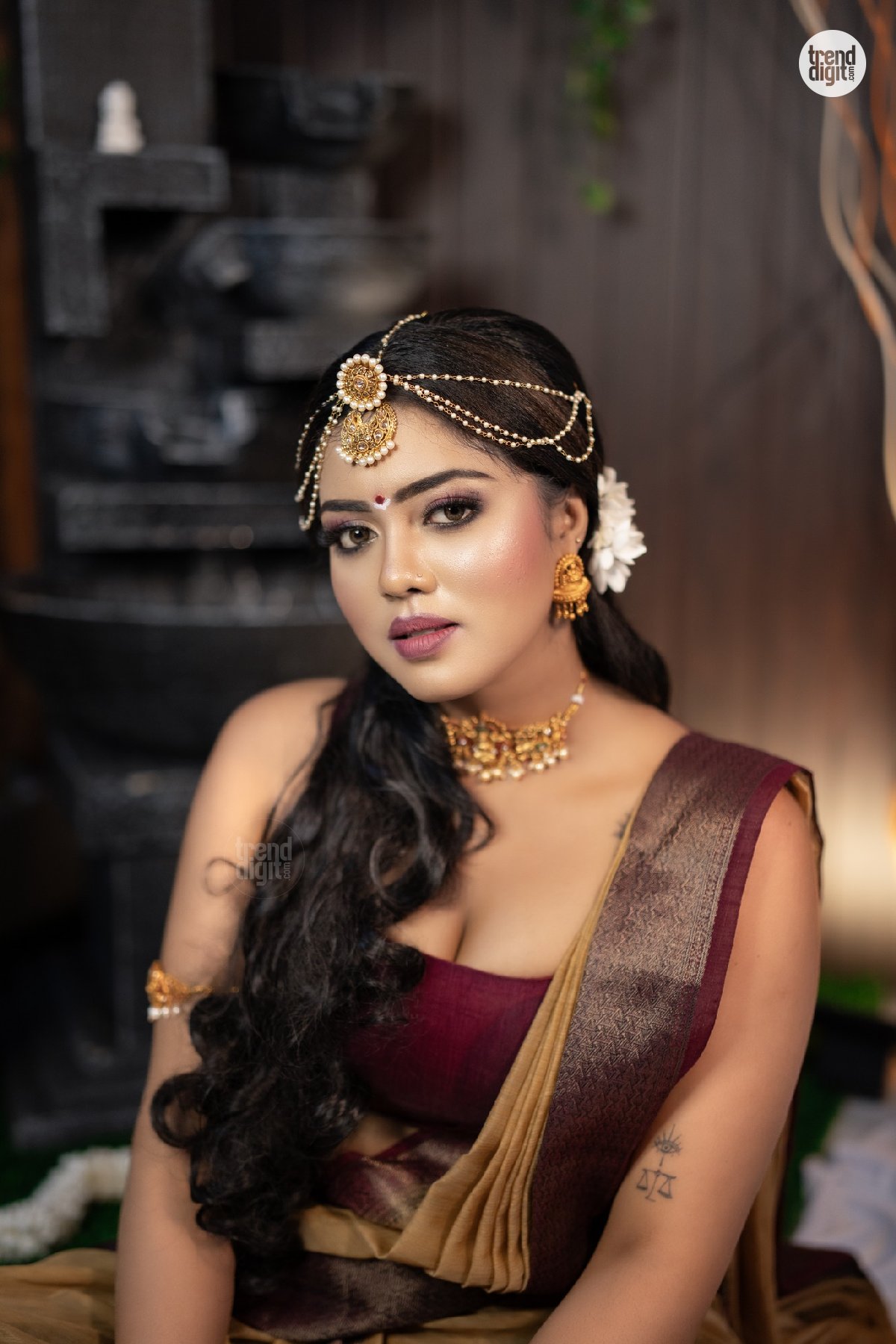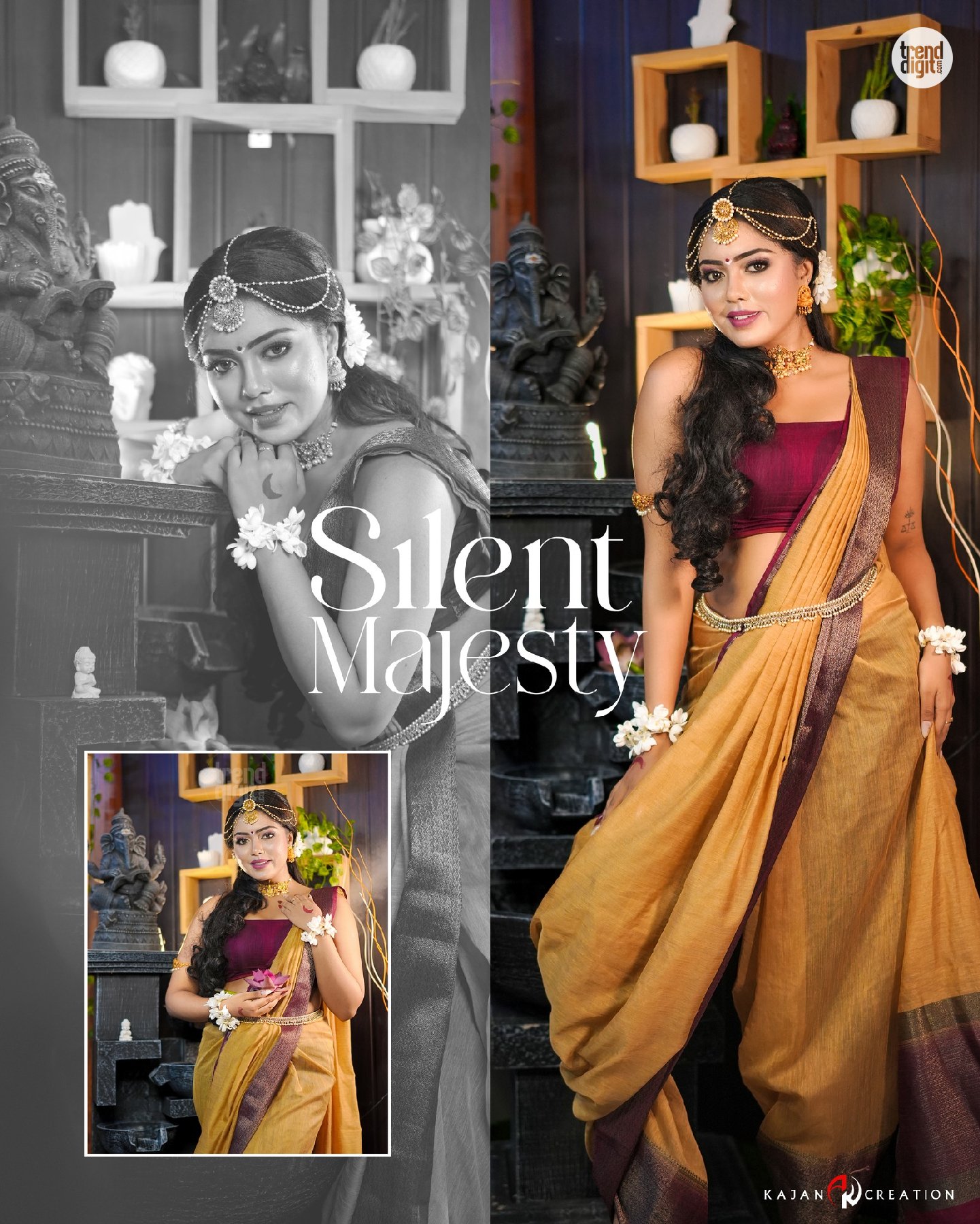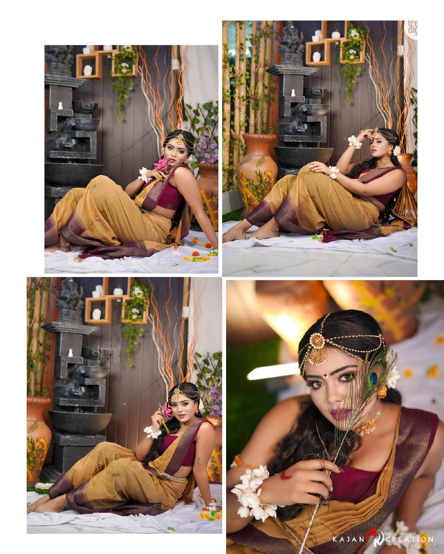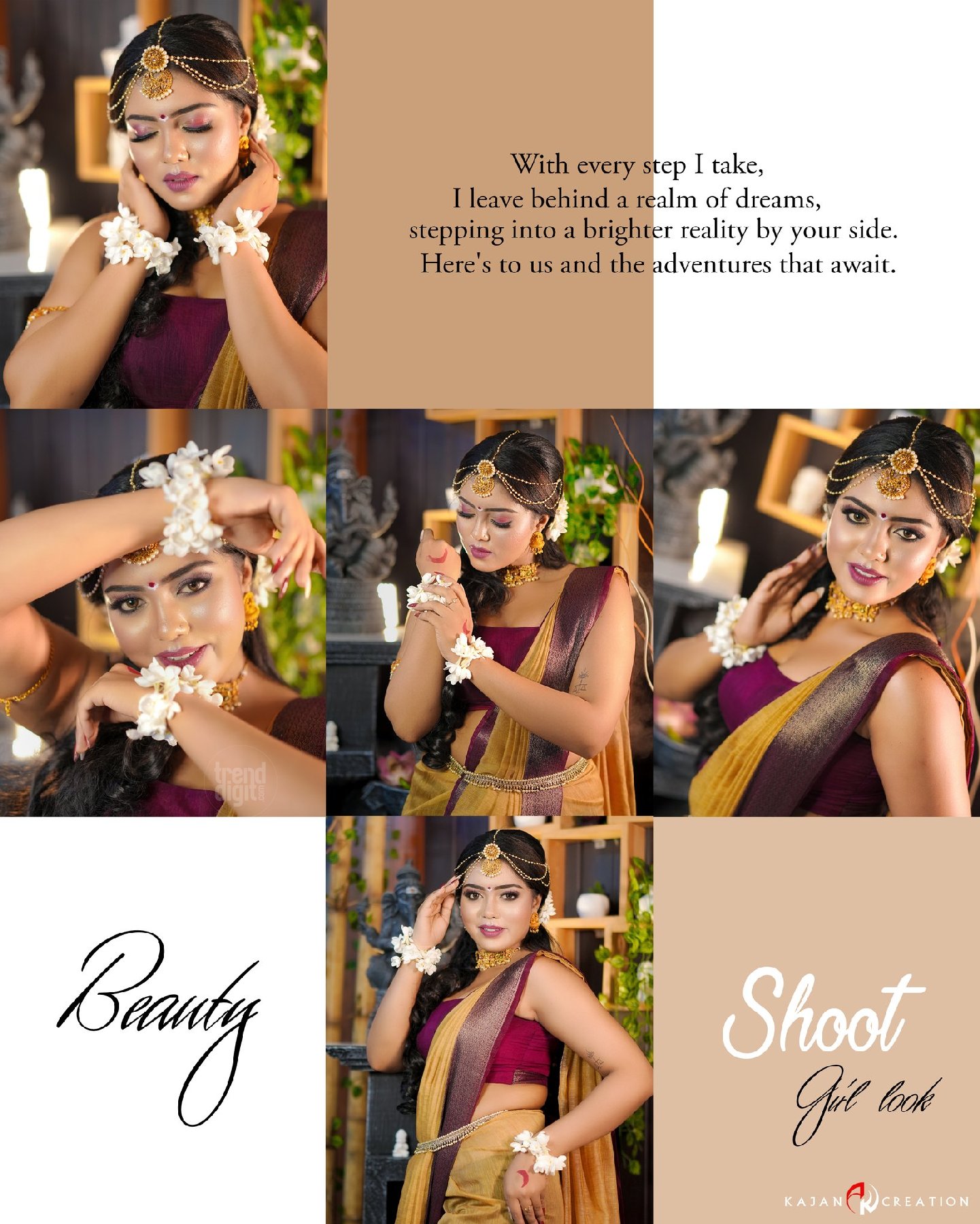 The photography by Kajan AK Creation focuses on controlled lighting and detailed framing, ensuring clarity across both close-ups and full-length shots. Makeup by Thadsha Beauty Parlour features a soft glam finish with highlighted skin and defined eye makeup. The overall visual execution balances warm tones and texture-rich styling.