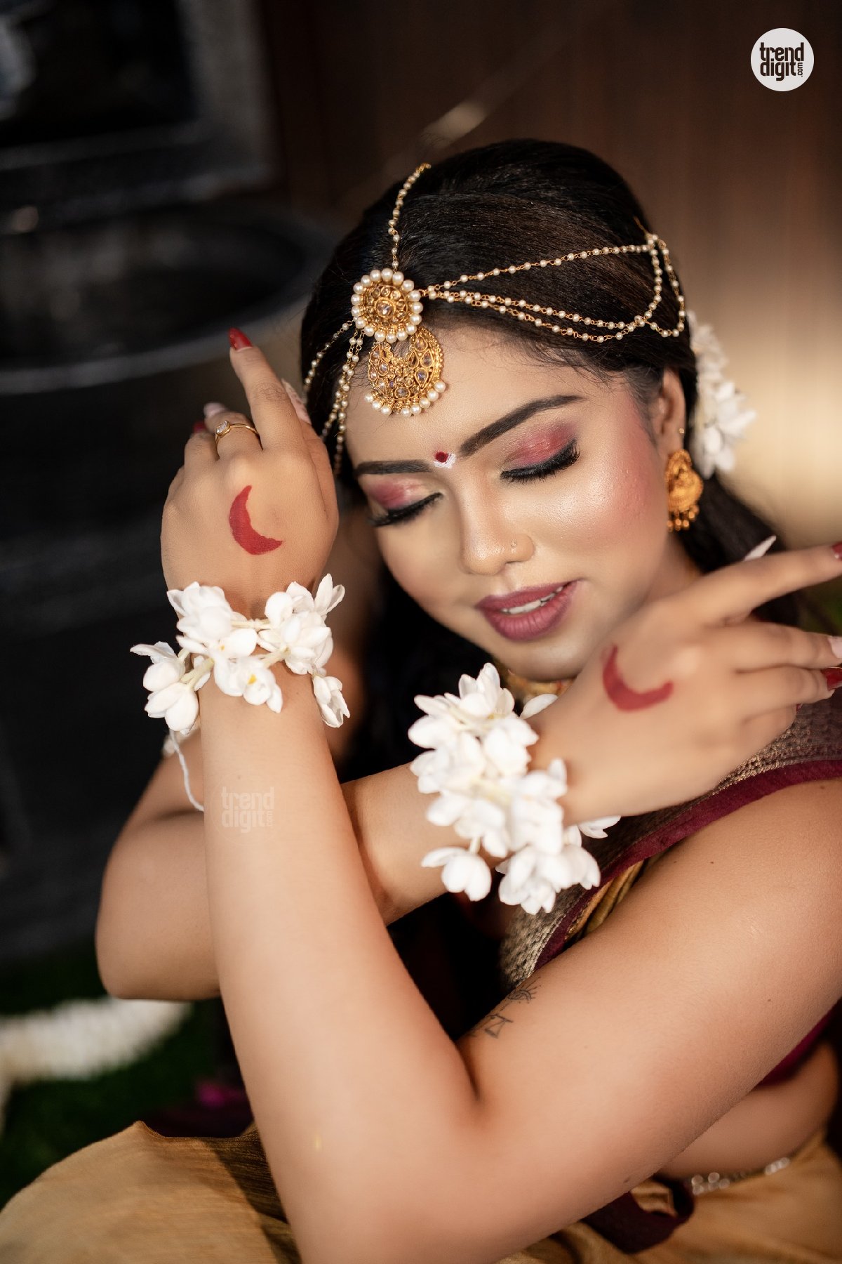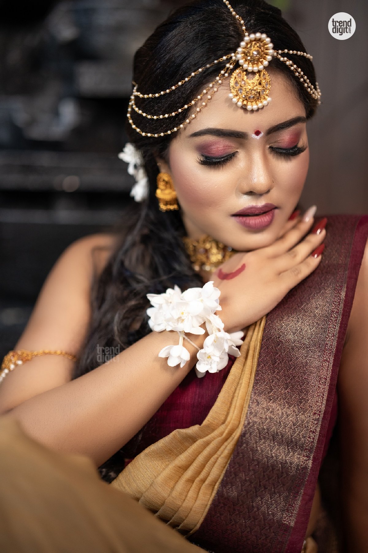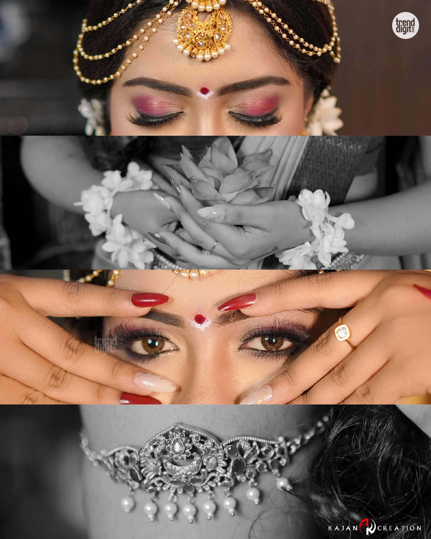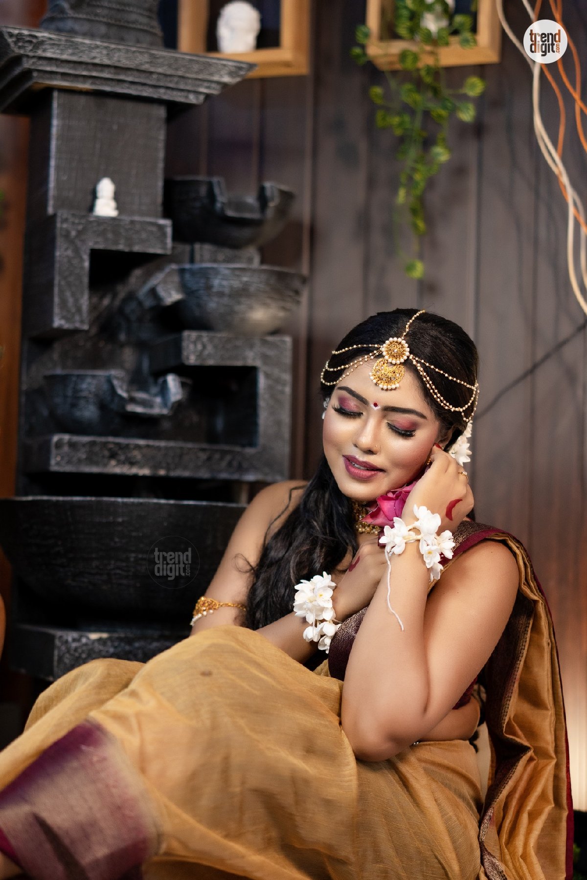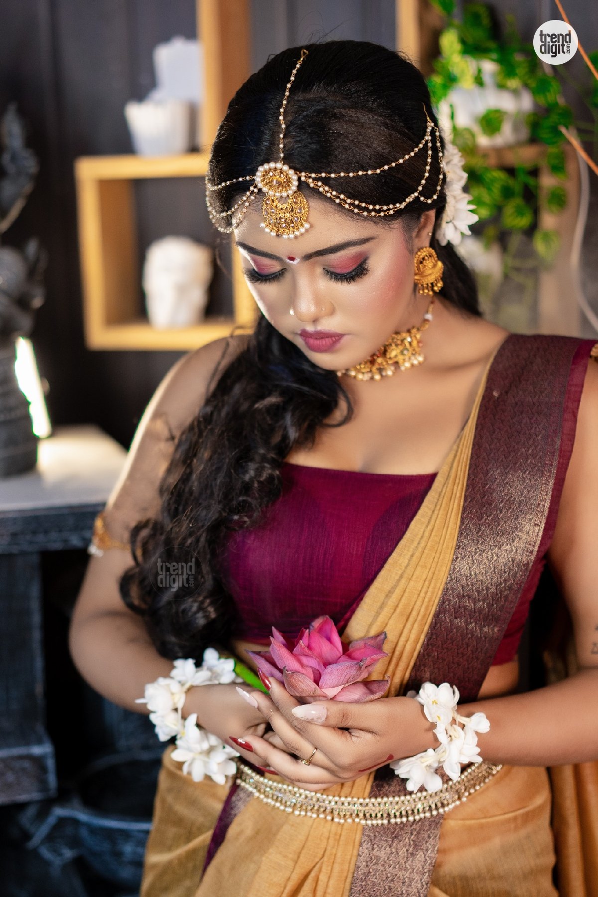 The photography by Kajan AK Creation focuses on controlled lighting and detailed framing, ensuring clarity across both close-ups and full-length shots. Makeup by Thadsha Beauty Parlour features a soft glam finish with highlighted skin and defined eye makeup. The overall visual execution balances warm tones and texture-rich styling.