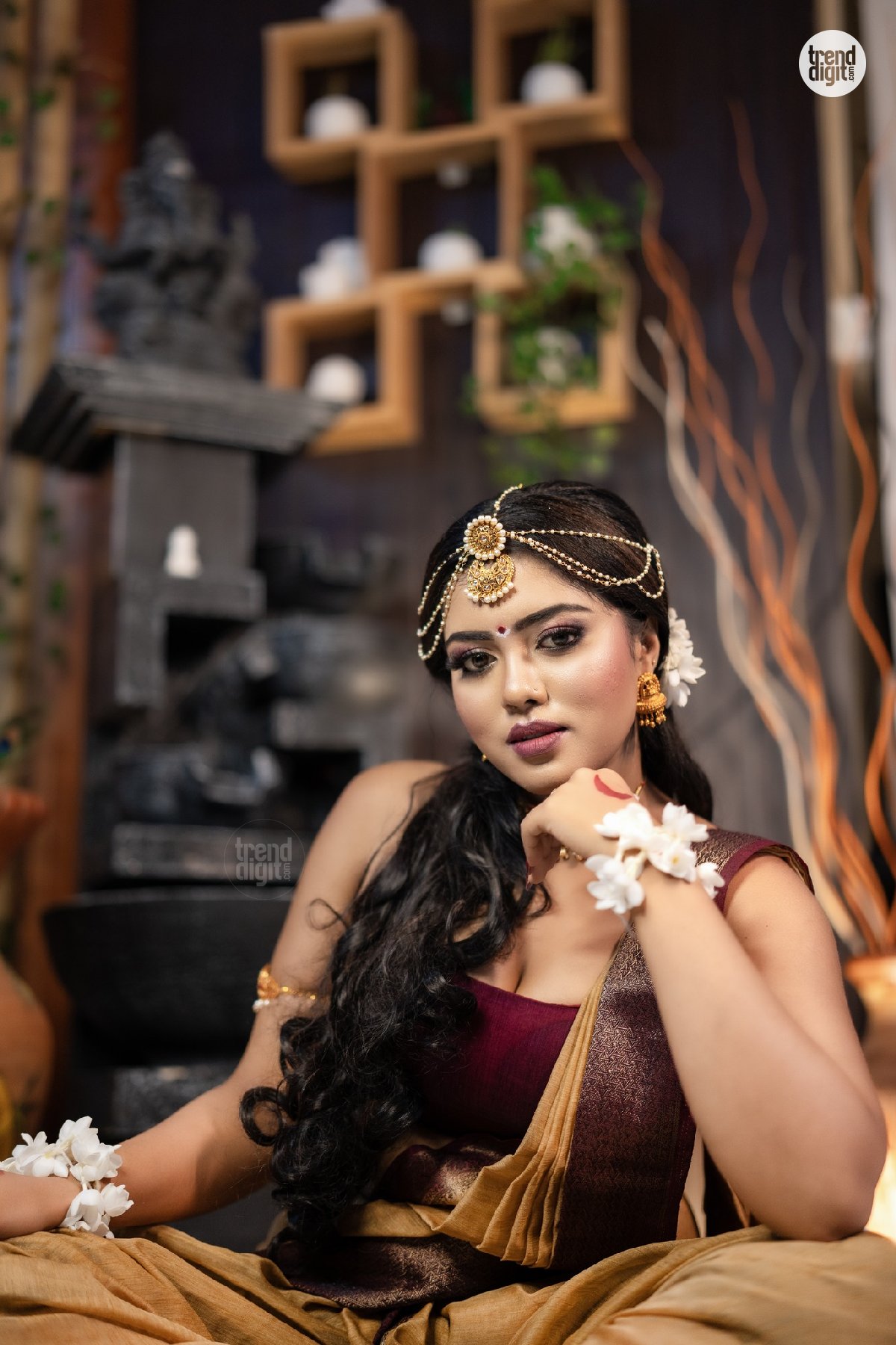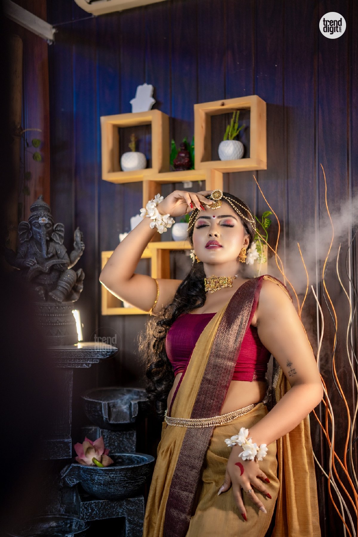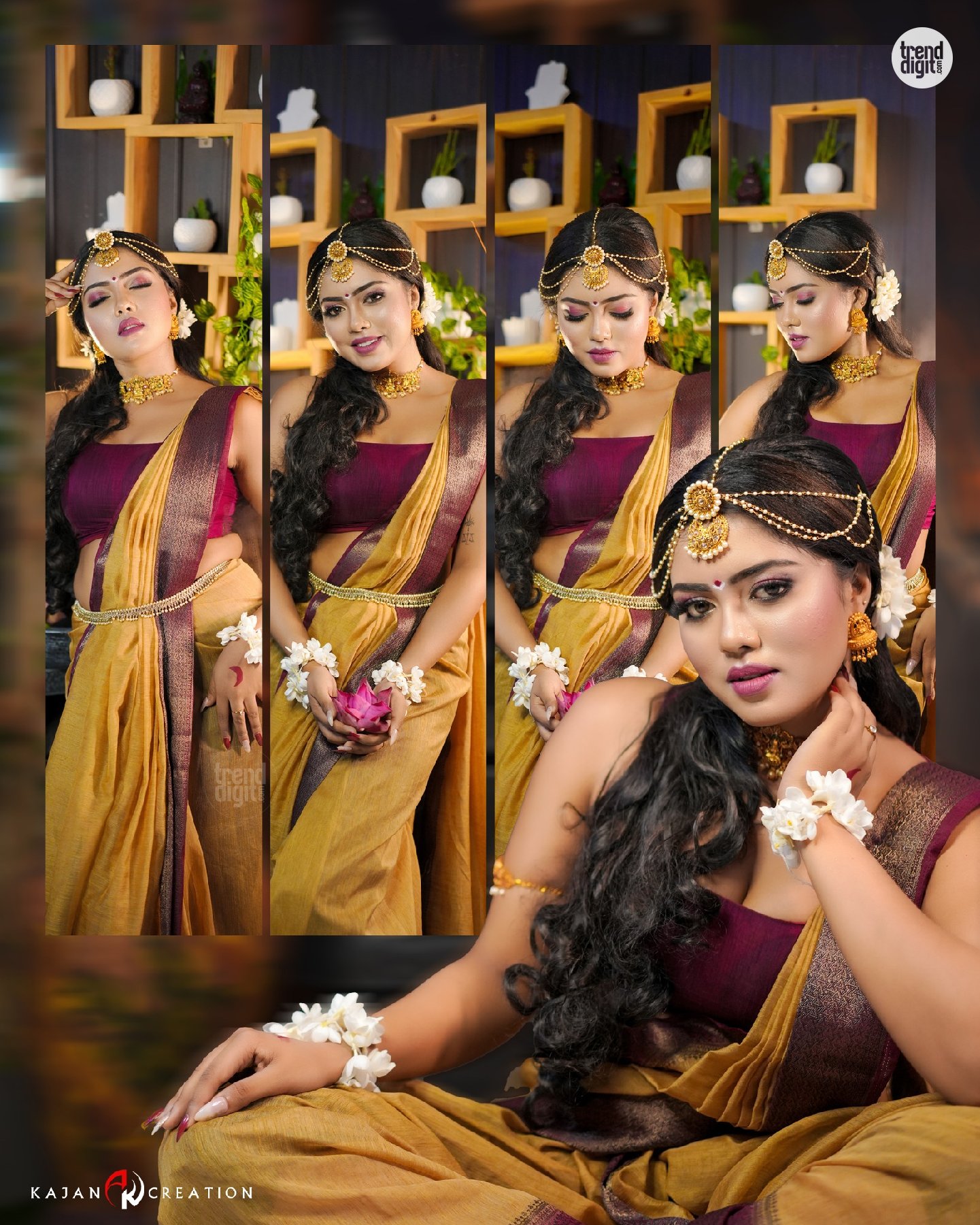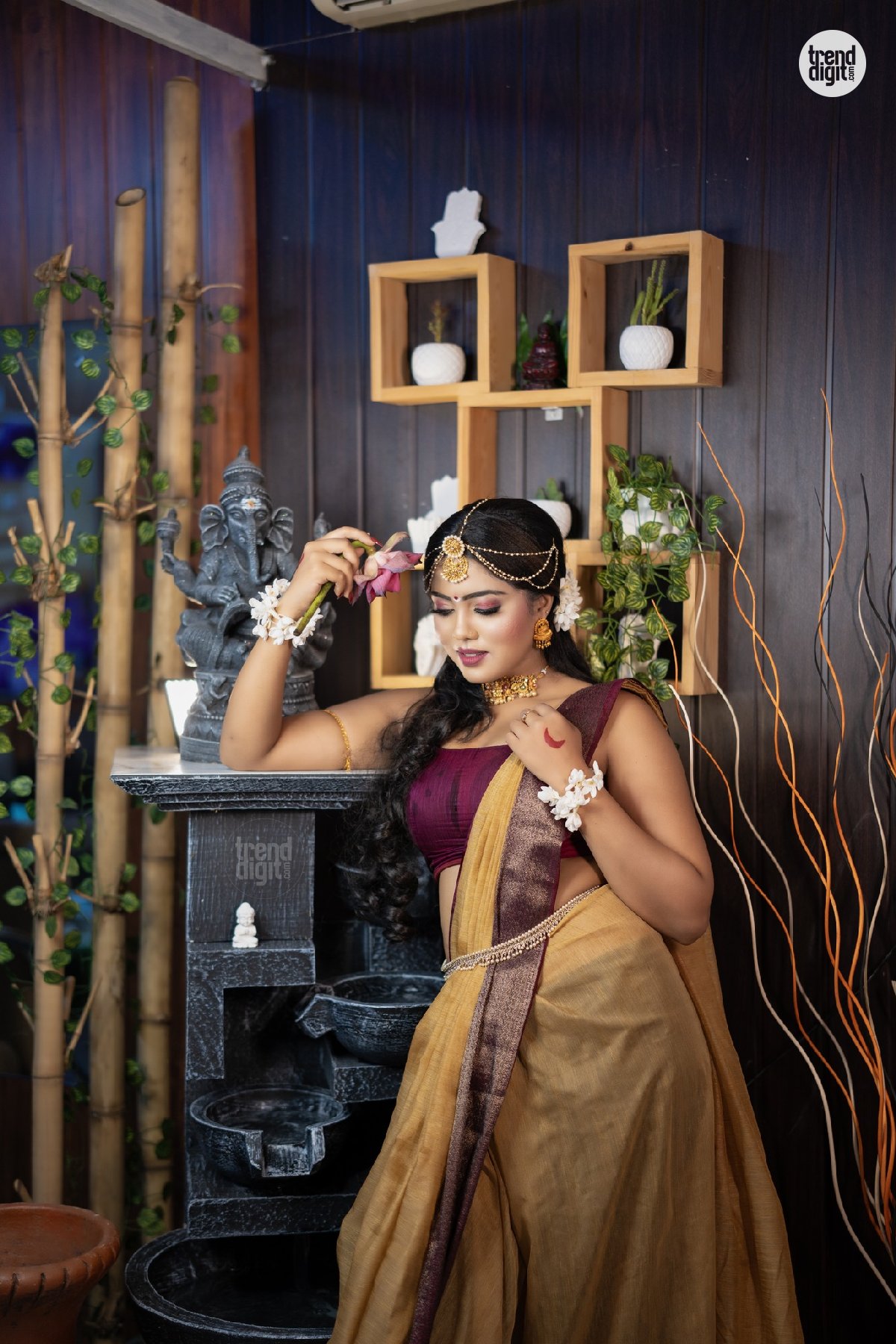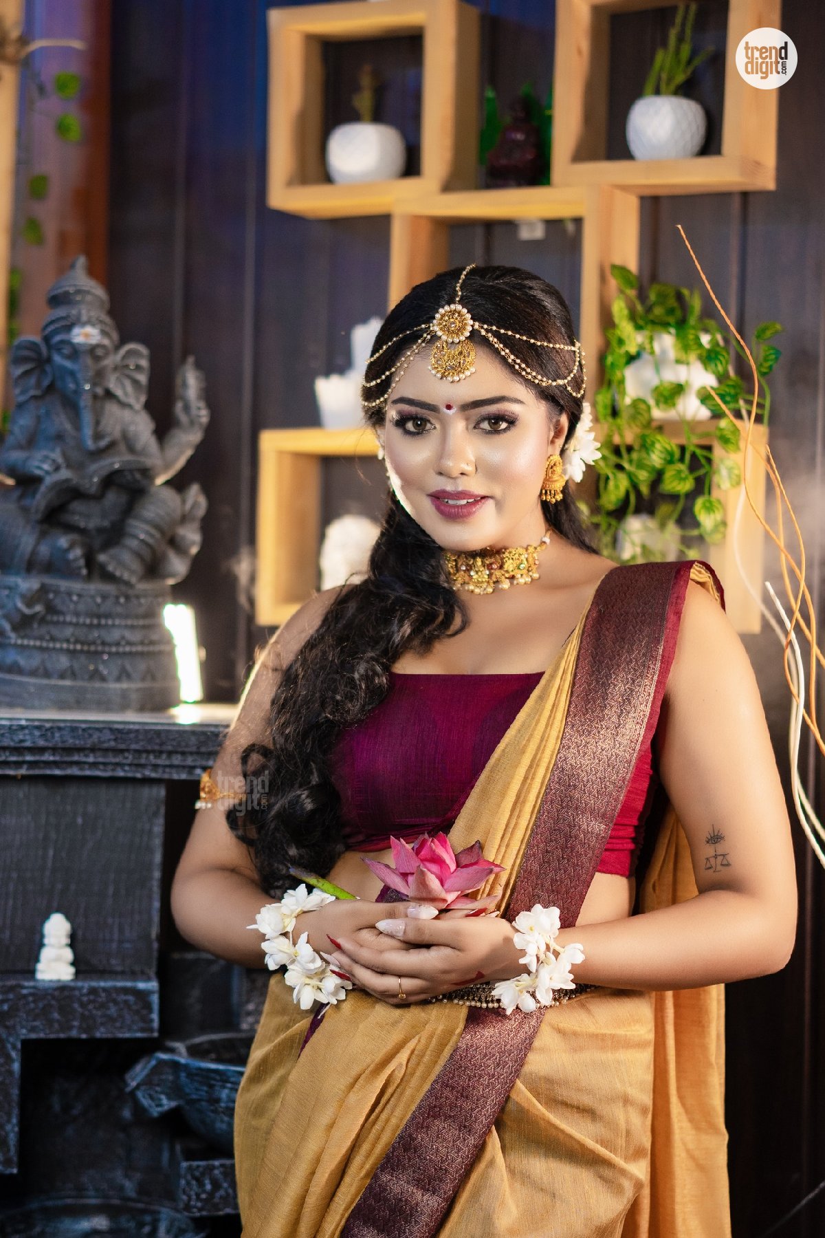 Sithmi Adithya is a Sri Lanka-based model known for bridal and fashion visuals. This Sithmi Adithya Golden Saree Traditional Look photoshoot is captured in an indoor studio setting using warm ambient lighting and decorative traditional backdrops. The setup highlights cultural elements with a composed and styled environment.