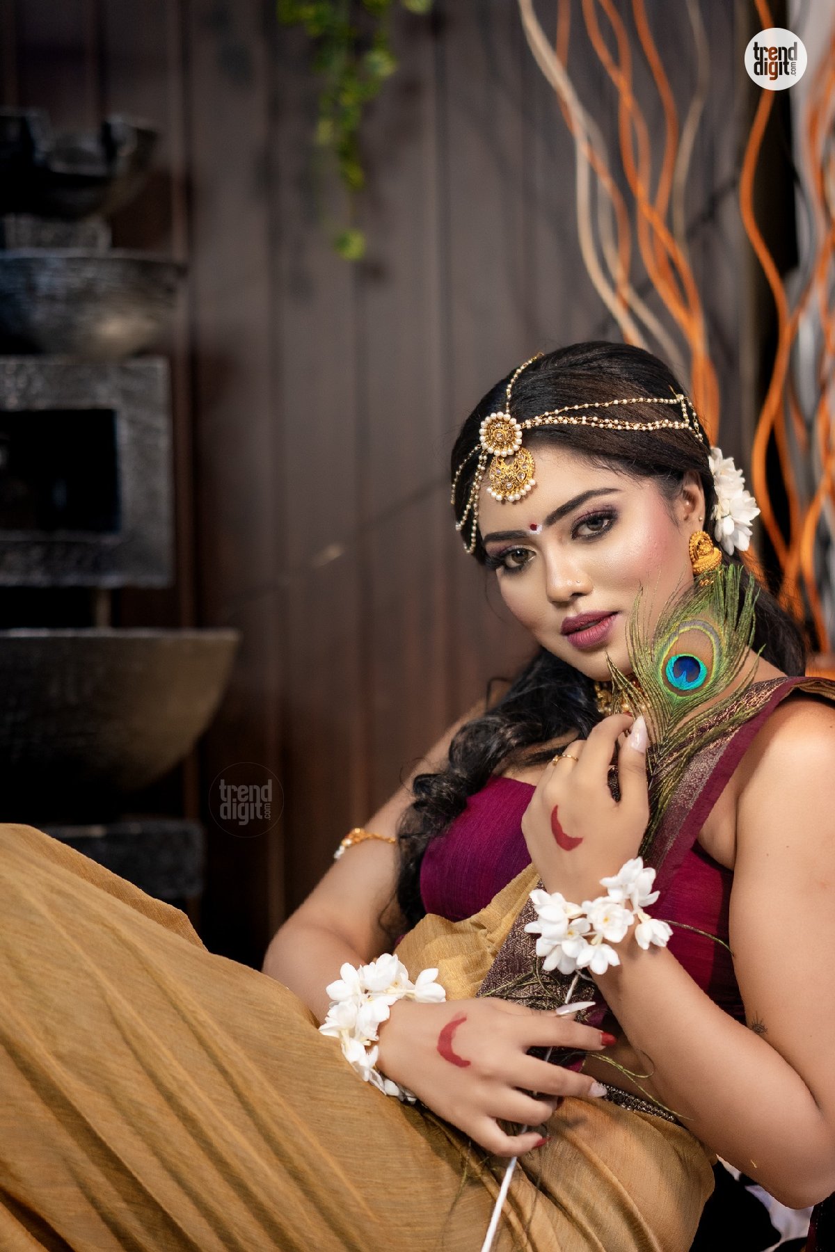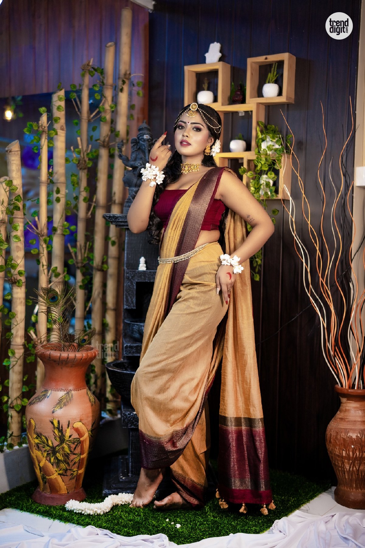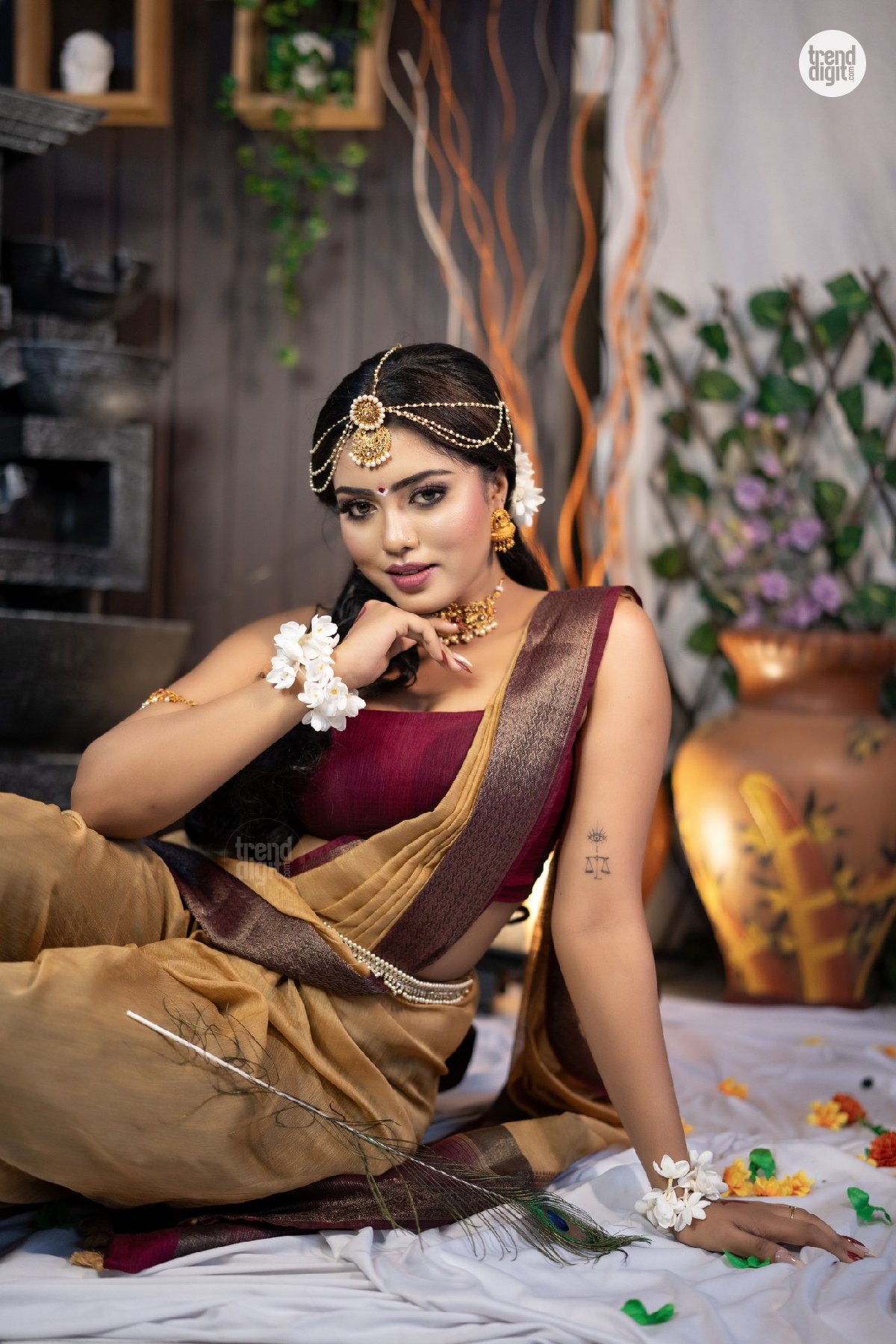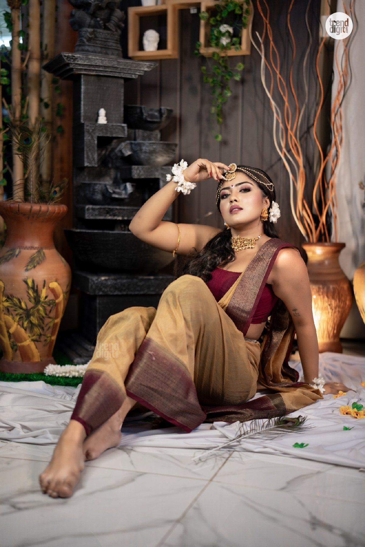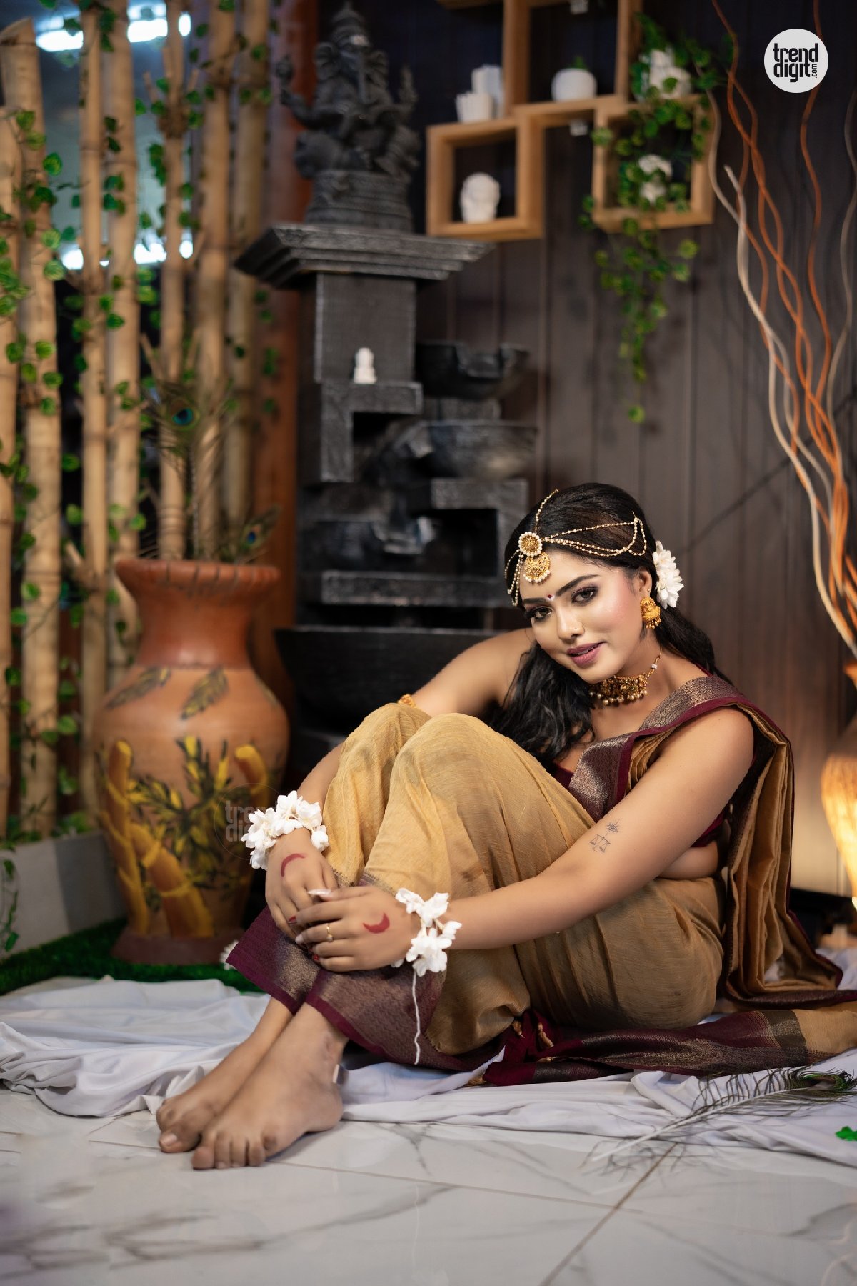 Sithmi Adithya is a Sri Lanka-based model known for bridal and fashion visuals. This Sithmi Adithya Golden Saree Traditional Look photoshoot is captured in an indoor studio setting using warm ambient lighting and decorative traditional backdrops. The setup highlights cultural elements with a composed and styled environment.