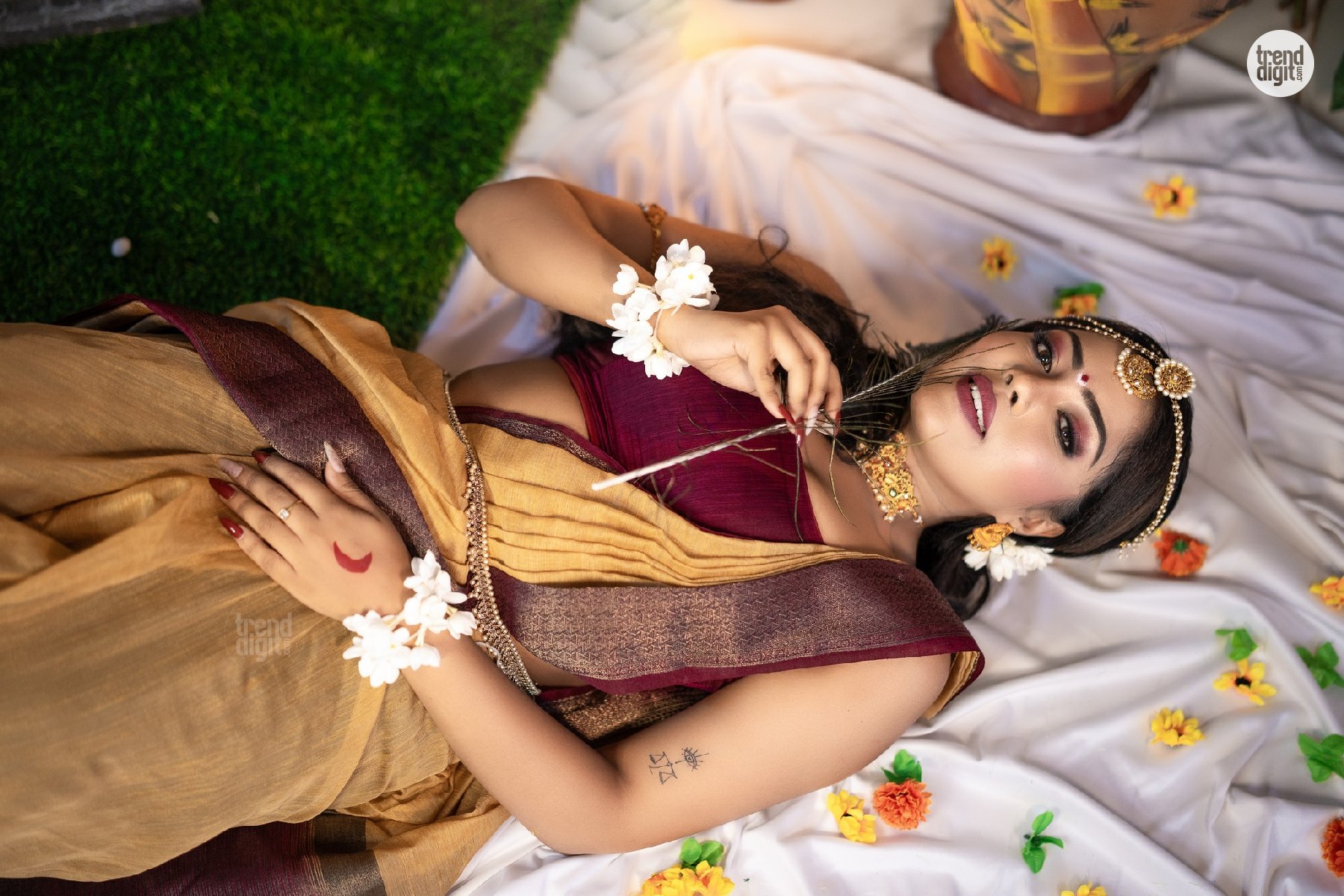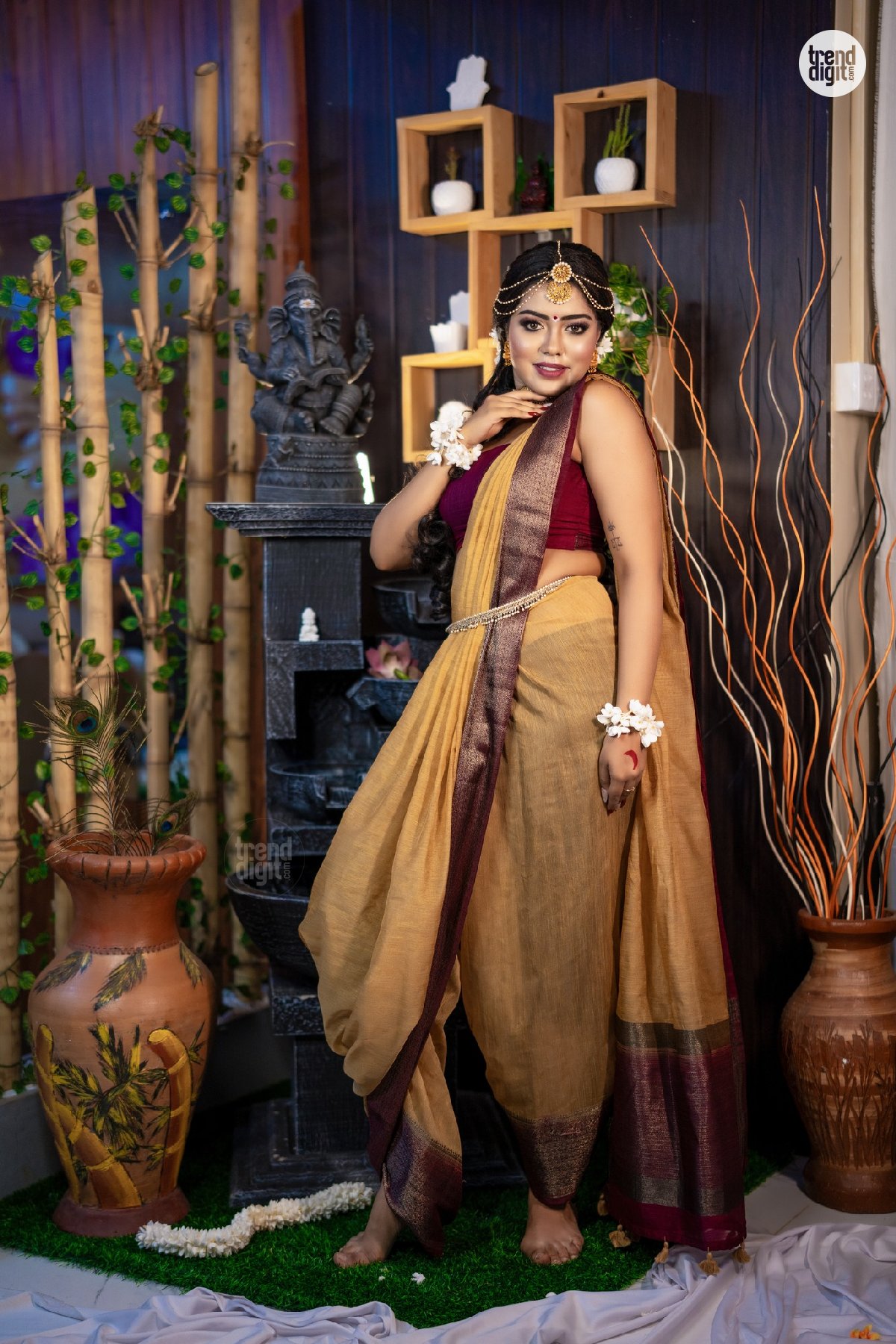 The saree features a golden fabric with a soft sheen, paired with a contrasting maroon blouse that adds depth to the look. The drape is structured with a clean silhouette, while jewellery includes a choker, earrings, and a headpiece. Fresh white floral accessories on the wrists and hair enhance the traditional aesthetic.