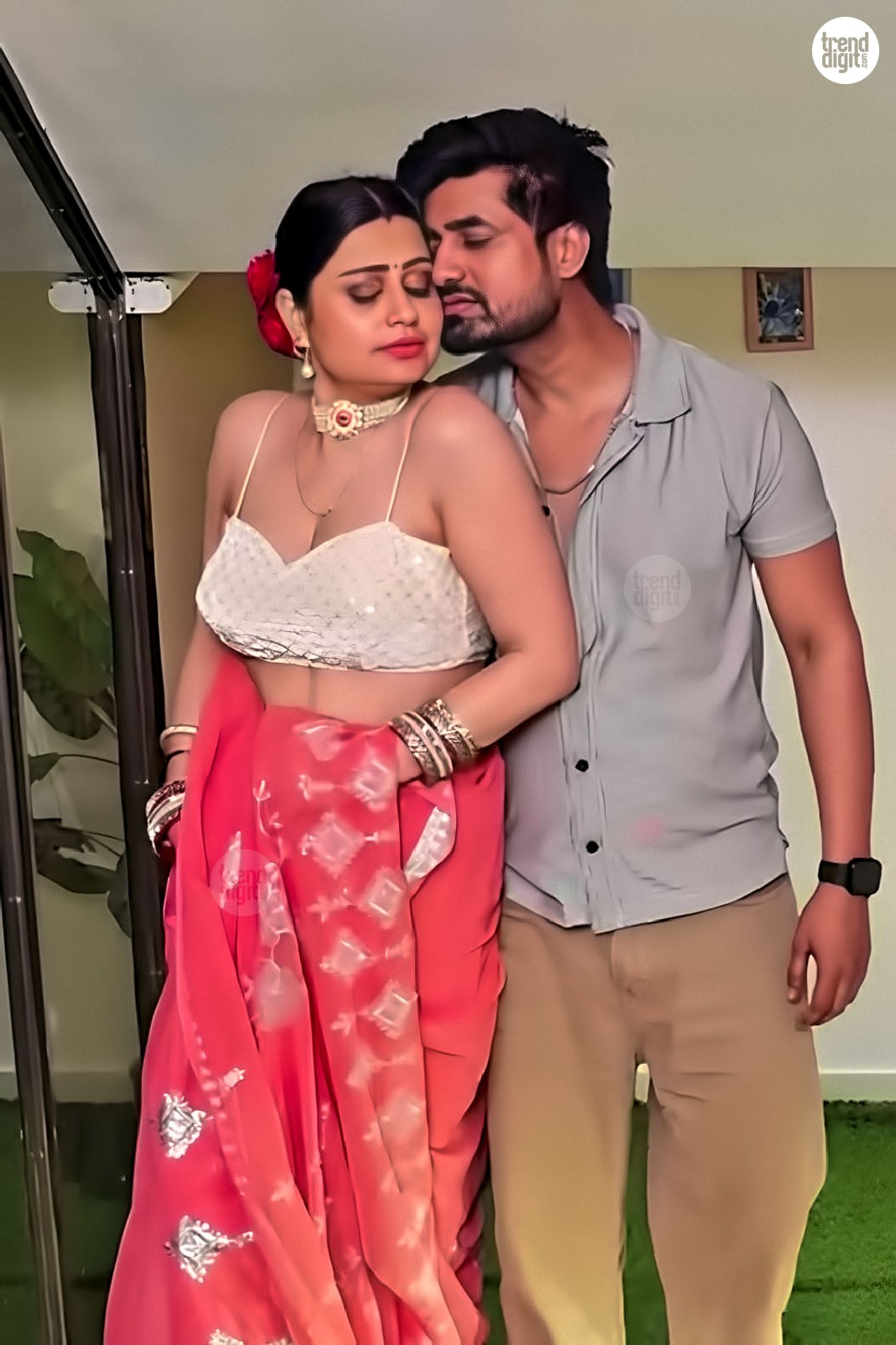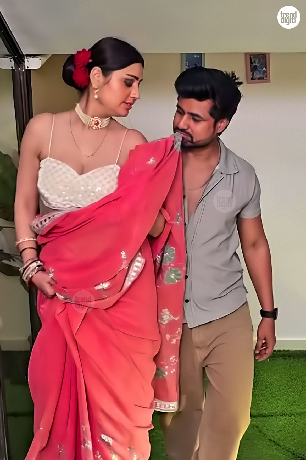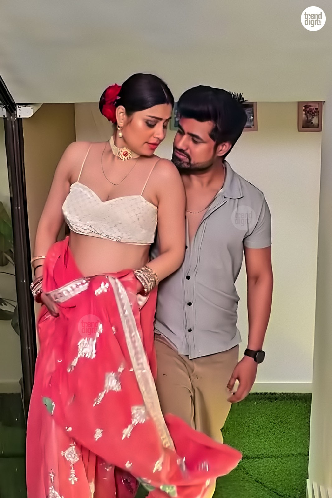 The setting appears to be indoors with a cozy ambiance, adding a natural and relatable feel to the scenes. The candid moments, including saree draping and soft romantic interactions, give viewers a glimpse into the storyline’s emotional depth.