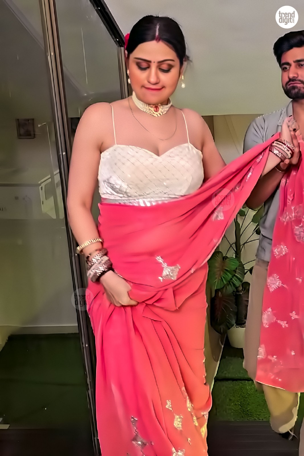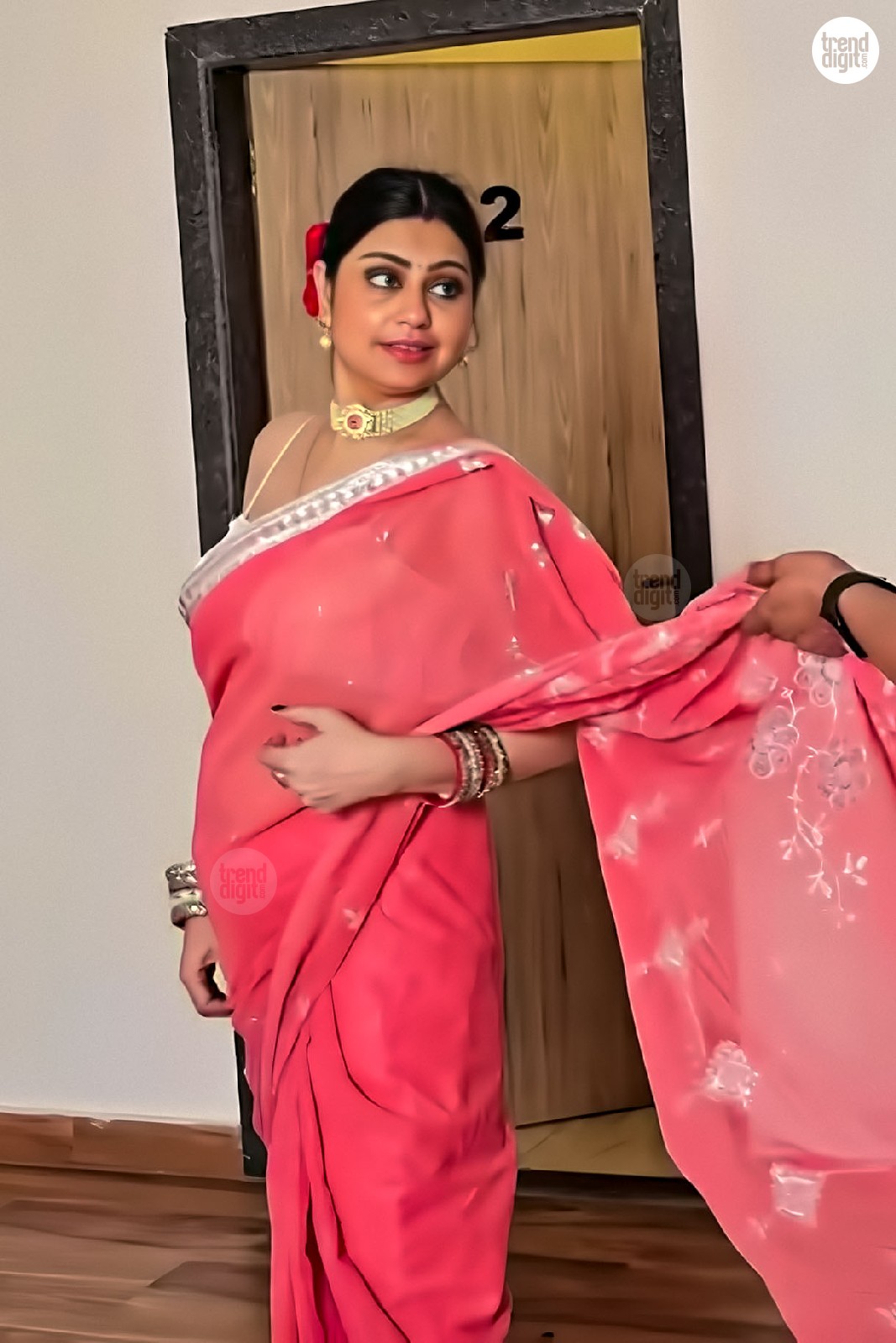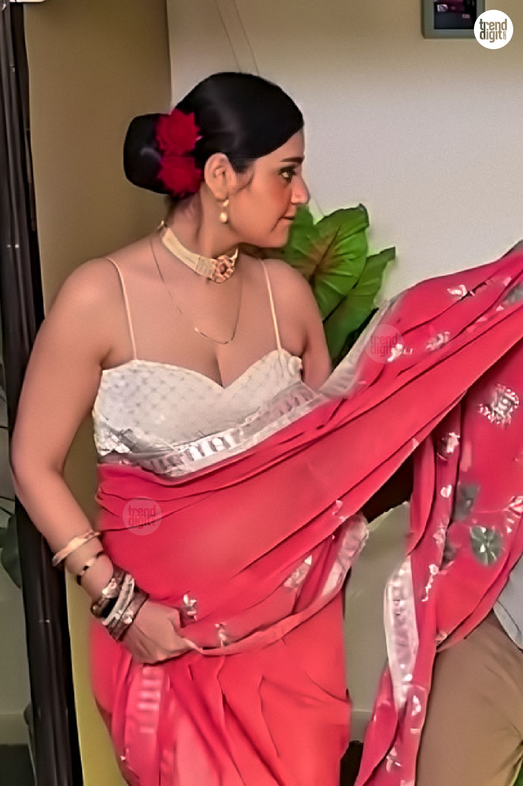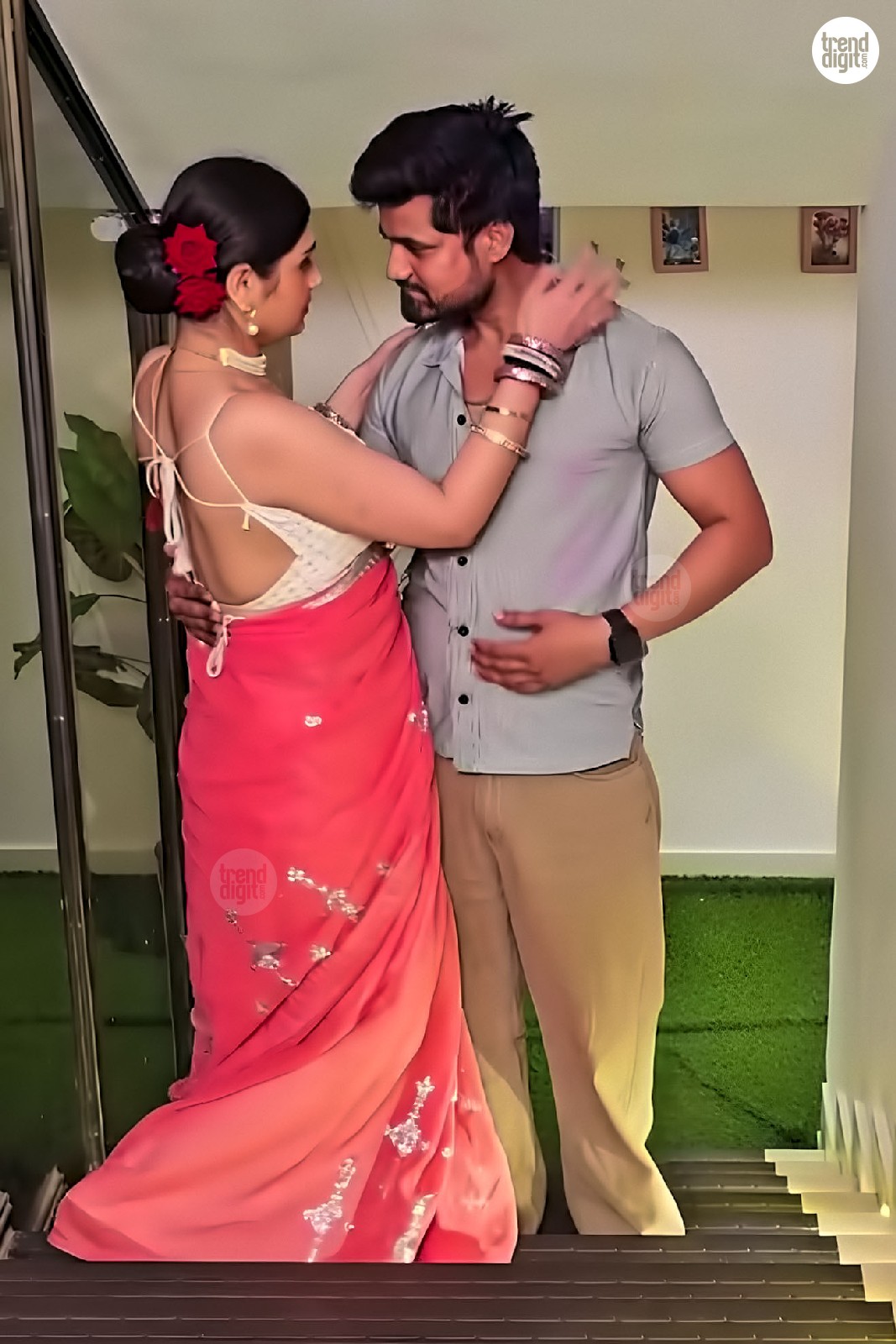 The setting appears to be indoors with a cozy ambiance, adding a natural and relatable feel to the scenes. The candid moments, including saree draping and soft romantic interactions, give viewers a glimpse into the storyline’s emotional depth.