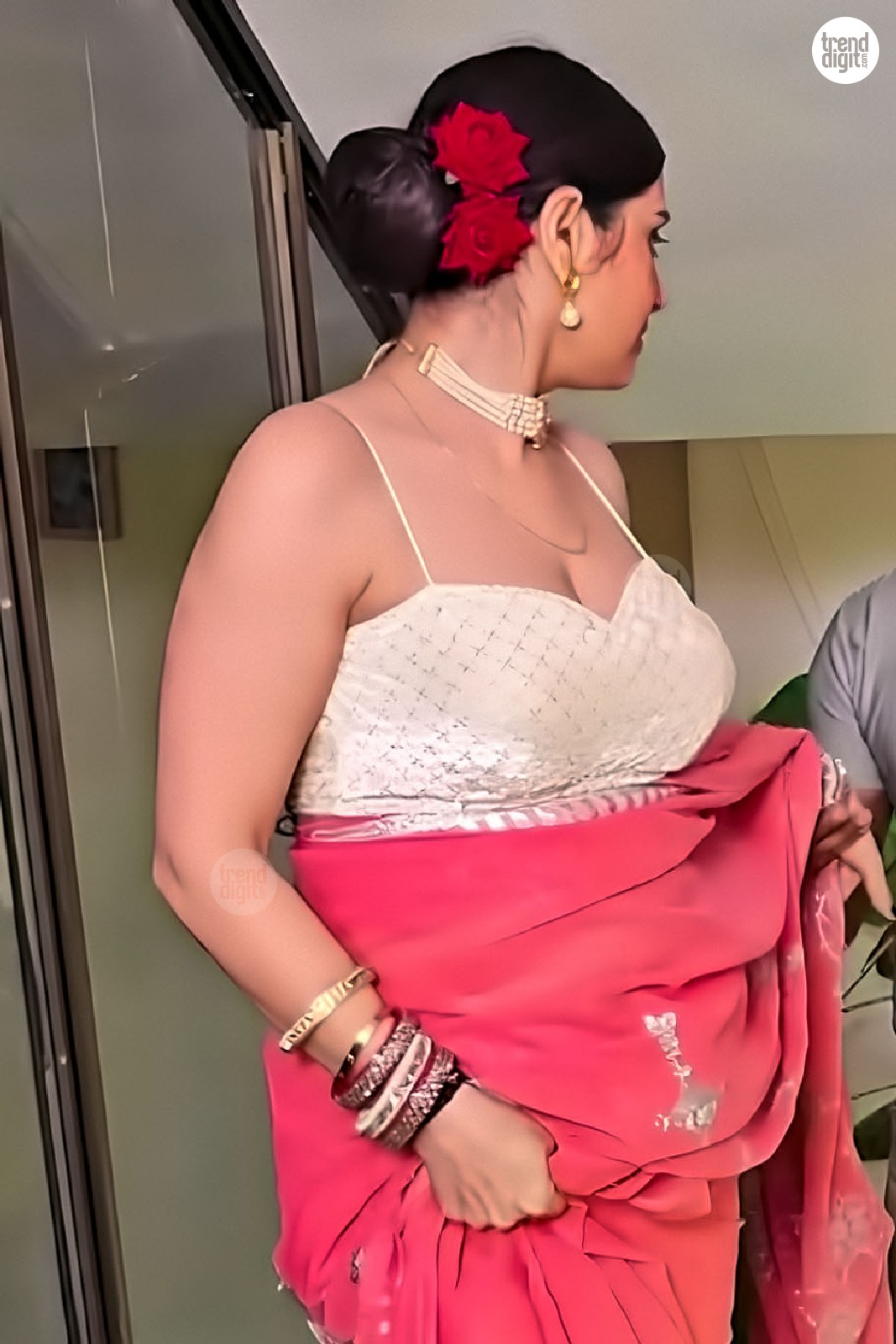 Her accessories elevate the entire look beautifully. She is seen wearing a traditional choker necklace with a central red stone, matching earrings, and multiple bangles that enhance the ethnic charm. The red flowers tucked into her neatly styled bun add a classic desi touch, making her appearance both graceful and eye-catching. Her makeup is subtle yet expressive, with defined eyes and soft lip color that complements the outfit perfectly.