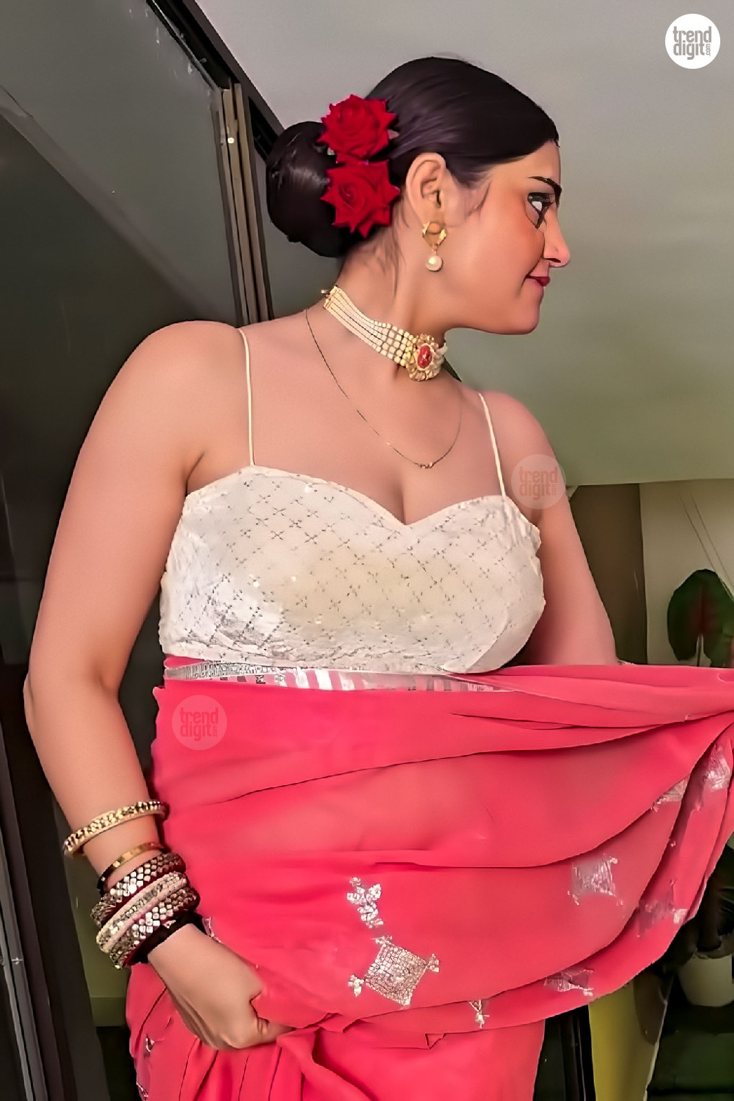 In these photos, Subhangi Sharma looks absolutely mesmerizing in a vibrant red saree paired with a stylish white sleeveless blouse. The blouse has a delicate textured pattern and thin straps, giving it a modern yet elegant appeal. The saree drape is soft and flowy, with subtle silver motifs adding a hint of shimmer and sophistication.