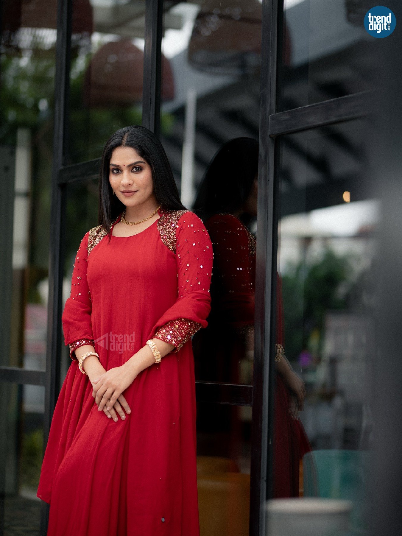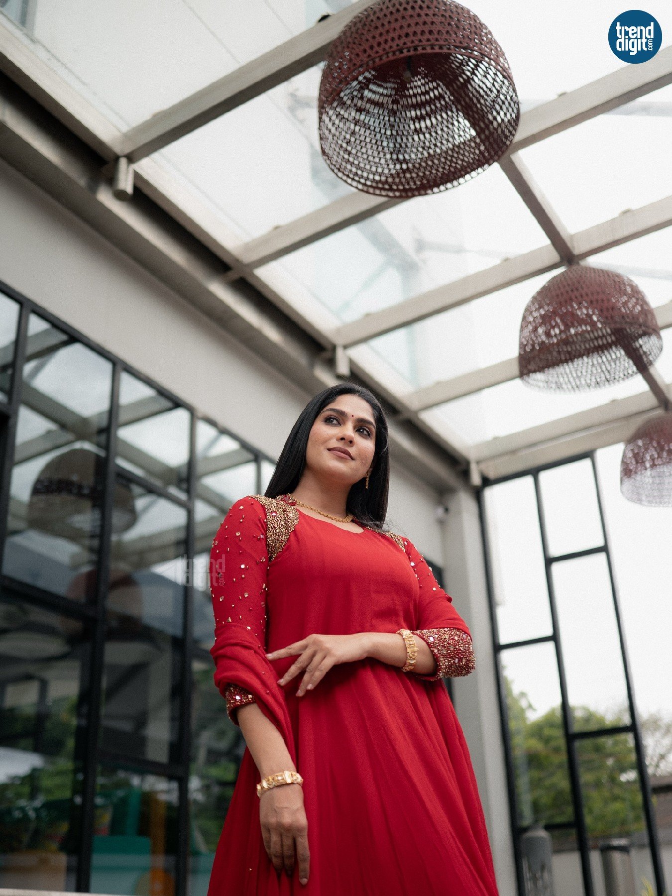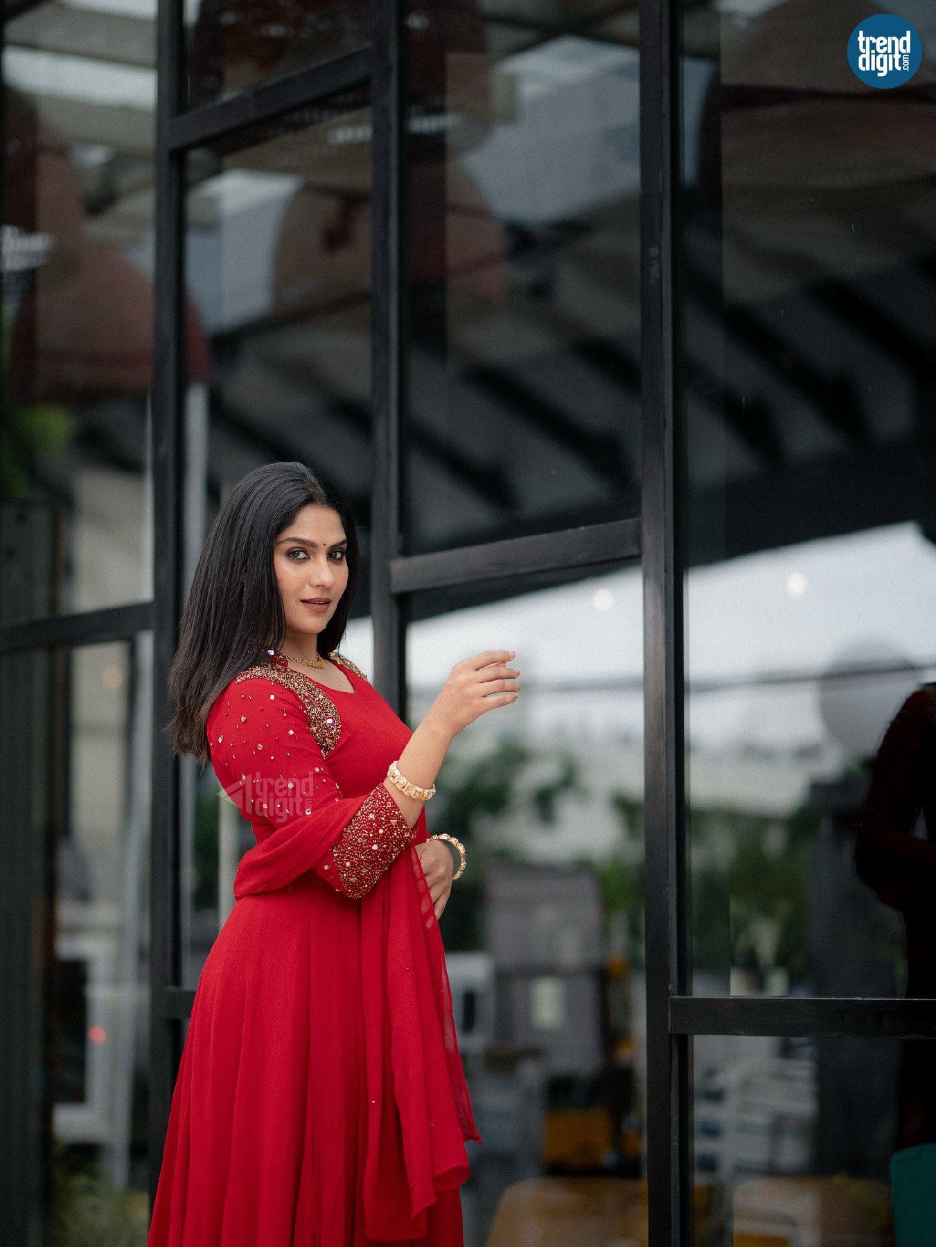 Swasika is an Indian actress and television presenter known for her work in Malayalam cinema and television. This photoshoot takes place in a contemporary indoor-outdoor setting, captured using diffused daylight against glass and metal structures. The environment contrasts clean lines with traditional attire.