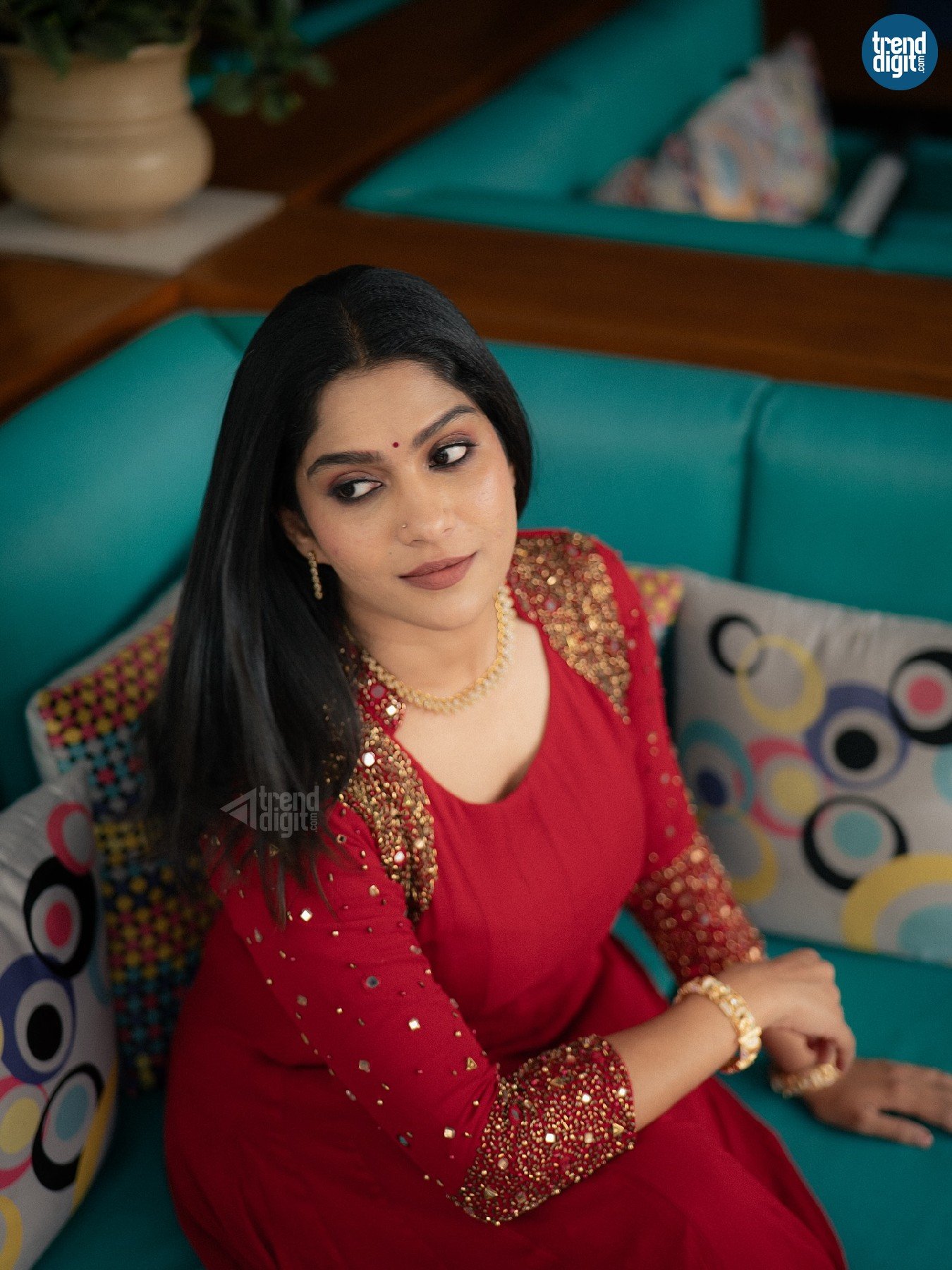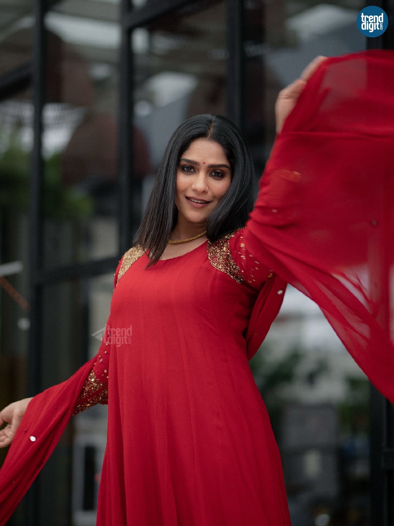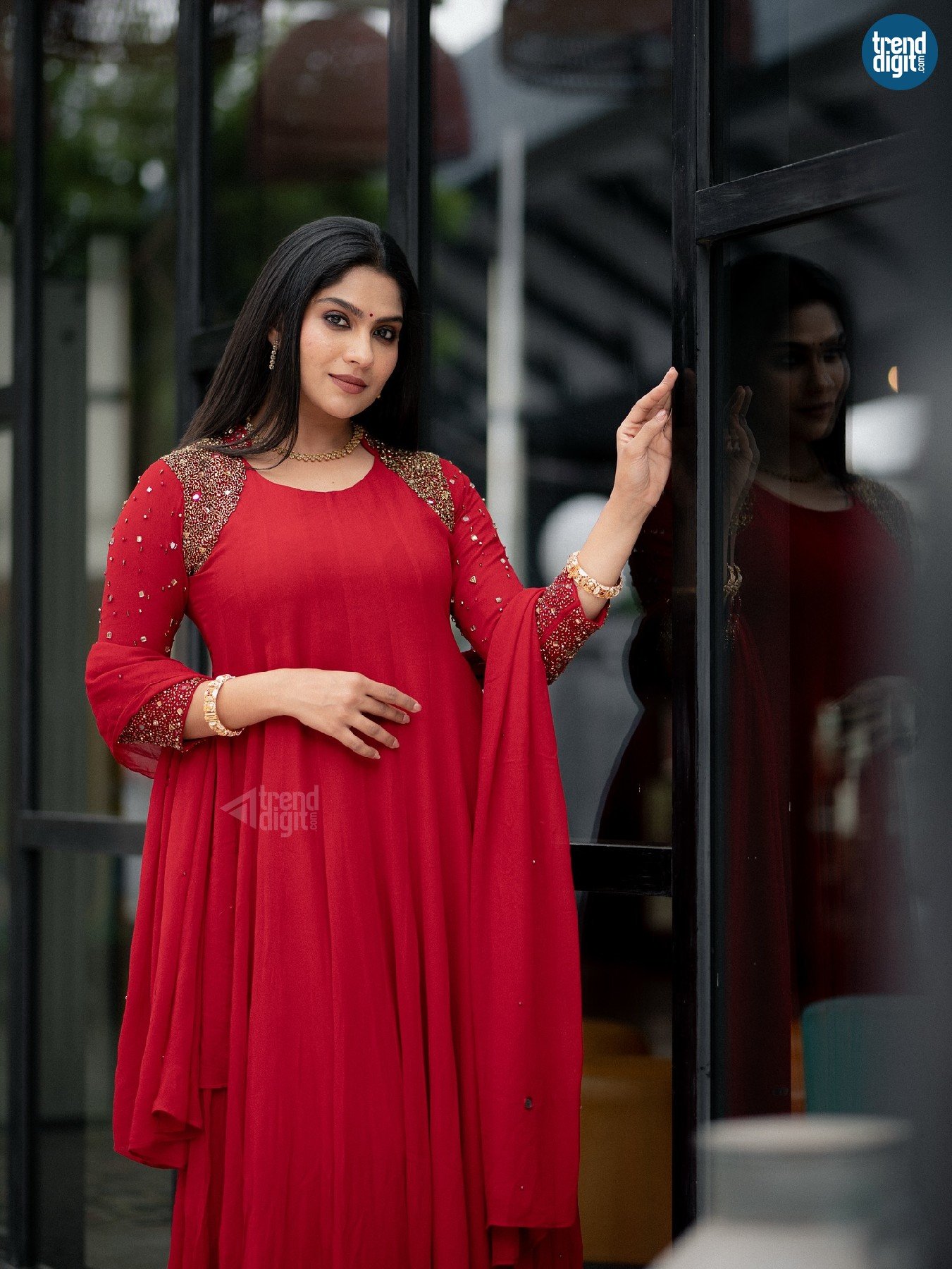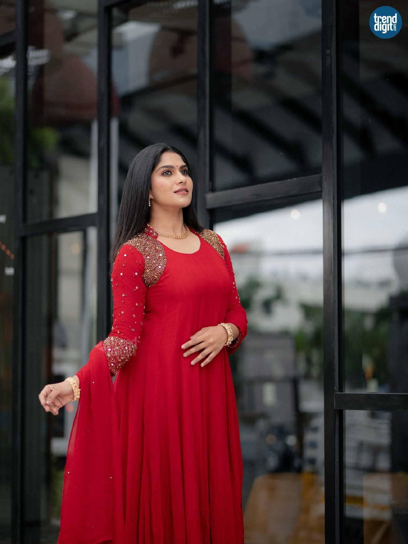 The red Anarkali dress features a flowing silhouette with gold embellishments along the sleeves and shoulders. The fabric moves naturally, creating soft volume. Gold jewellery, including bangles and a necklace, adds a traditional accent while maintaining restraint.