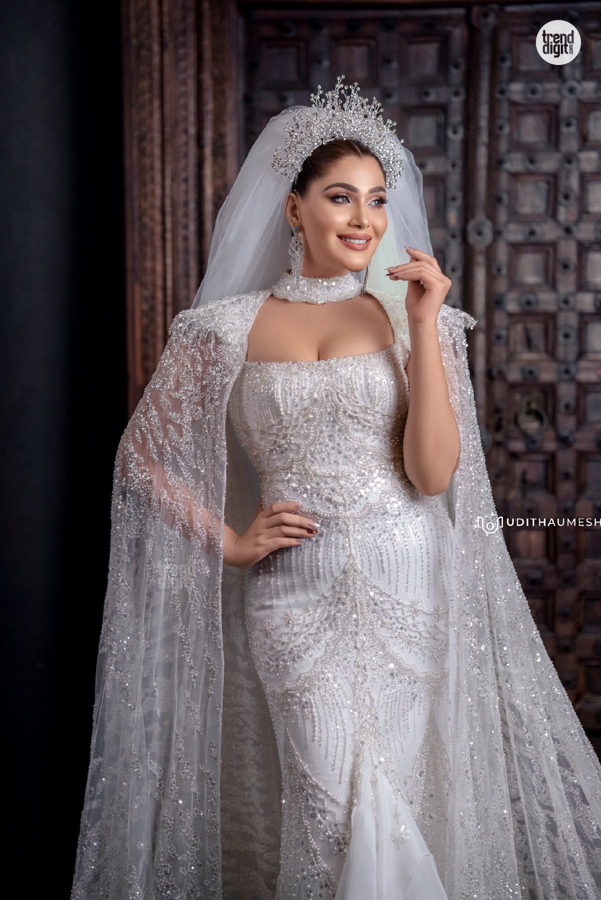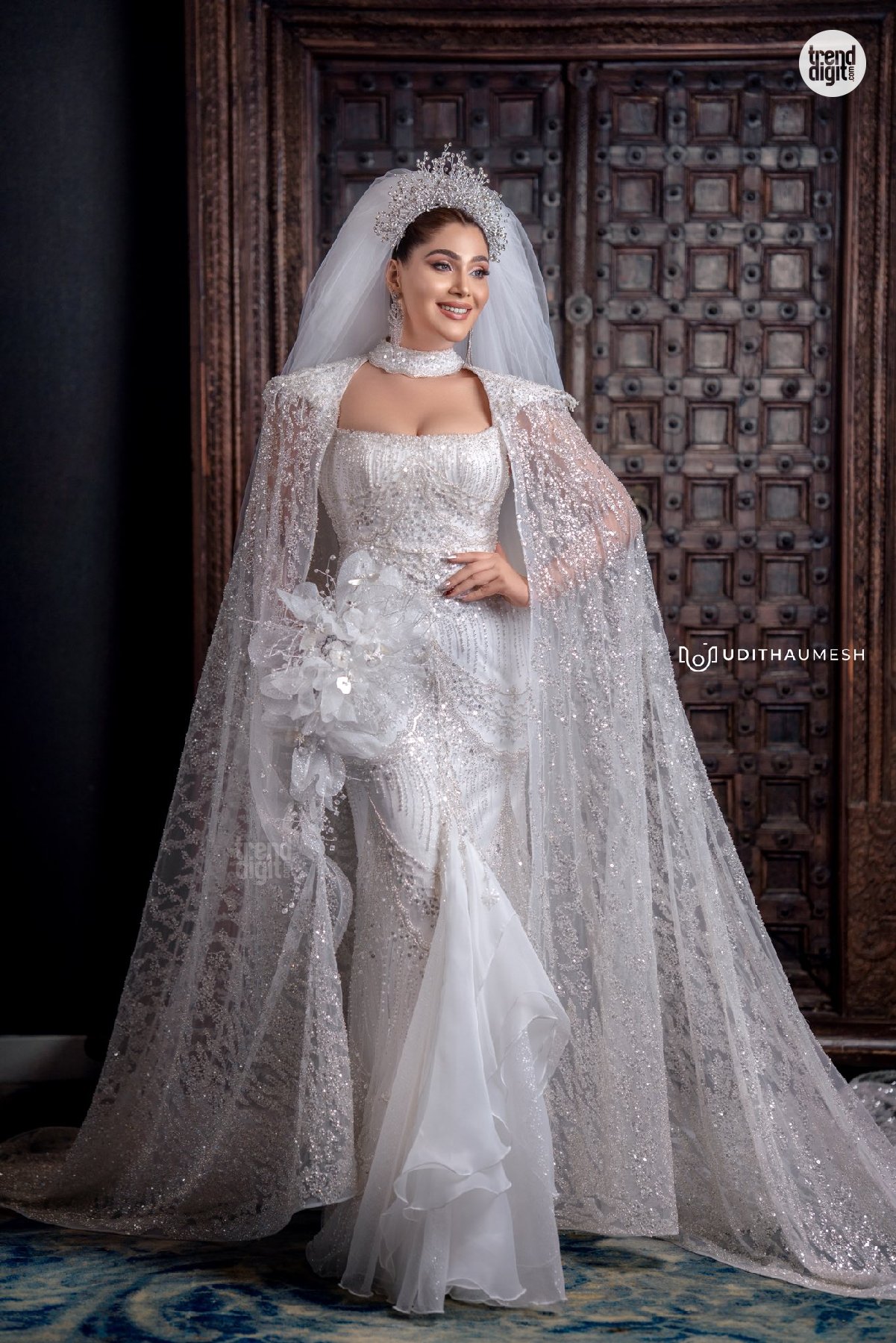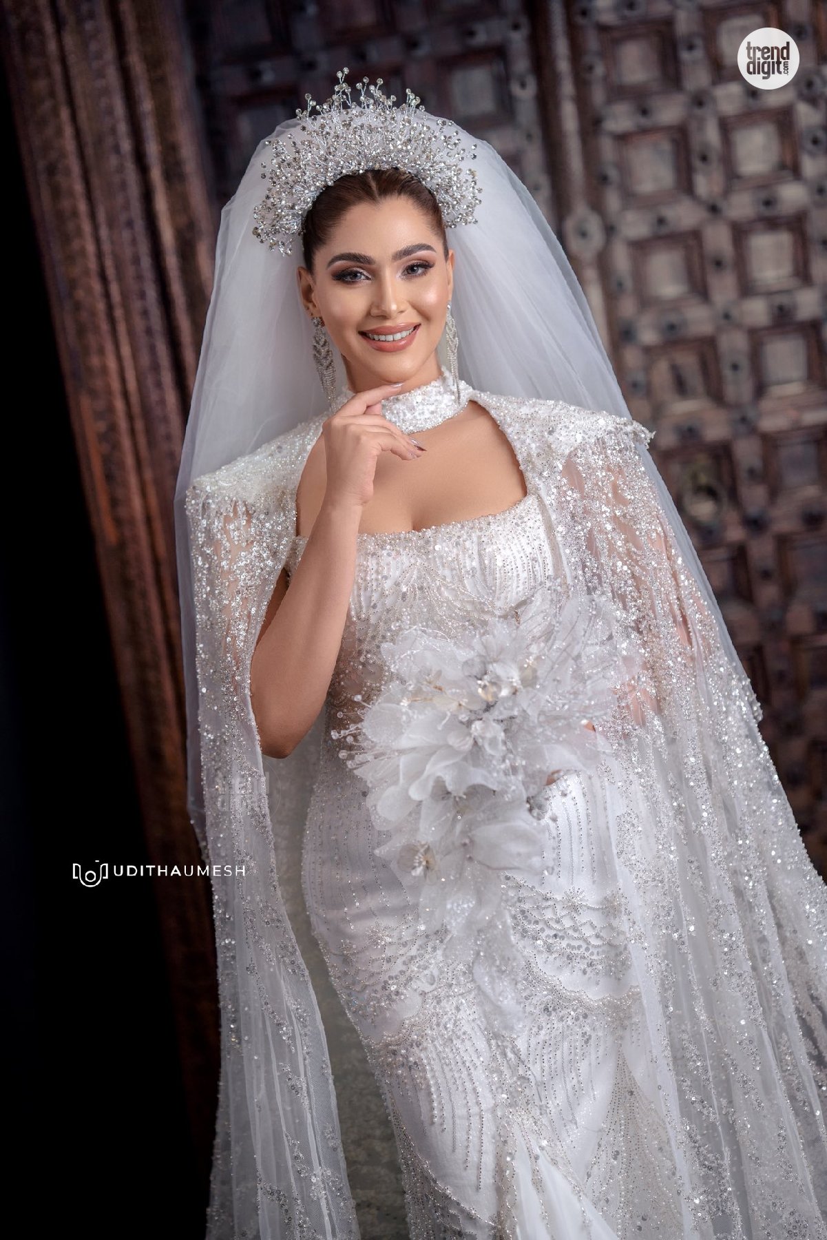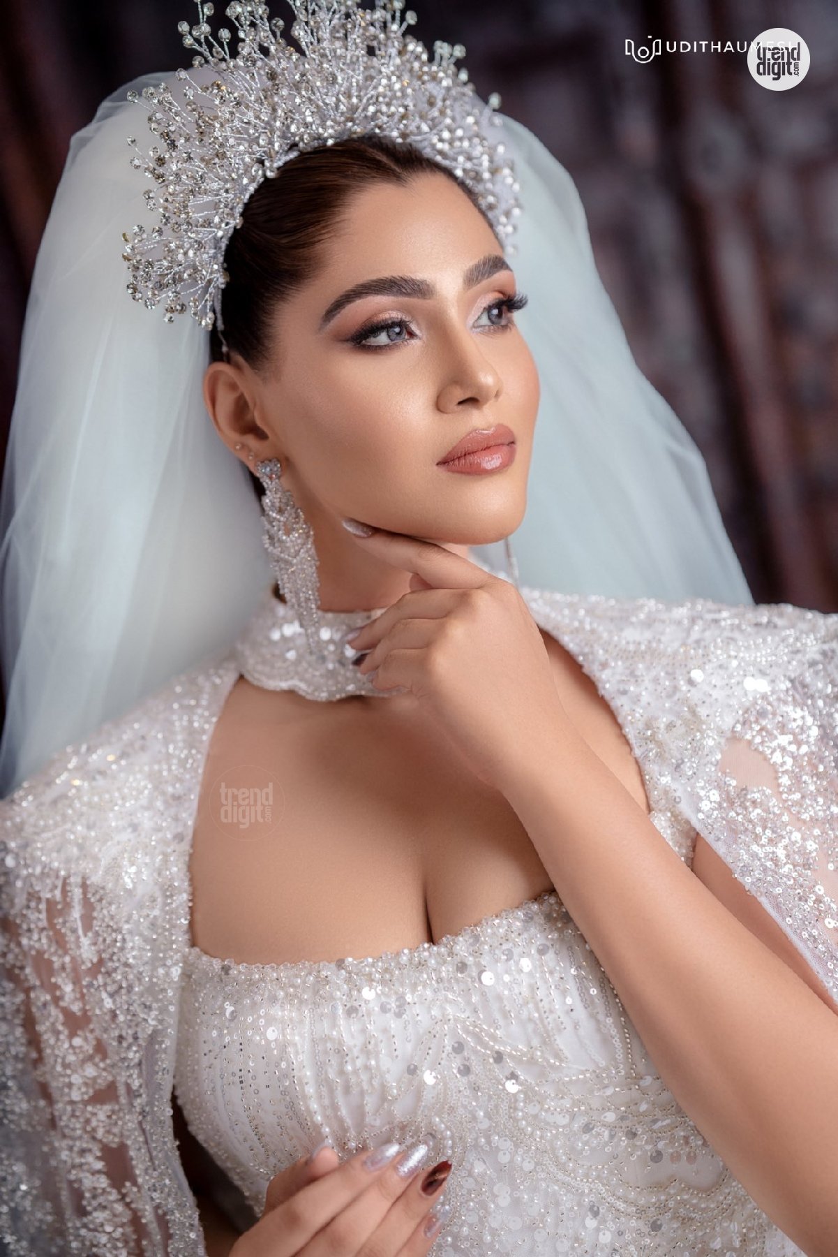 Taniya Abeysundara stuns in a white bridal gown featuring intricate detailing, soft textures, and elegant styling, captured beautifully in a refined studio photoshoot.