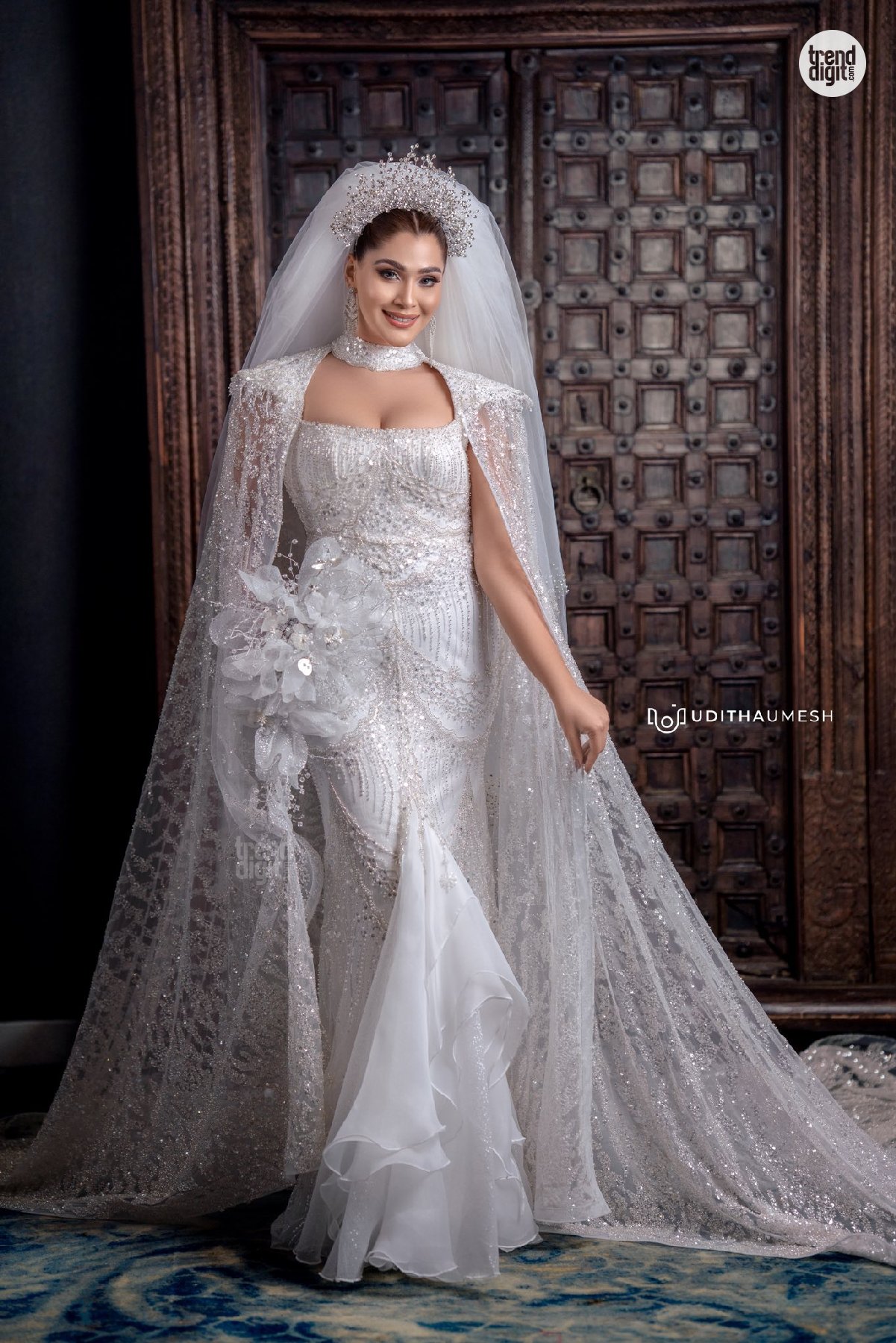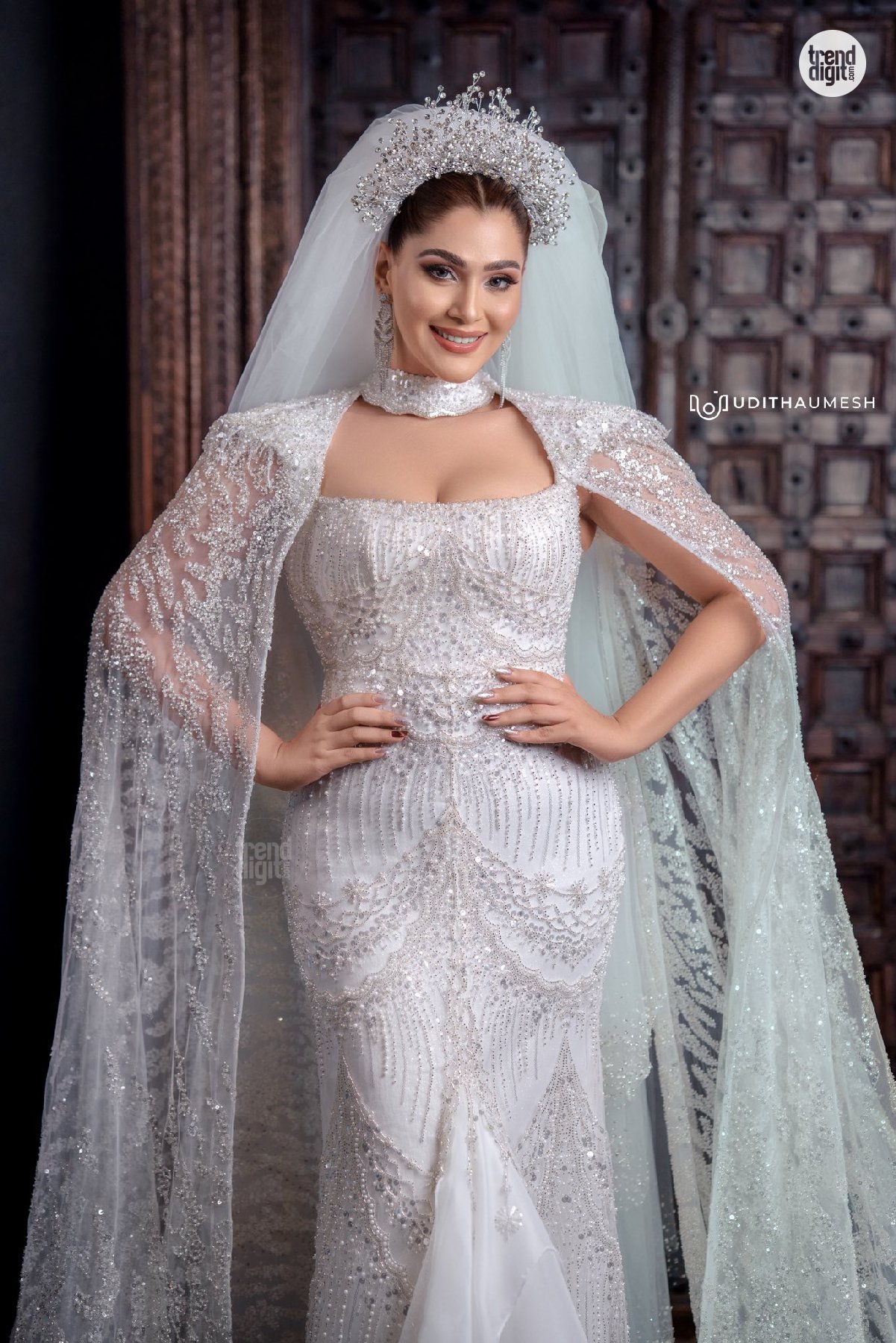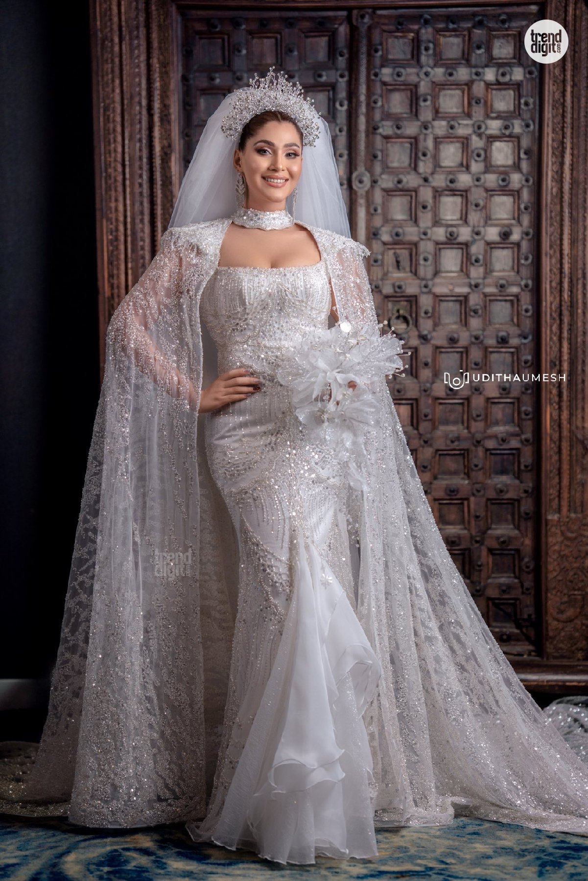 The Taniya Abeysundara White Bridal Gown features a heavily embellished fabric with a subtle shimmer finish and detailed beadwork. The silhouette is form-fitting with a structured bodice and layered hemline, complemented by a sheer embroidered cape. Jewellery includes a statement headpiece and delicate drop earrings, maintaining a cohesive bridal aesthetic.