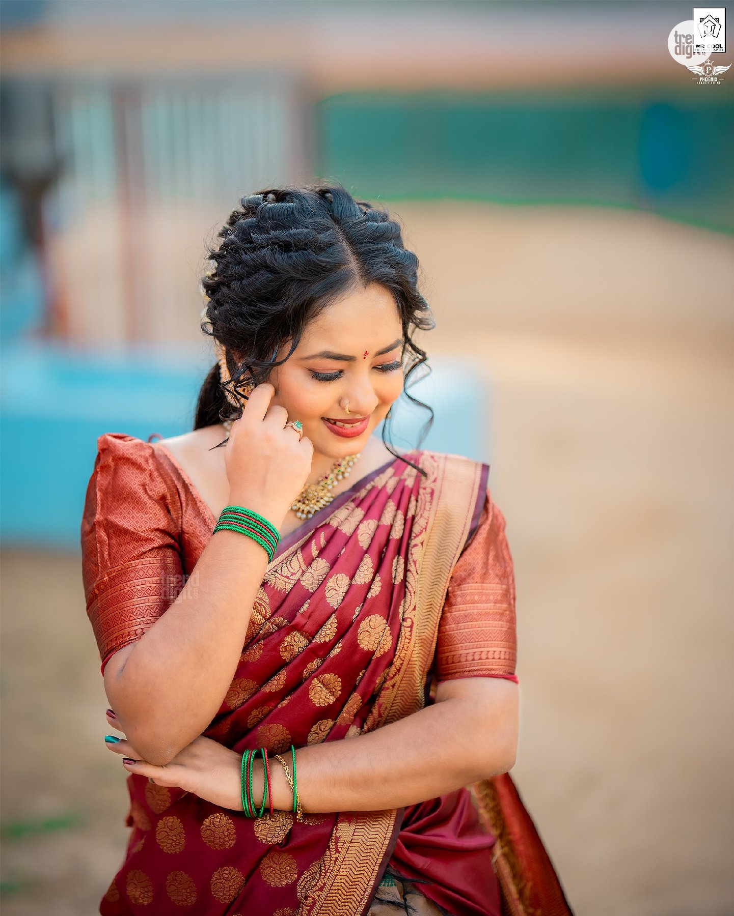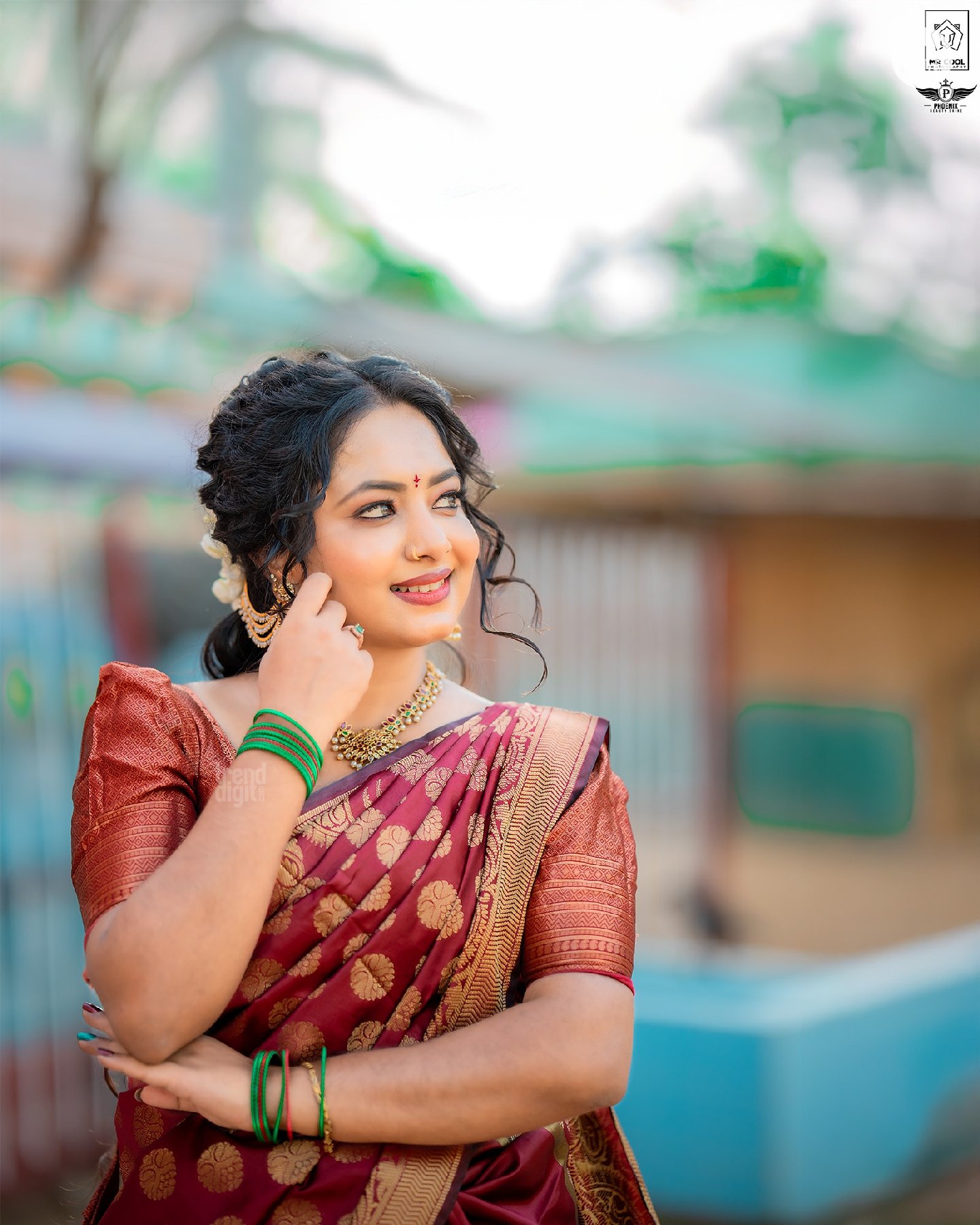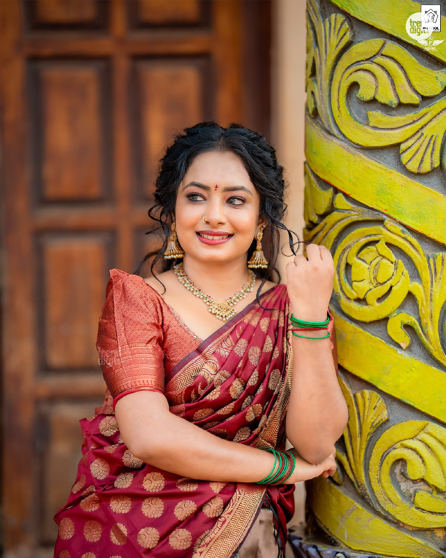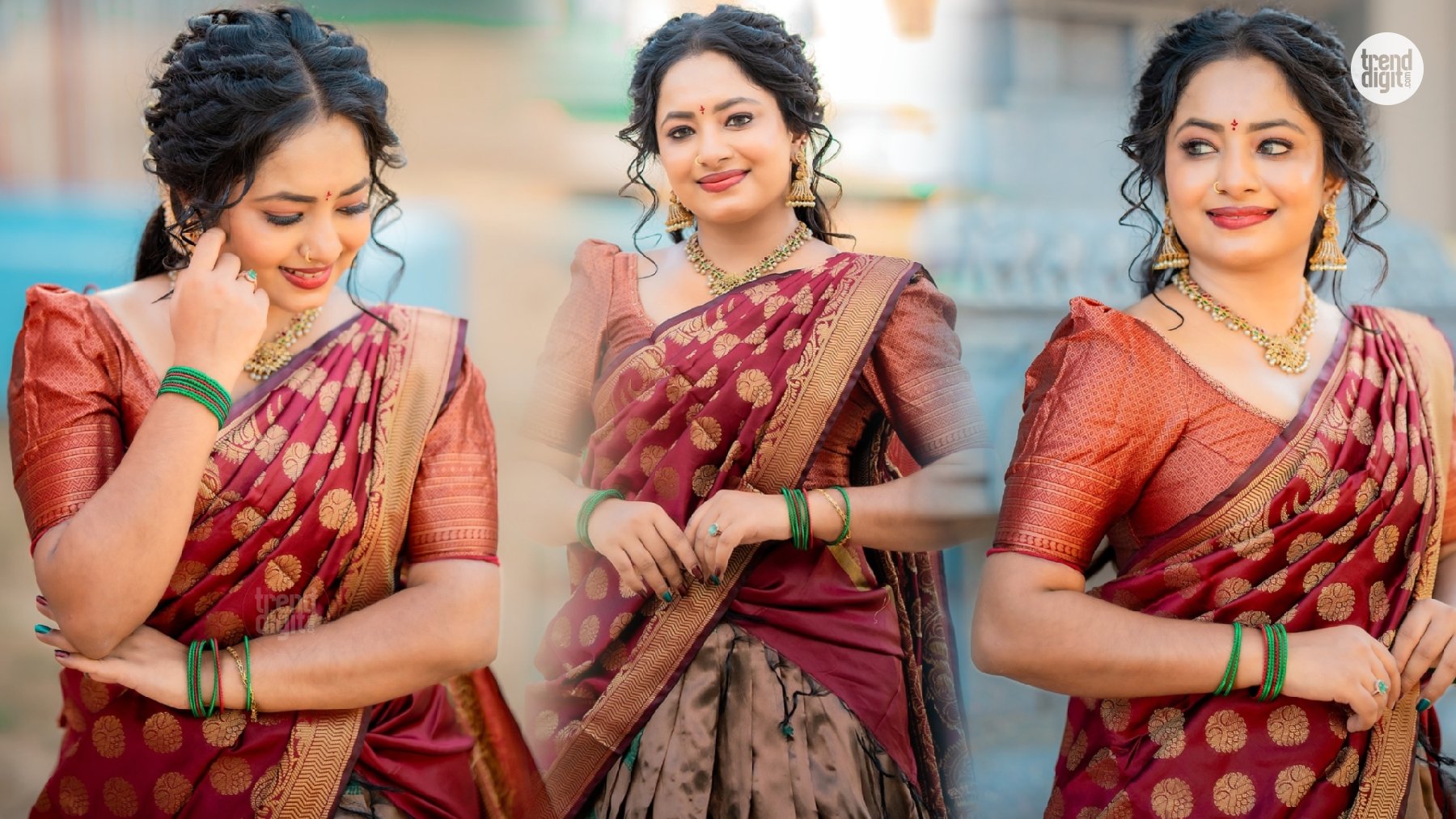 The saree features a rich maroon silk fabric with gold woven motifs, creating a subtle sheen under daylight. The blouse carries a structured fit with textured sleeves, while the drape maintains a traditional silhouette. Jewellery includes gold-toned jhumkas, a matching necklace, and green bangles that add contrast without overpowering the look.