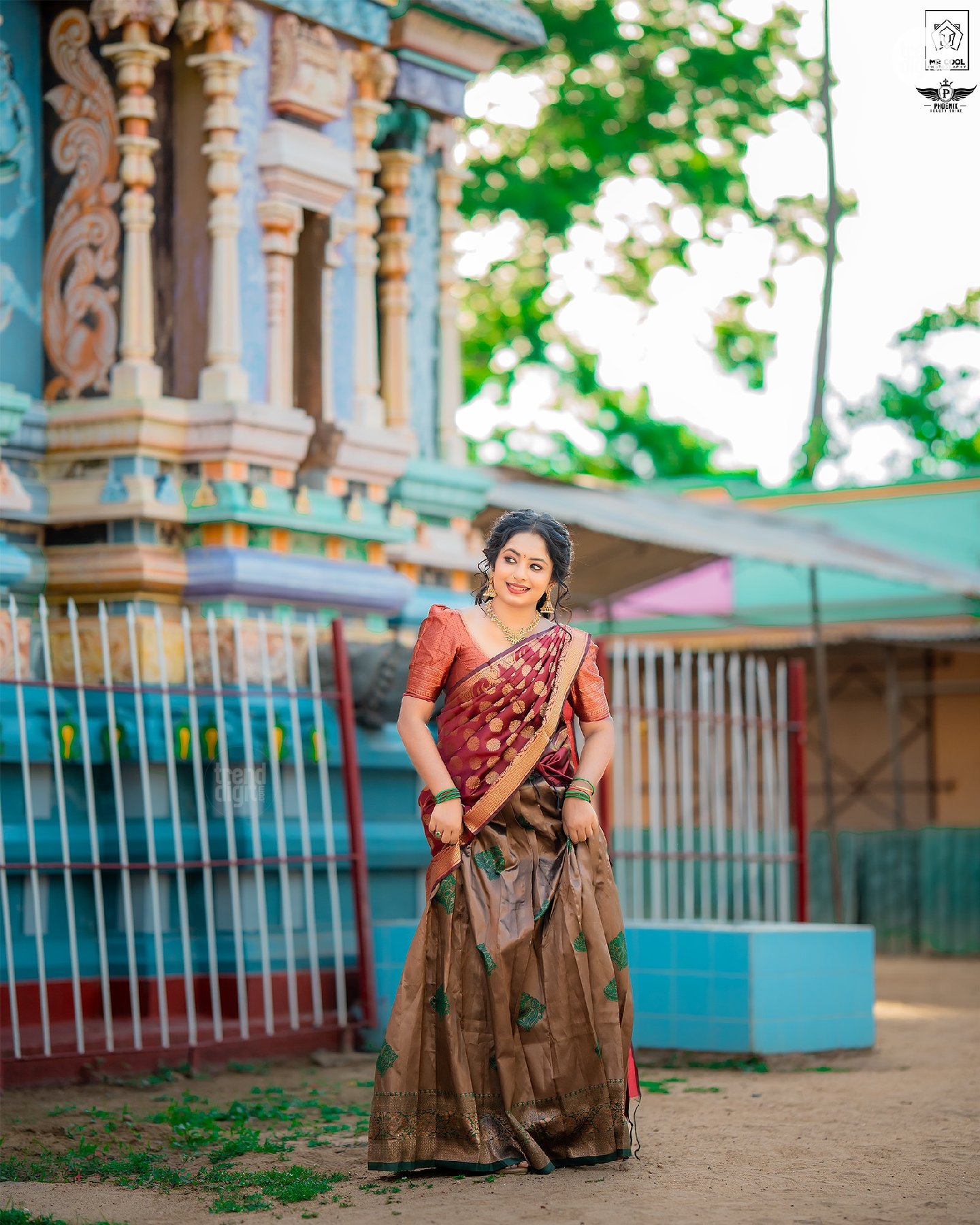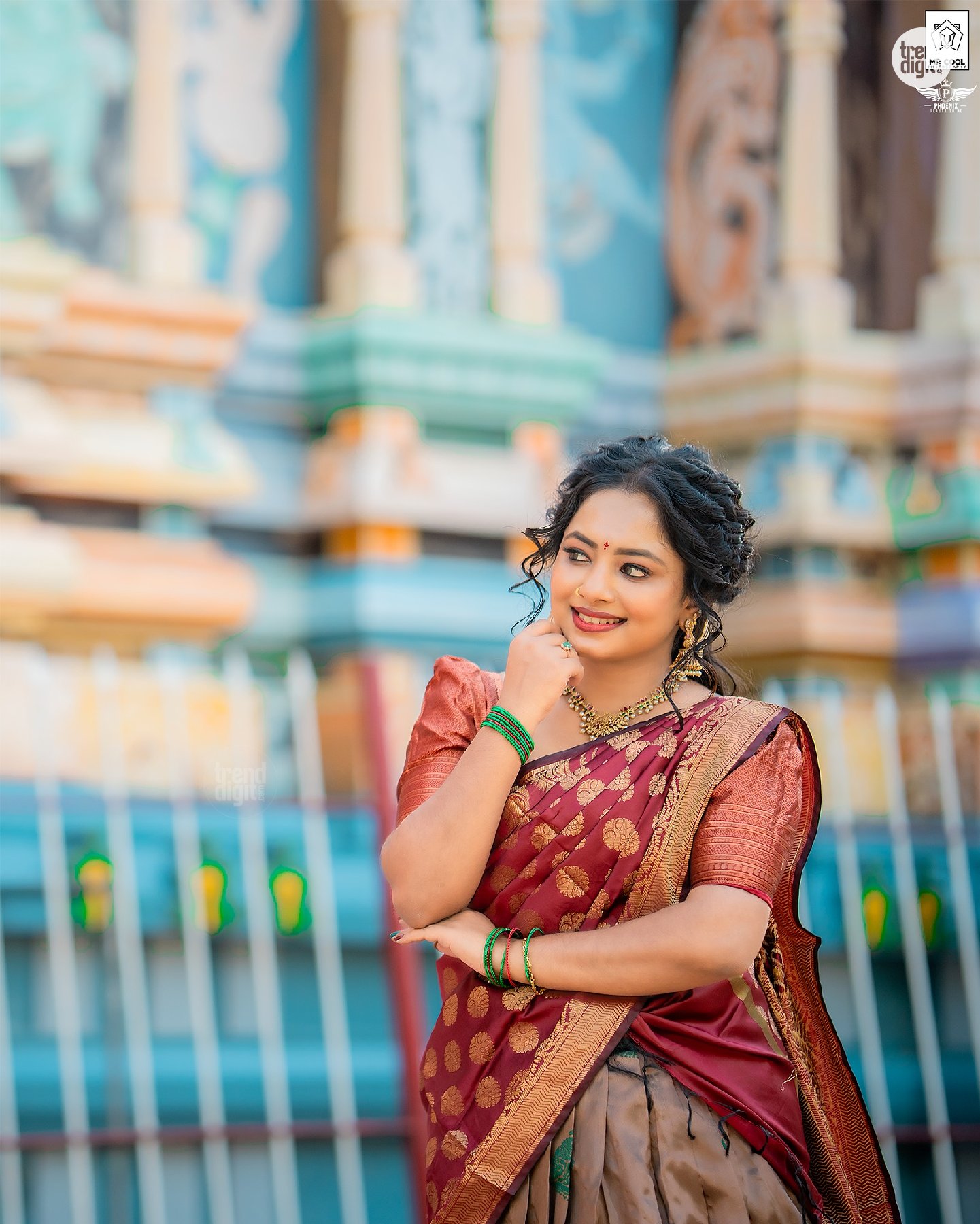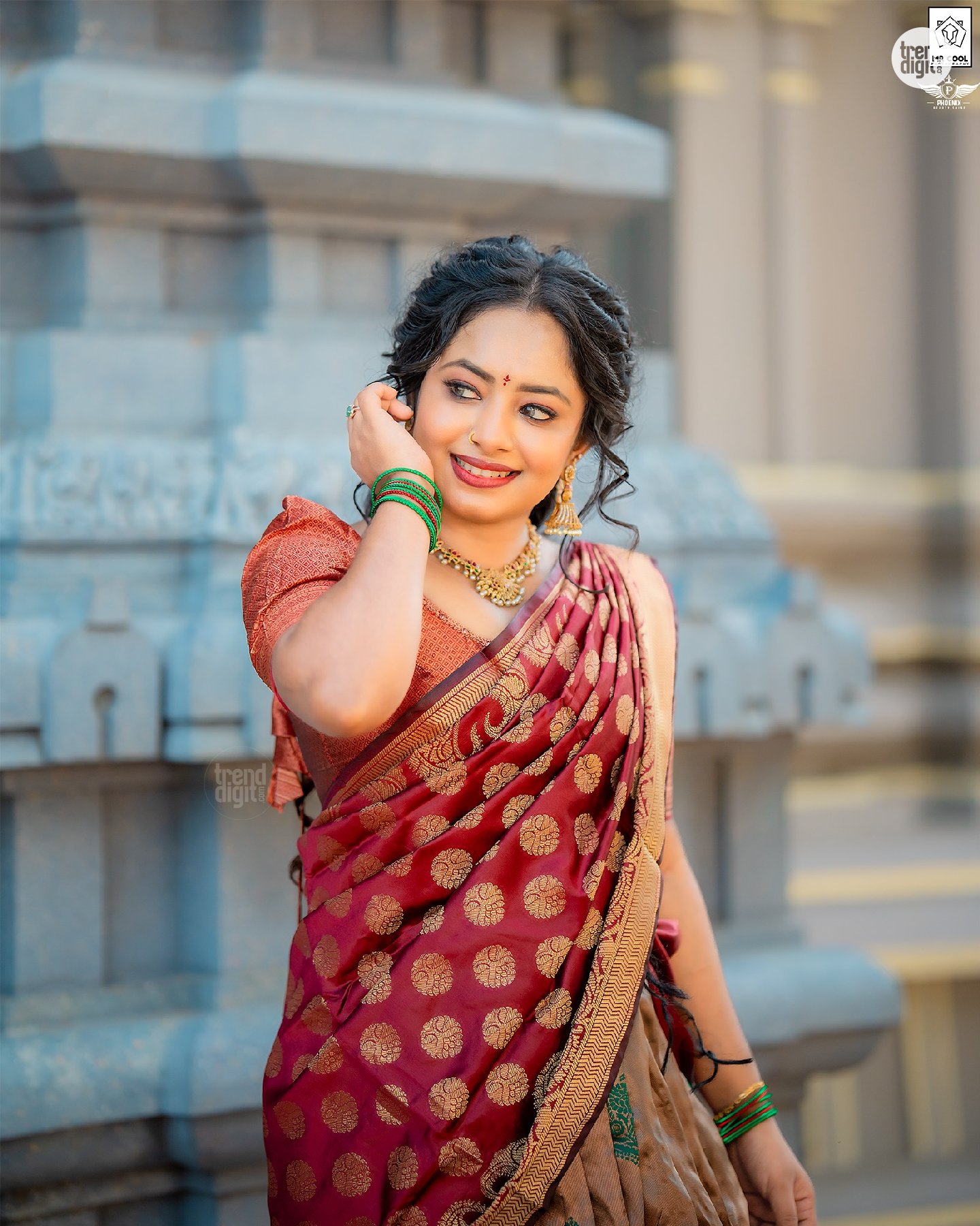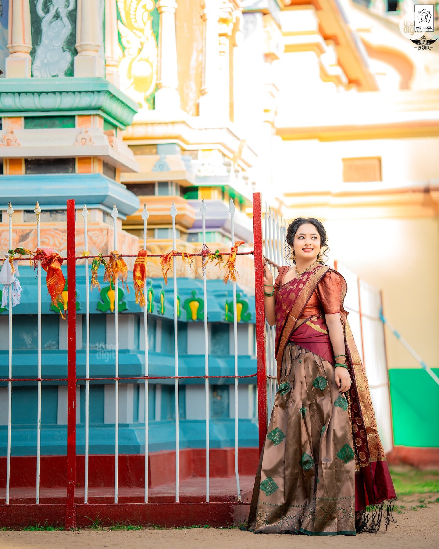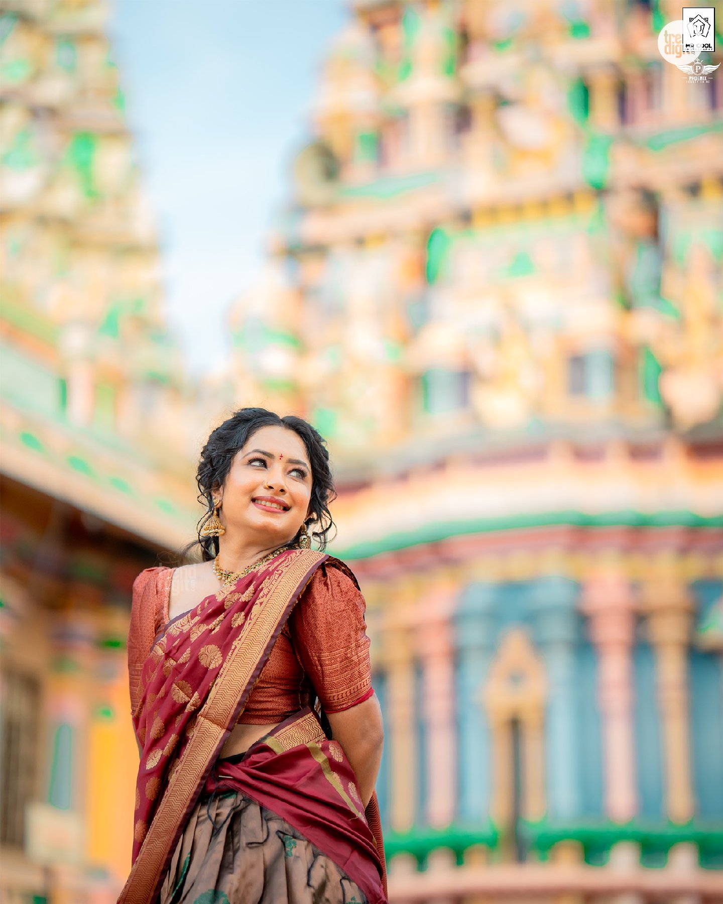 The photography focuses on balanced framing with a shallow depth of field, keeping the subject sharp against softly blurred temple structures. Makeup by @phoenixbeautyshine features a warm, natural finish with defined eyes and soft lip color. The overall visual execution remains clean, with attention to detail and consistent color tones.