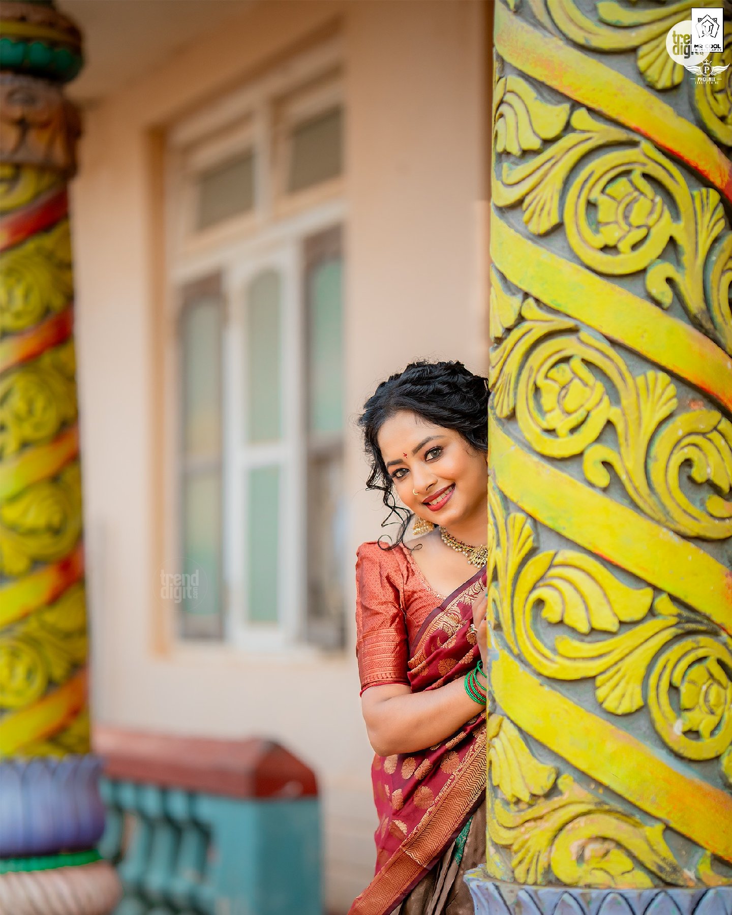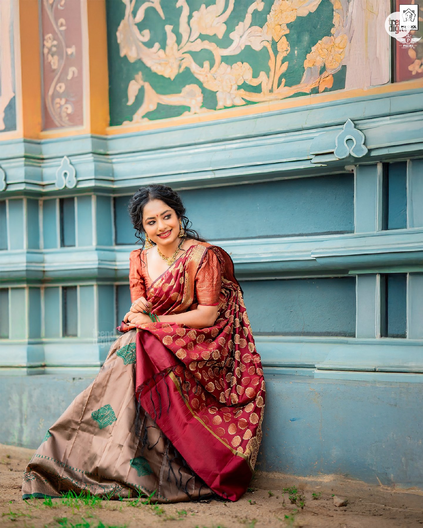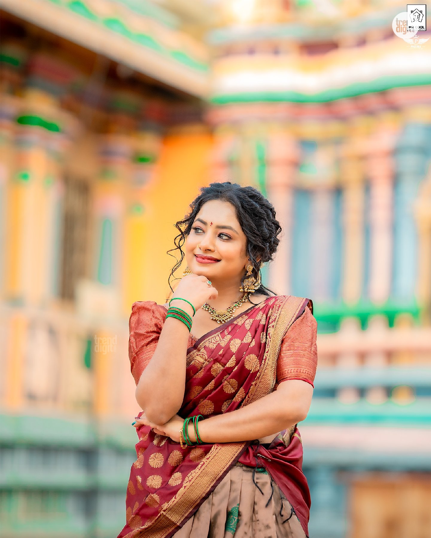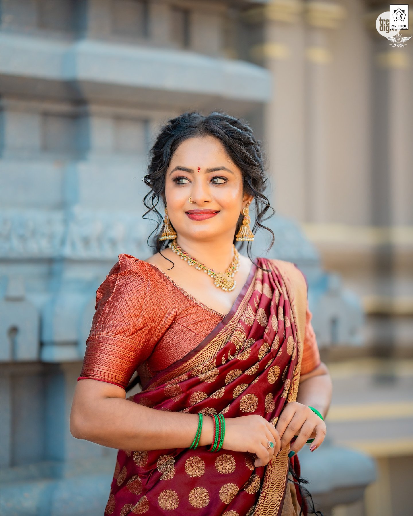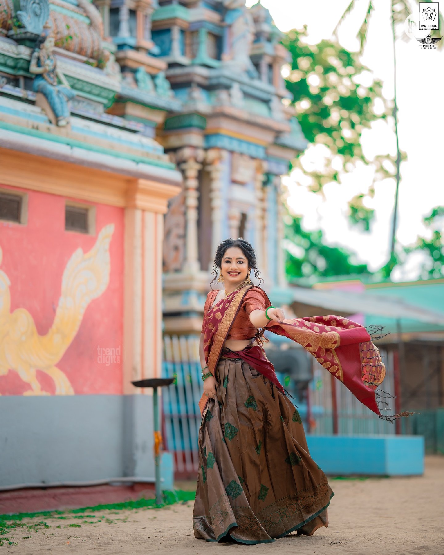 The photography focuses on balanced framing with a shallow depth of field, keeping the subject sharp against softly blurred temple structures. Makeup by @phoenixbeautyshine features a warm, natural finish with defined eyes and soft lip color. The overall visual execution remains clean, with attention to detail and consistent color tones.
