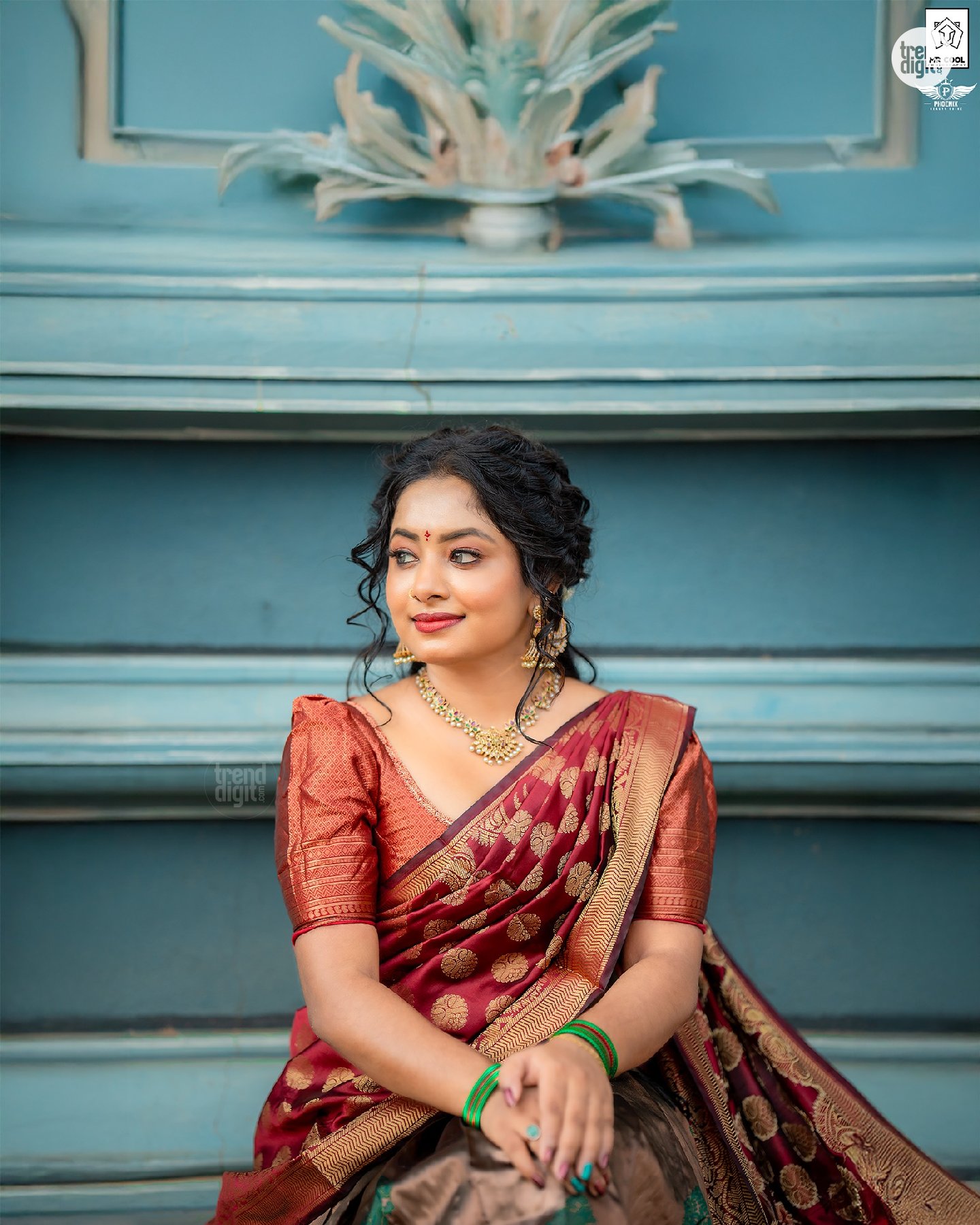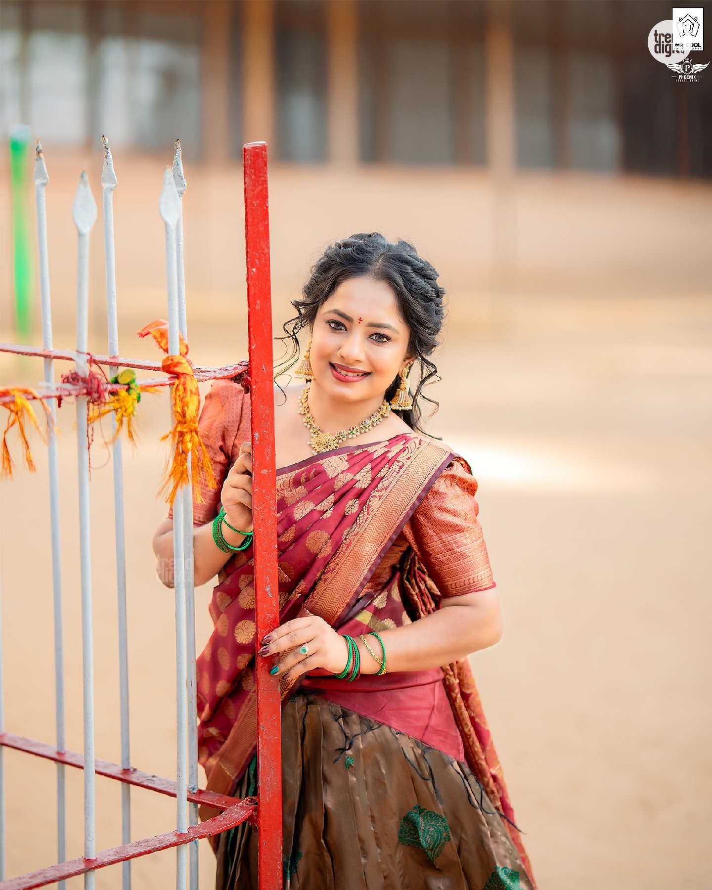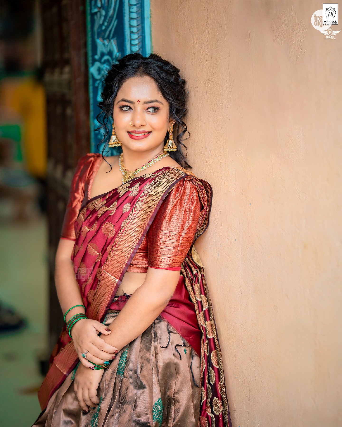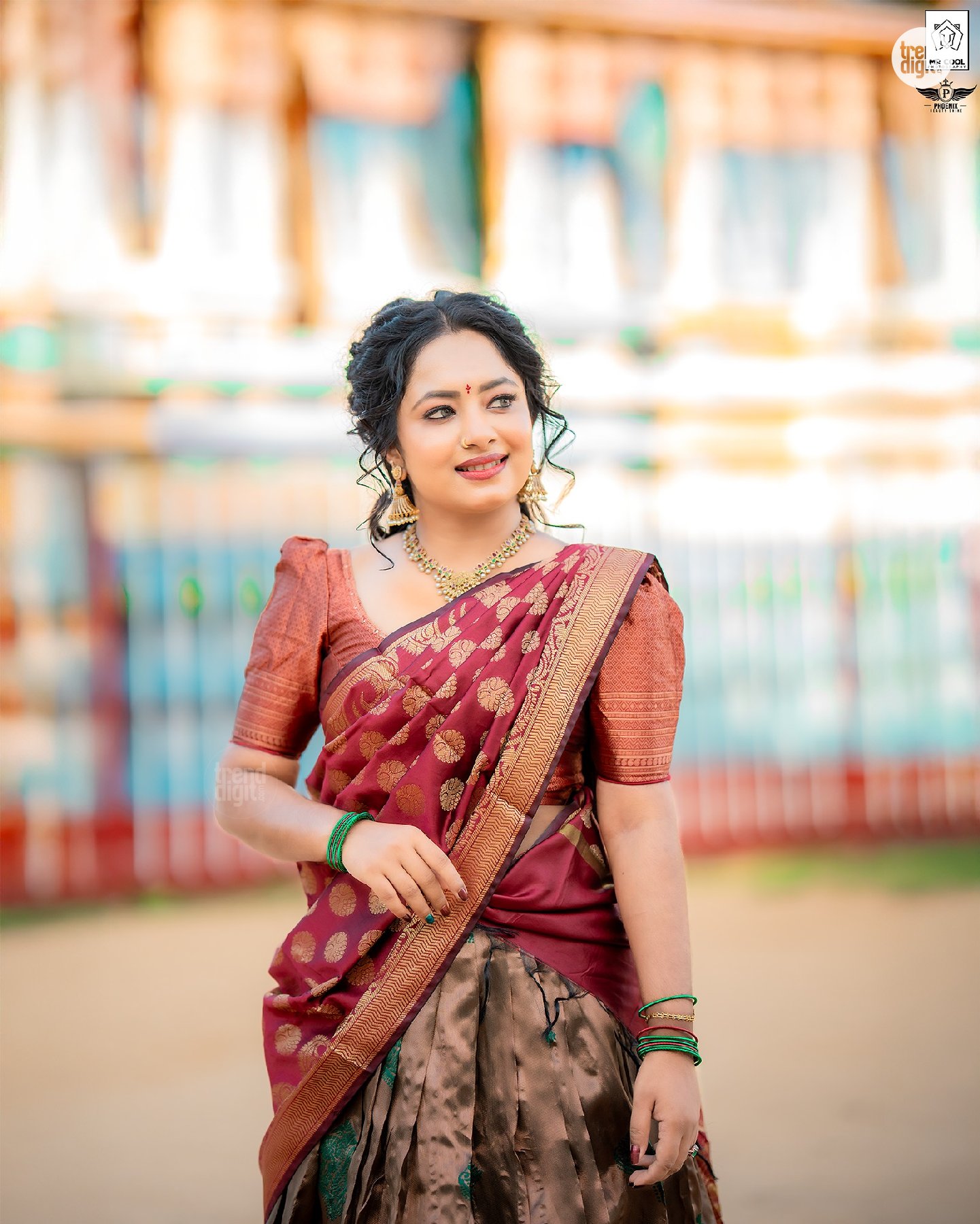 Thakshika Thayalan is a Sri Lanka-based content creator, nurse, and YouTuber known for lifestyle visuals. This Thakshika Thayalan Maroon Saree Traditional Look photoshoot is captured outdoors in a temple setting, using natural daylight and soft architectural backdrops. The composition highlights calm expressions and cultural styling.