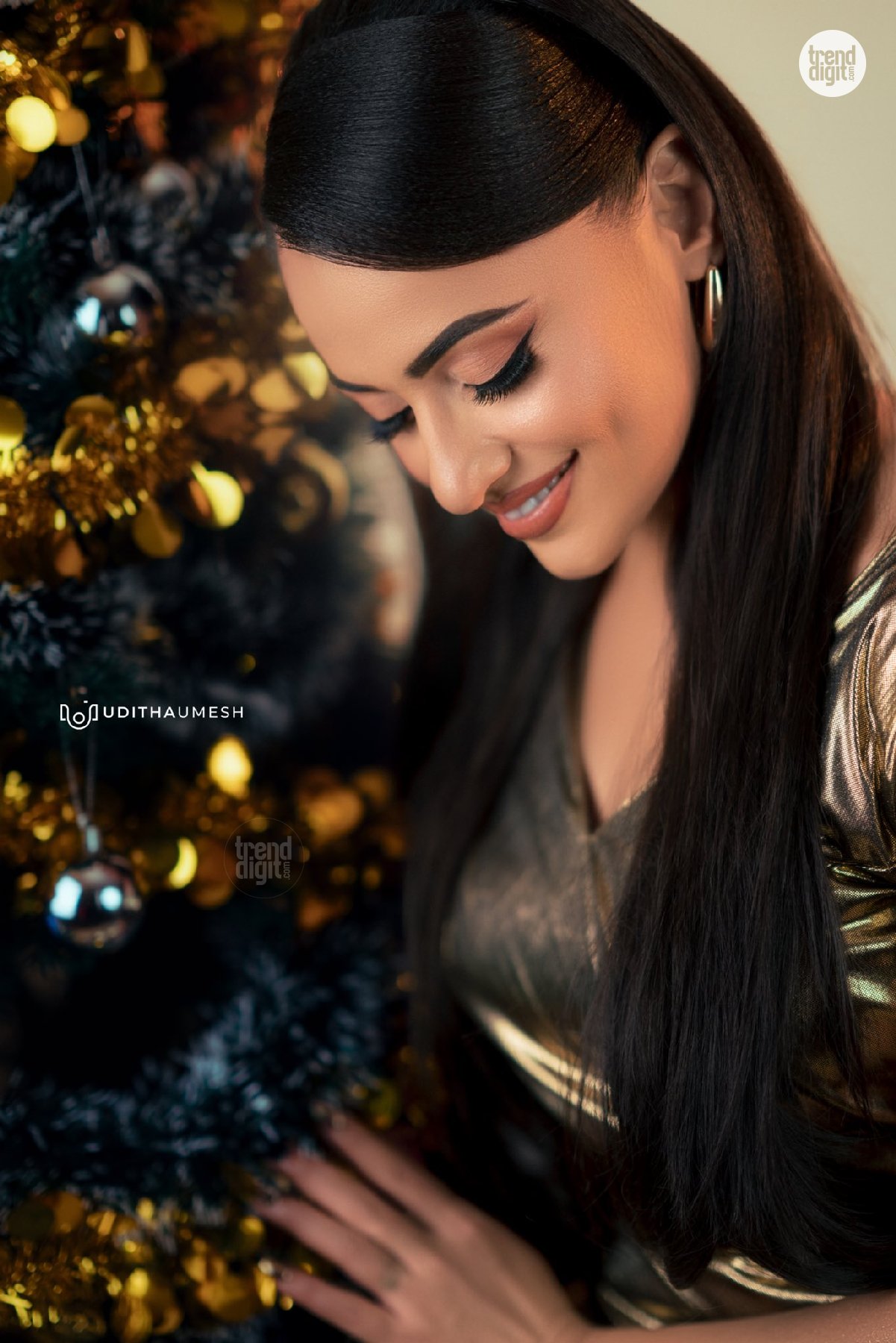 Udari Warnakulasooriya is a Sri Lankan actress associated with film and television. This photoshoot featuring the Udari Warnakulasooriya Gold Evening Gown is captured in an indoor studio setting using soft festive lighting and a decorated Christmas backdrop. The composition highlights a seasonal theme with balanced visual focus.