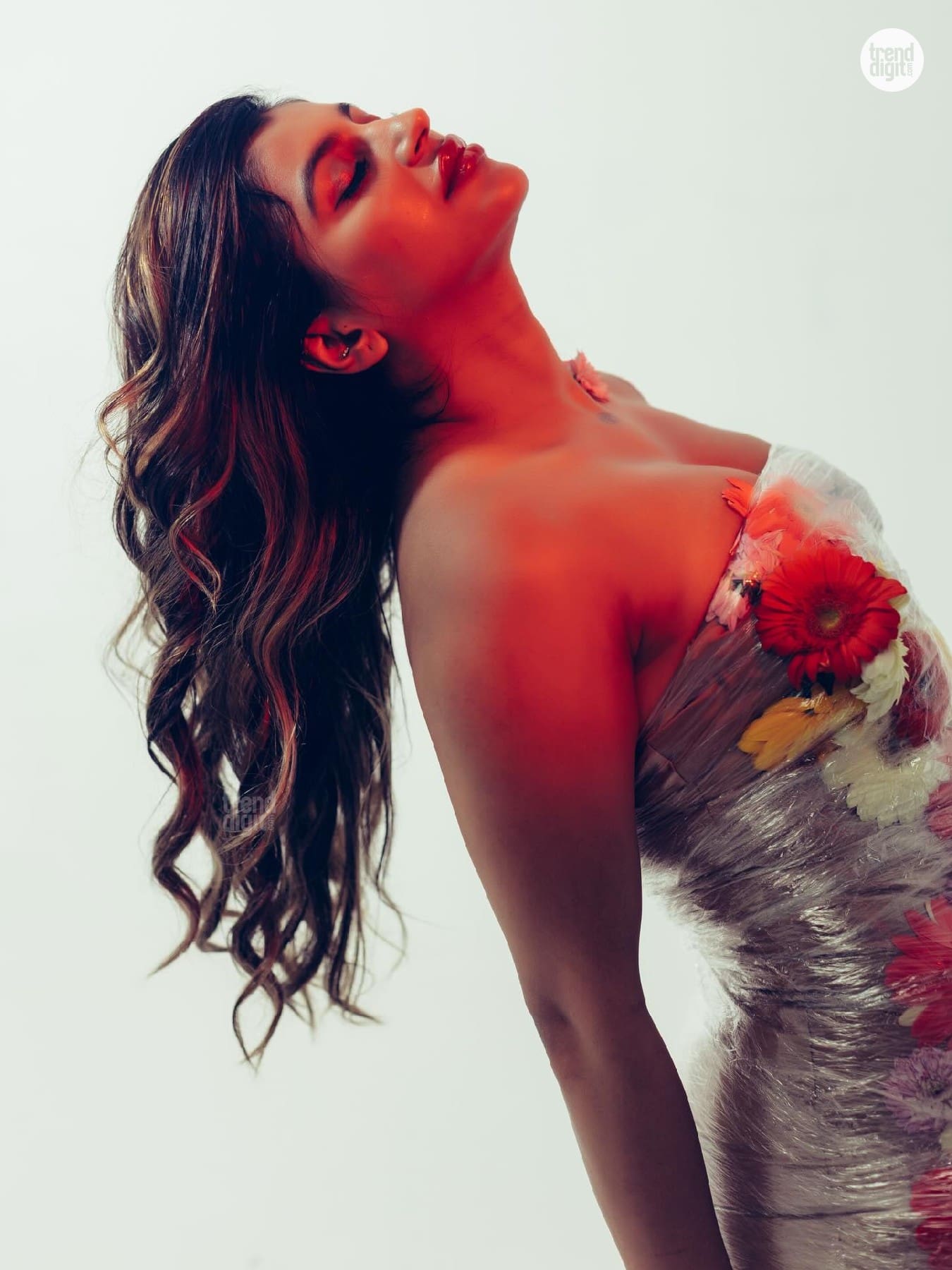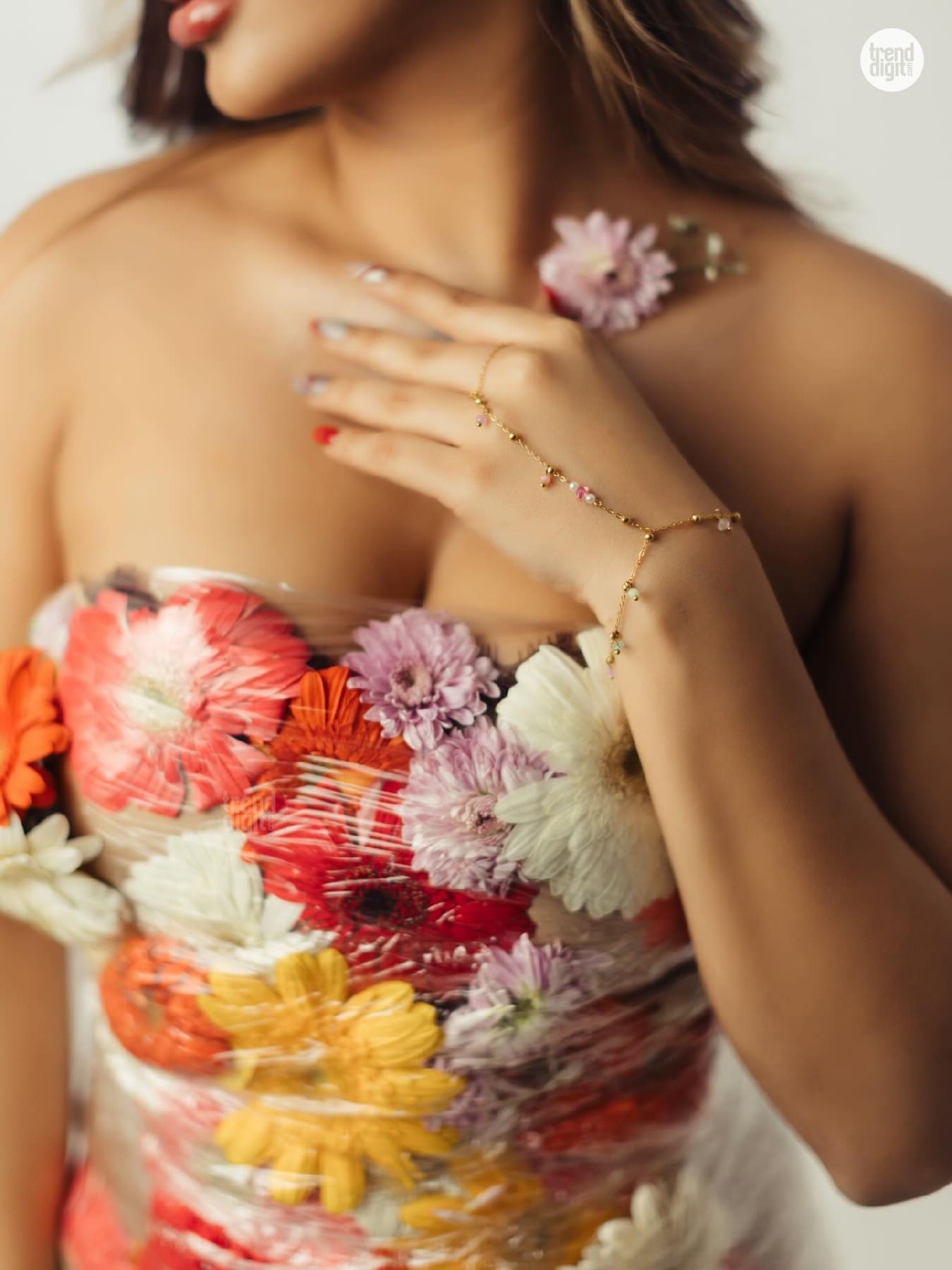 Yashika Aannand is an Indian actress and model associated with Tamil cinema. This concept photoshoot features her styled in a floral wrap arrangement created using fresh flowers layered over a transparent sheet, captured in a clean indoor studio with soft neutral lighting. The minimal backdrop keeps the focus entirely on texture and composition.