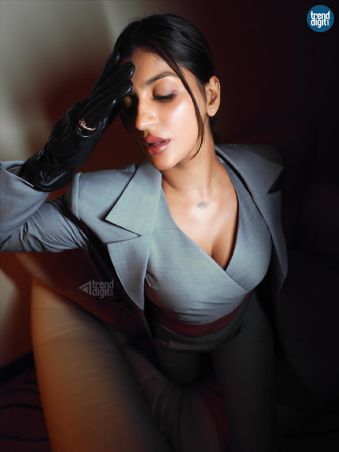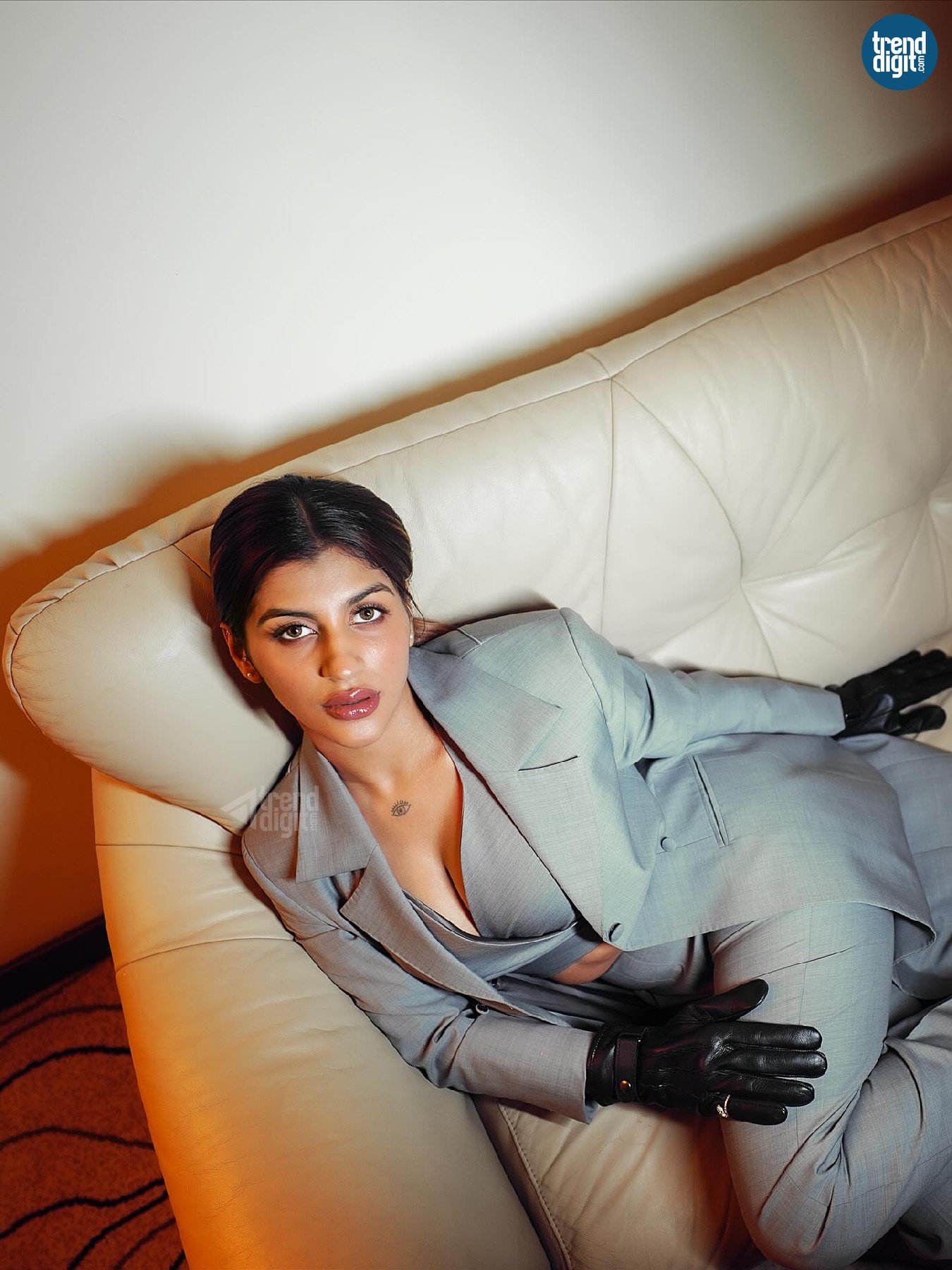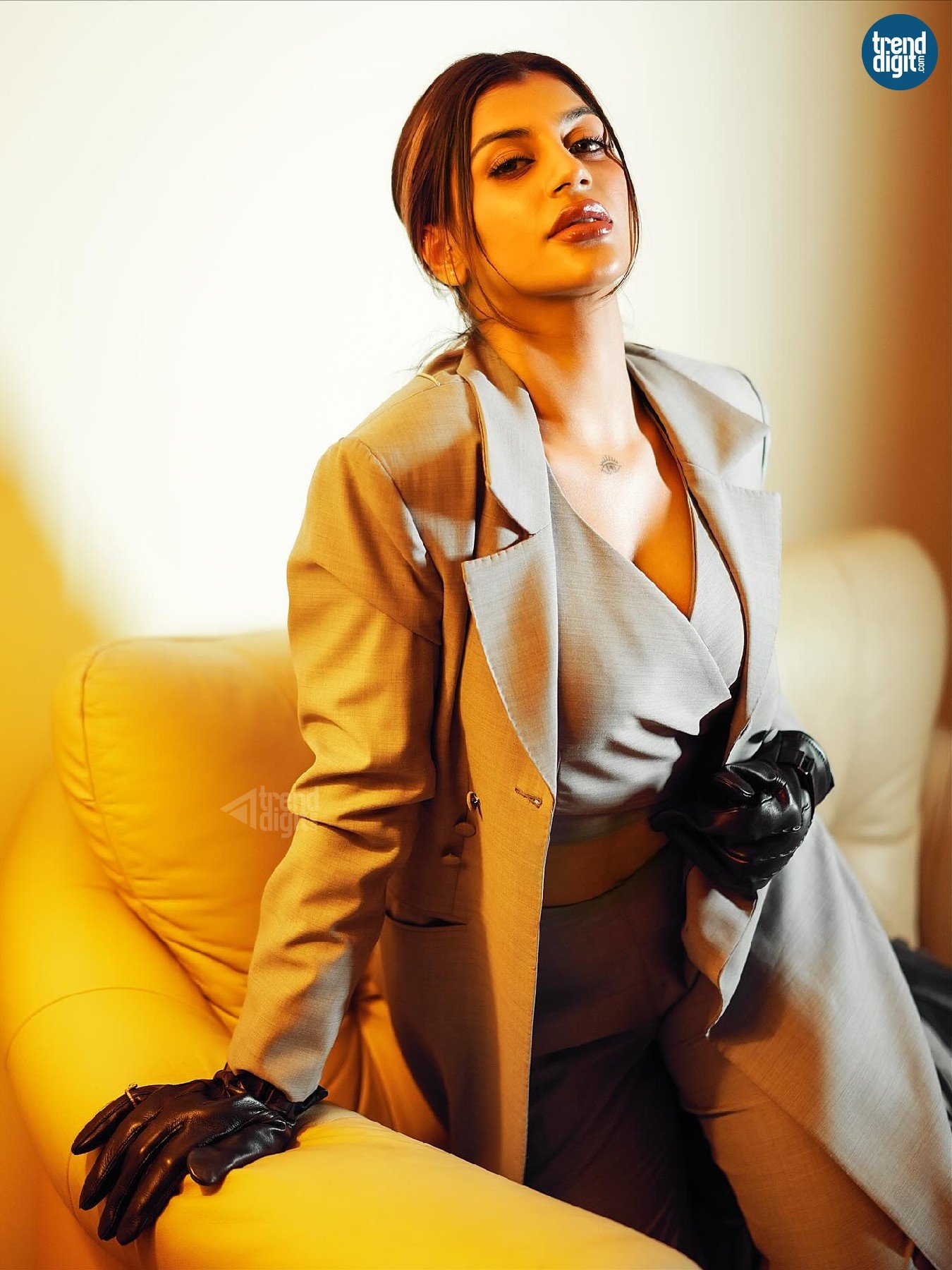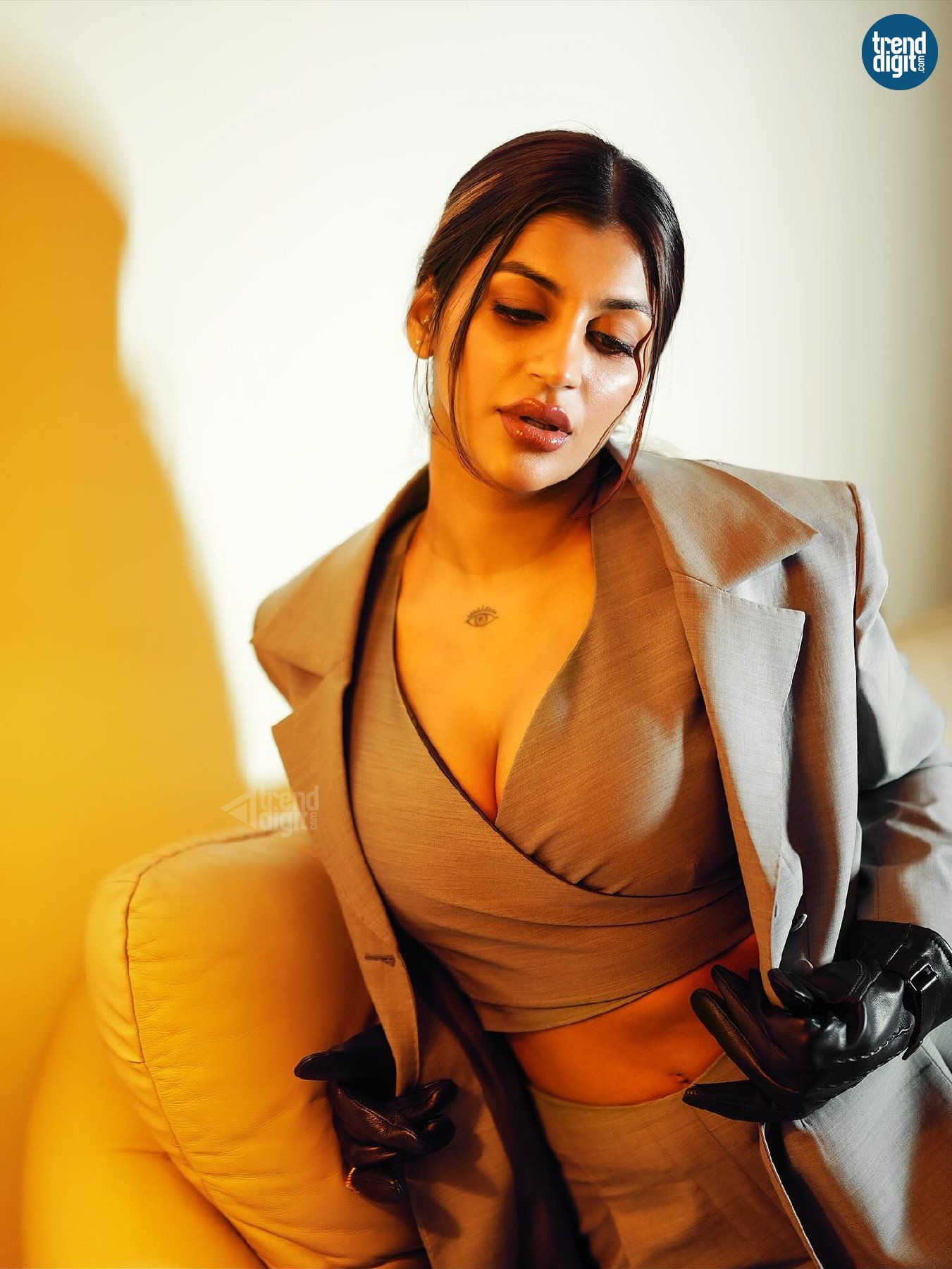 Yashika Aannand is seen wearing a grey co-ord suit in this indoor photoshoot, styled in a contemporary and structured manner. The outfit includes a cropped wrap-style top paired with high-waisted trousers and a matching long blazer, creating a balanced silhouette that blends sharp tailoring with modern fashion sensibilities.