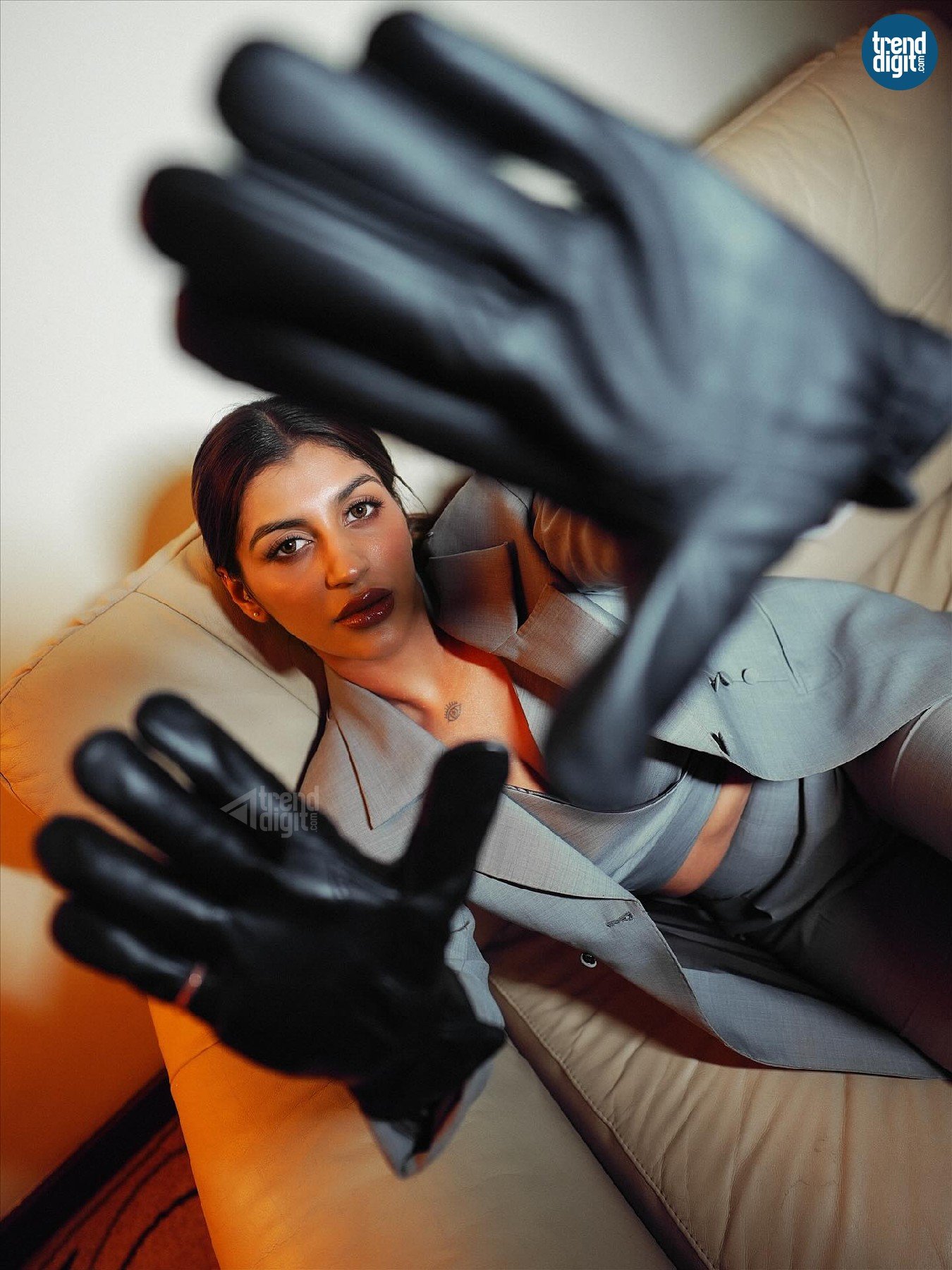 The shoot is set indoors with controlled lighting, highlighting fabric texture and the outfit’s construction. Yashika’s hair is tied back neatly, keeping focus on the outfit’s neckline and proportions. Makeup is kept minimal with defined eyes and a natural lip tone, reinforcing the editorial nature of the look.