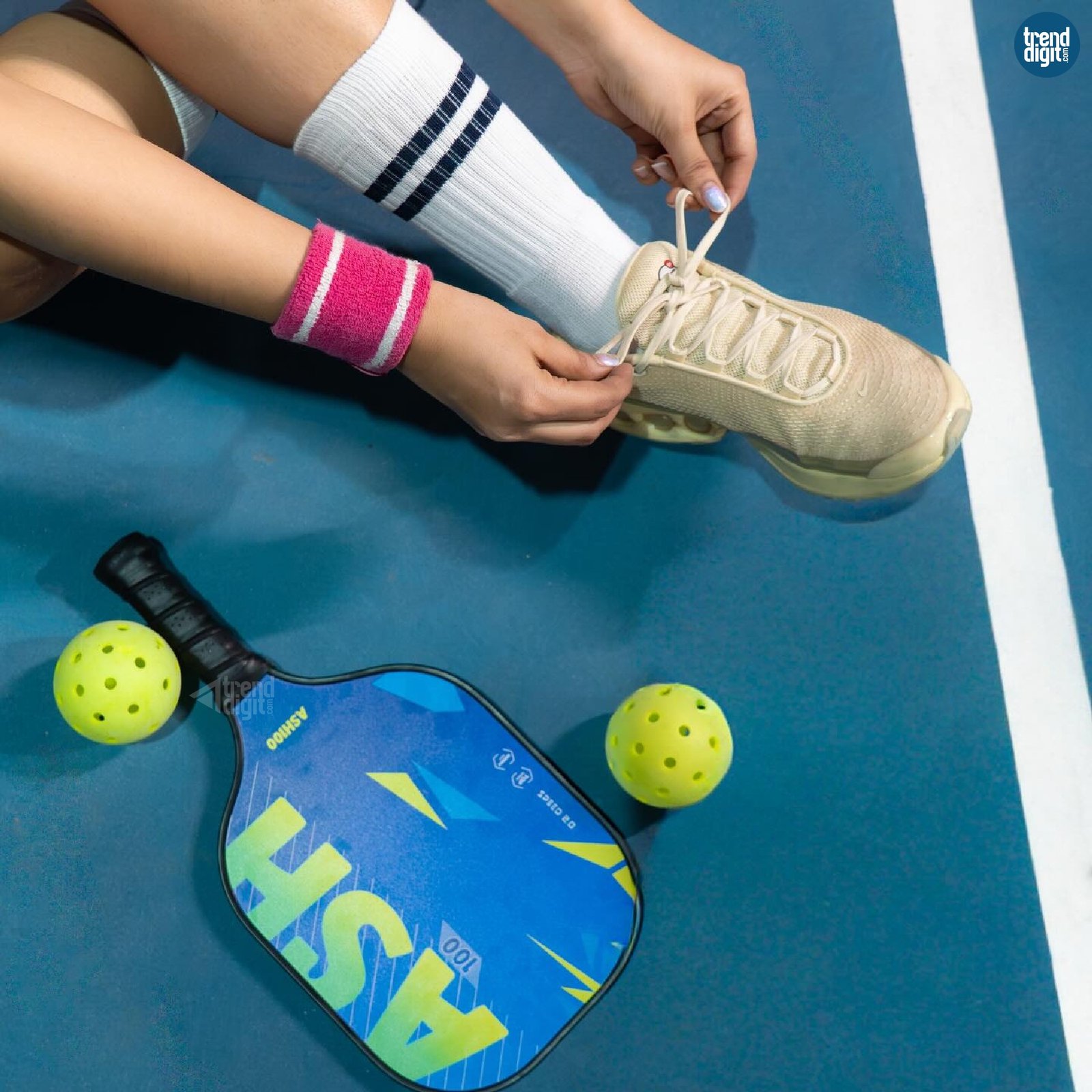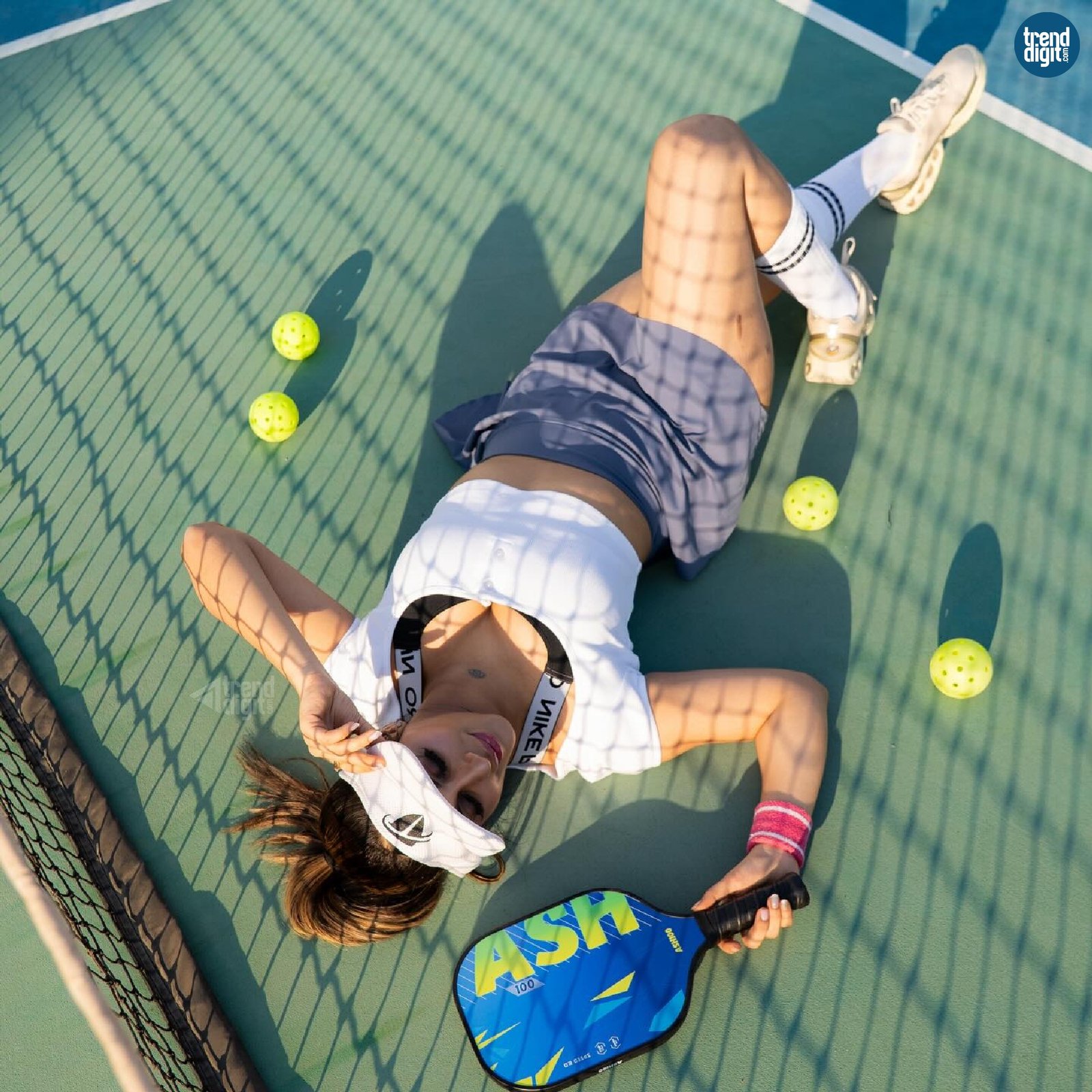 The colour palette remains clean and minimal, allowing the athletic elements to stand out. A paddle and ball are incorporated into the frame, reinforcing the sports-inspired theme without appearing staged. The outfit balances performance wear with fashion-focused styling.