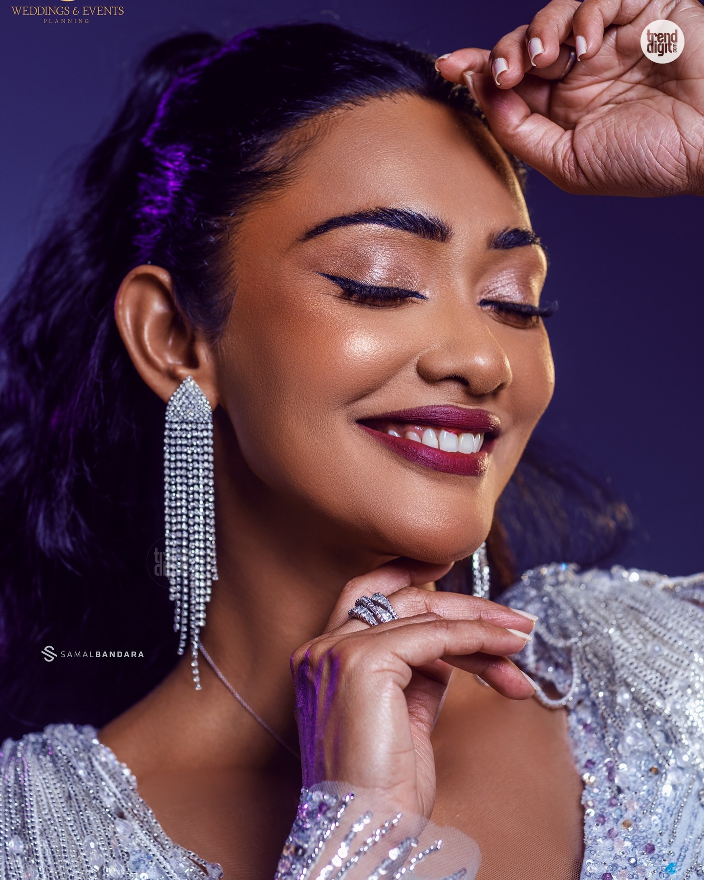 Makeup for the photoshoot is done by Lanka Fernando, featuring defined eyes, glowing skin, and bold berry-toned lips that complement the glamorous concept of the shoot.