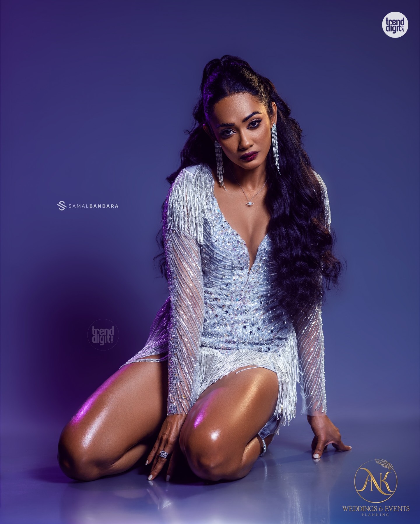 Sri Lankan actress and model Yureni Gunasekara appears in a glamorous silver mini dress photoshoot captured by photographer Samal Bandara, featuring bold studio lighting and elegant styling.