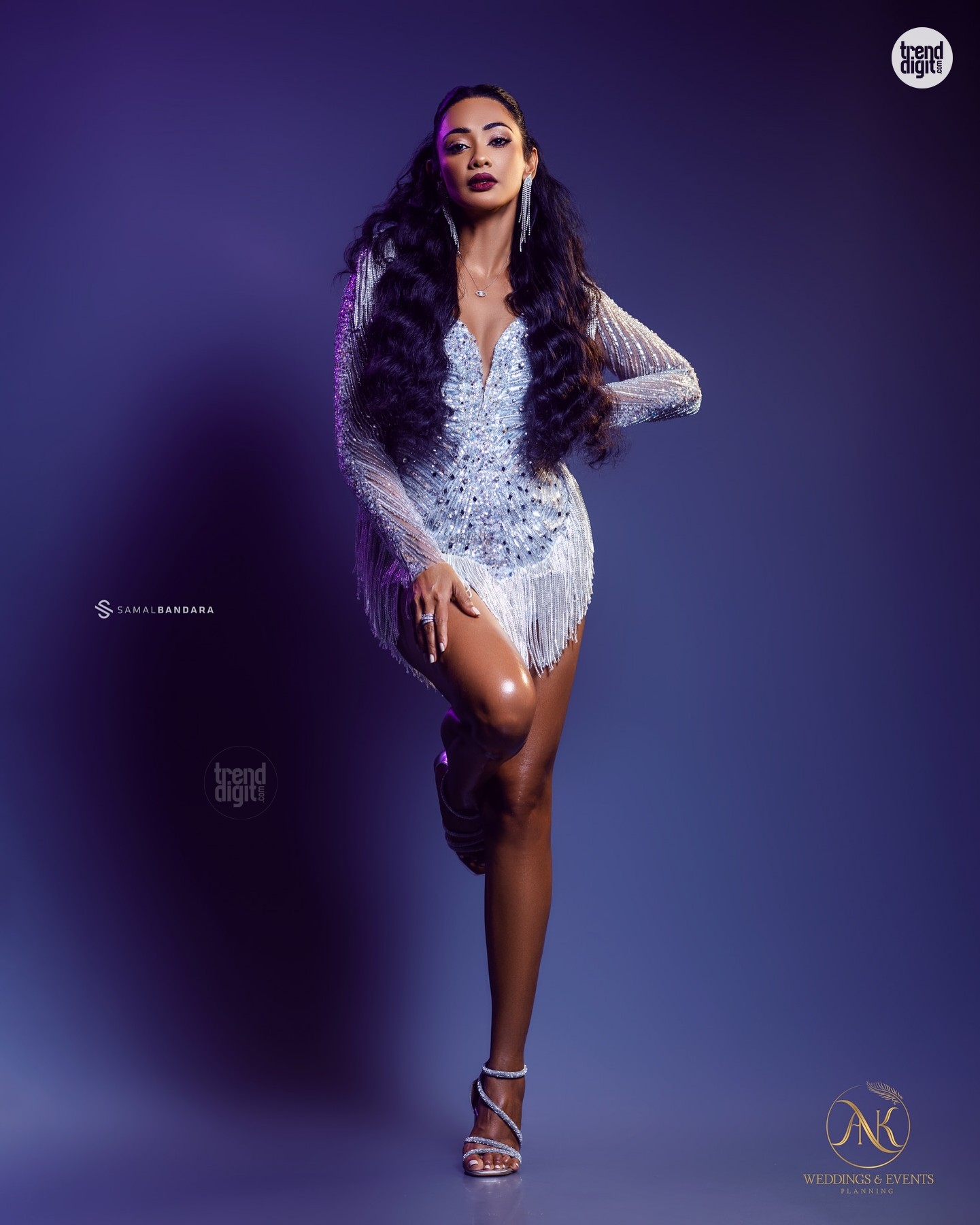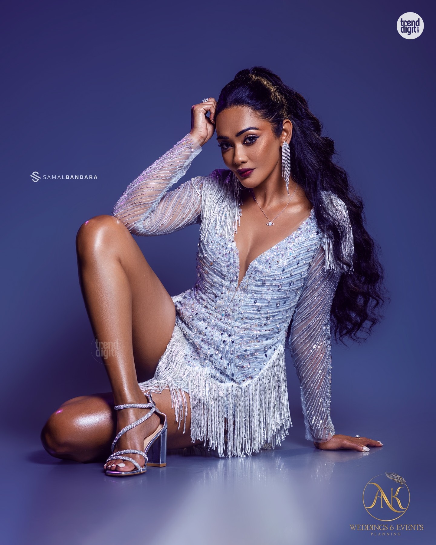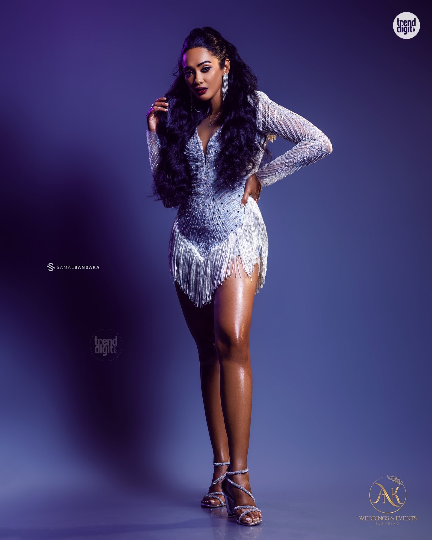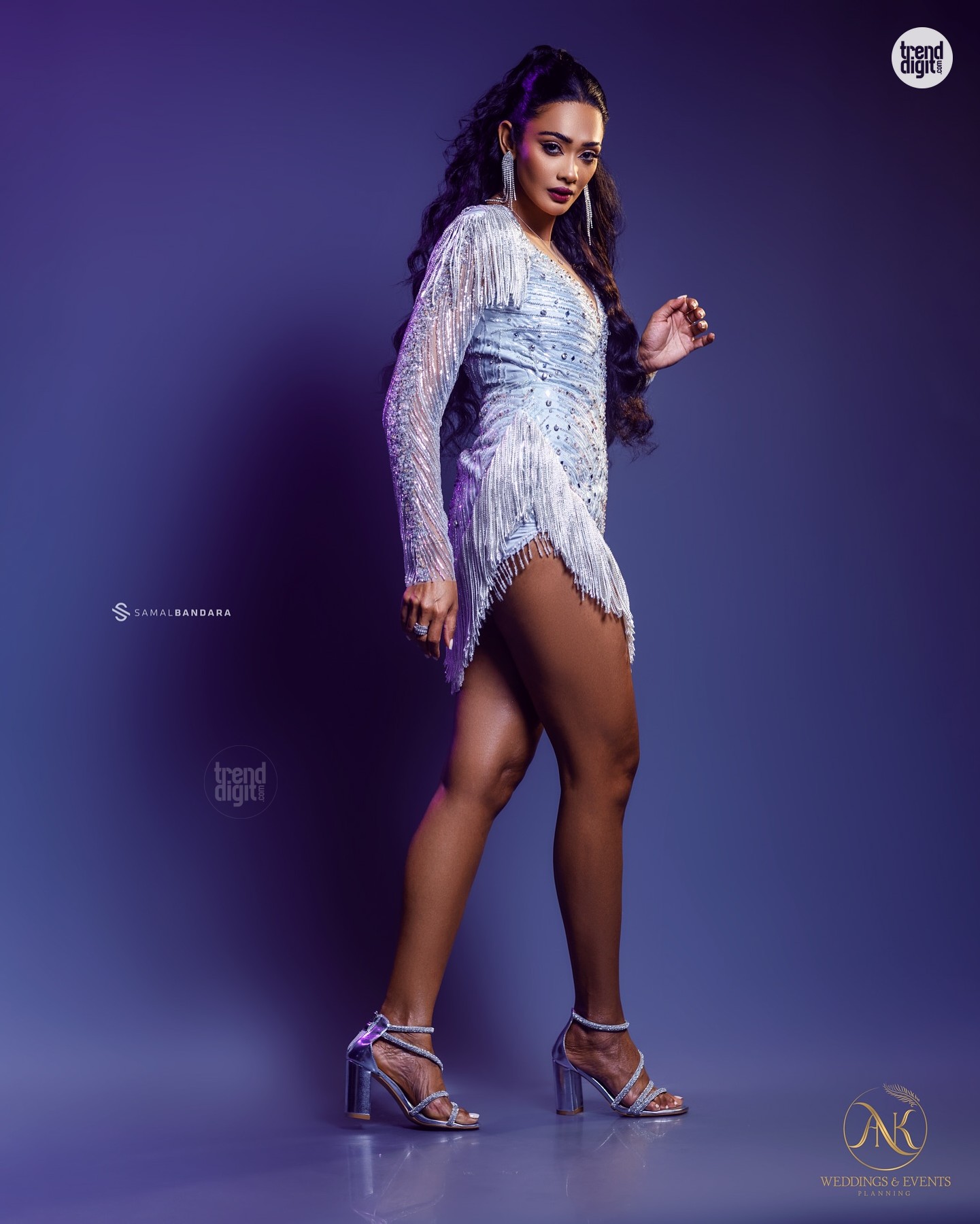 For this photoshoot, Yureni wears a dazzling silver embellished mini dress featuring intricate beadwork and fringe detailing. The long-sleeve design adds elegance while the shimmering fabric reflects the studio lights, creating a glamorous and sophisticated appearance.